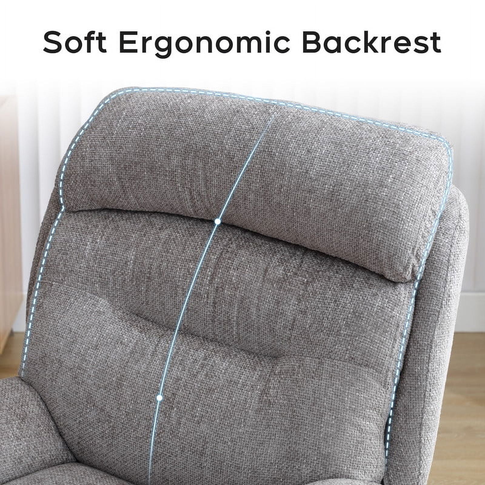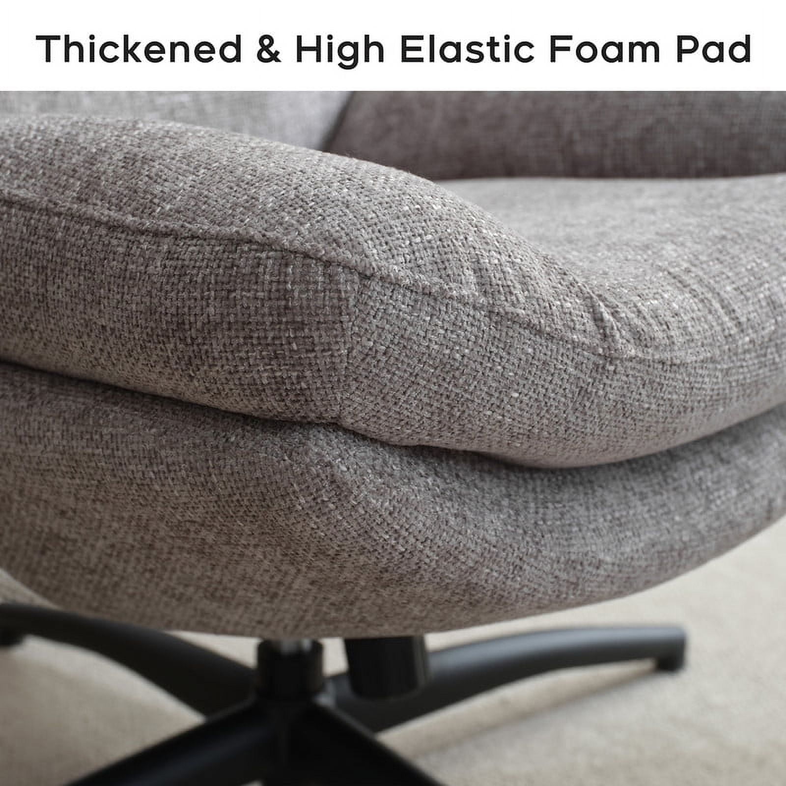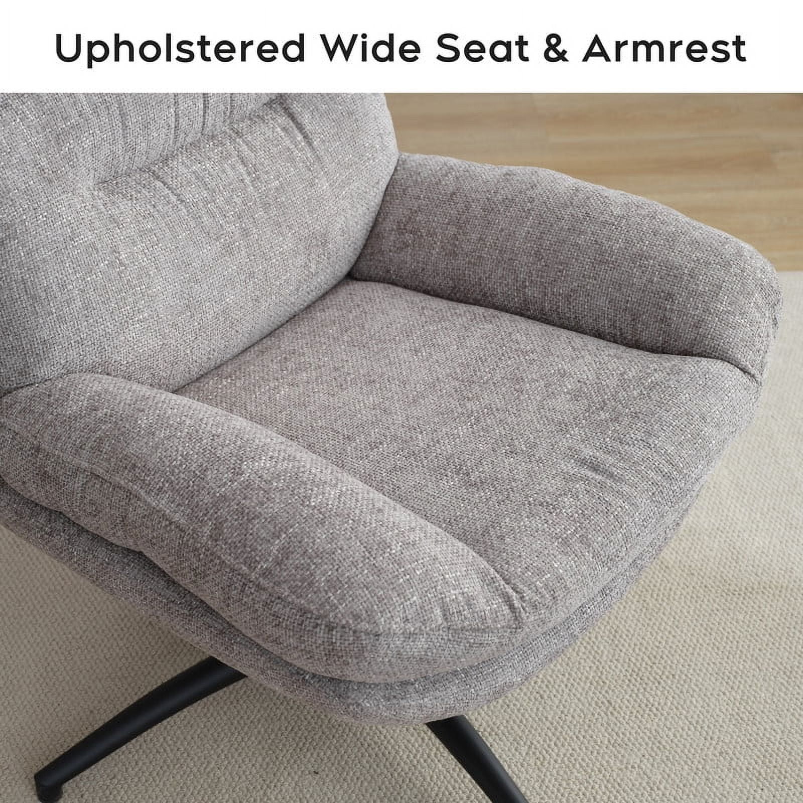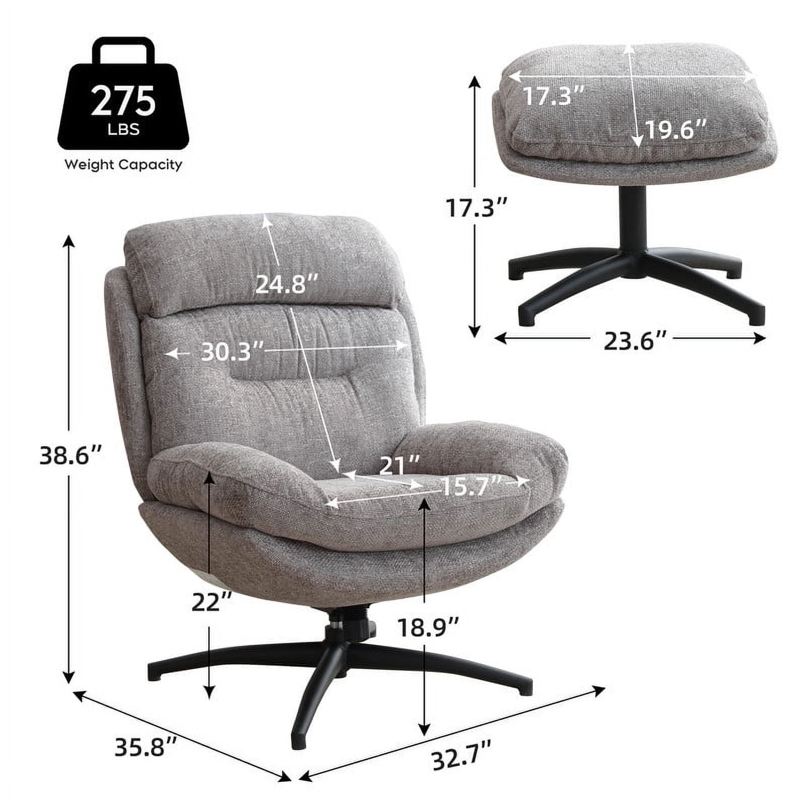 360-Degree Swivel: Allows full rotation for enhanced flexibility and accessibility. Adjustable Rocking Motion: Customize the rocking angle with the base knob, up to a 30-degree amplitude. High Back Design: 23-inch backrest provides ample support for the back and shoulders; seat height is 19 inches. Dimensions Chair measures 33*36*39 inches; ottoman measures 17.5*17.5*20 inches; total weight is 61 pounds. Stylish and Sturdy: Supports up to 275 pounds, with a modern design that fits any room. Ergonomic Comfort: Alleviates fatigue with an ergonomic design targeting the head, waist, and back areas. Premium Materials: Constructed with Chenille fabric, a metal base, engineered wood, and high-quality foam. Versatile Placement: Suitable for living rooms, offices, reception areas, or study rooms.