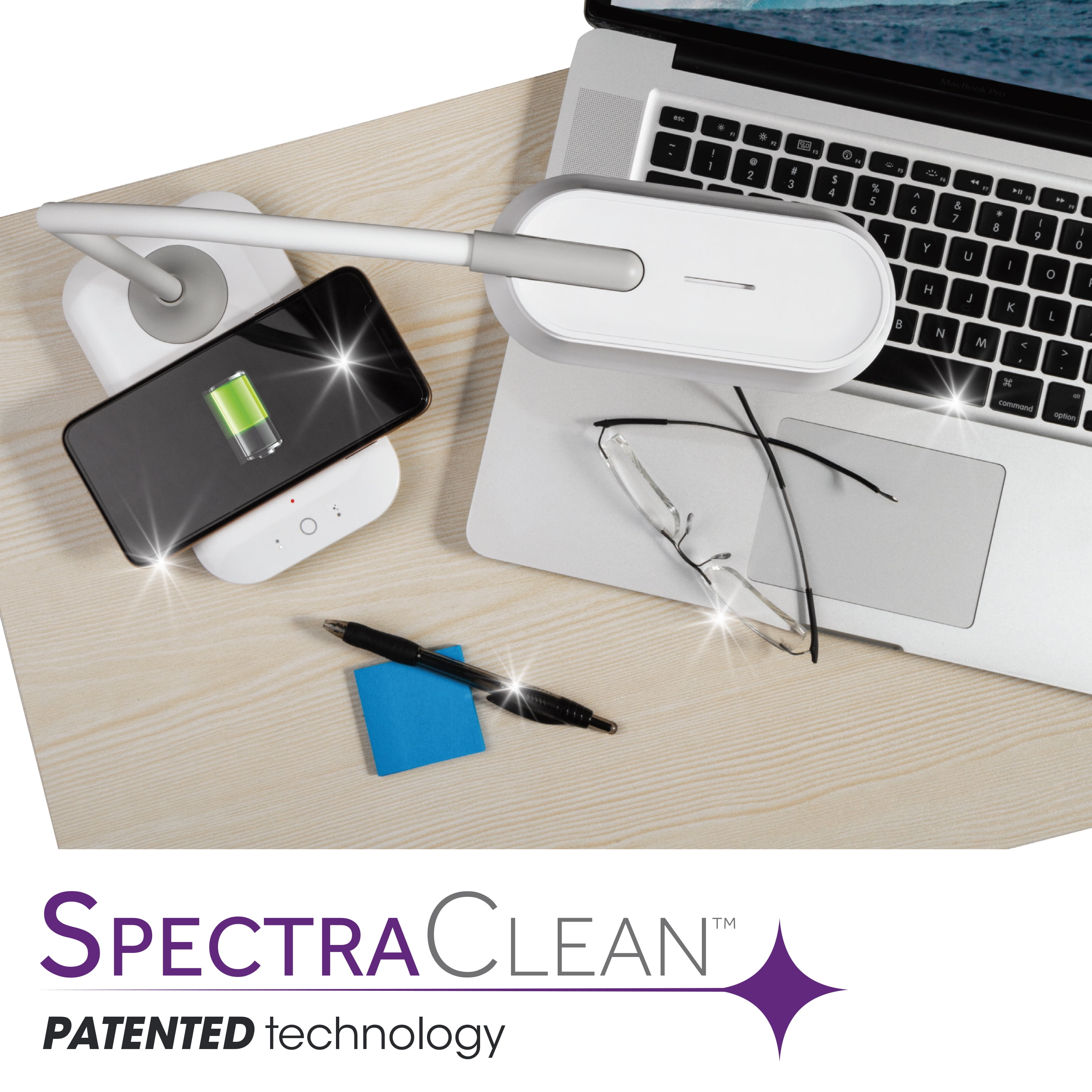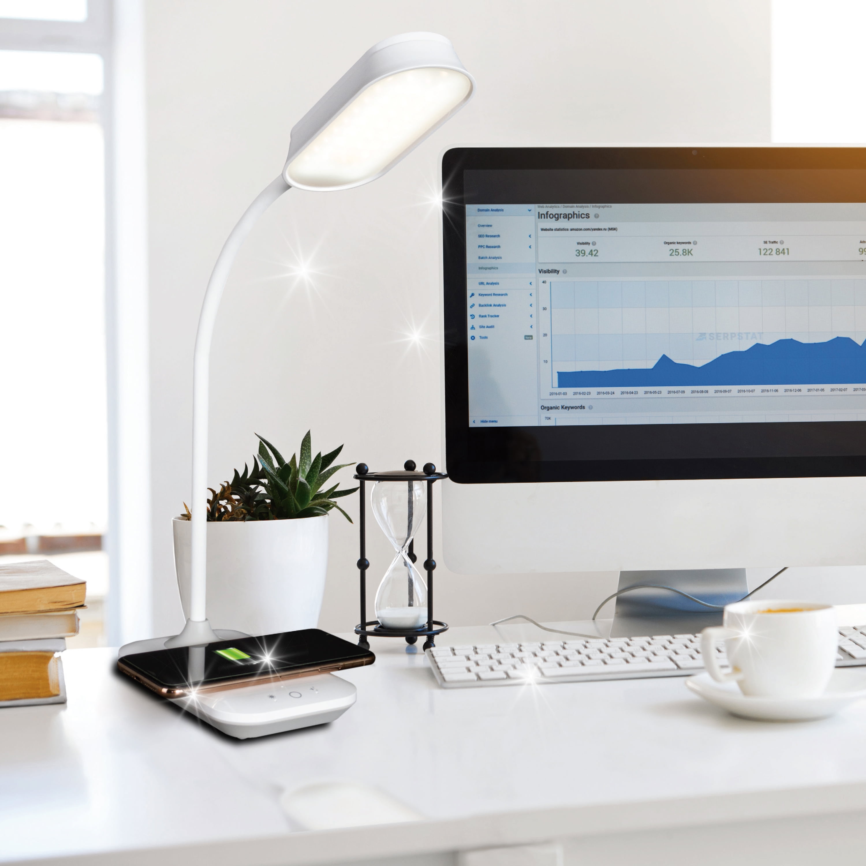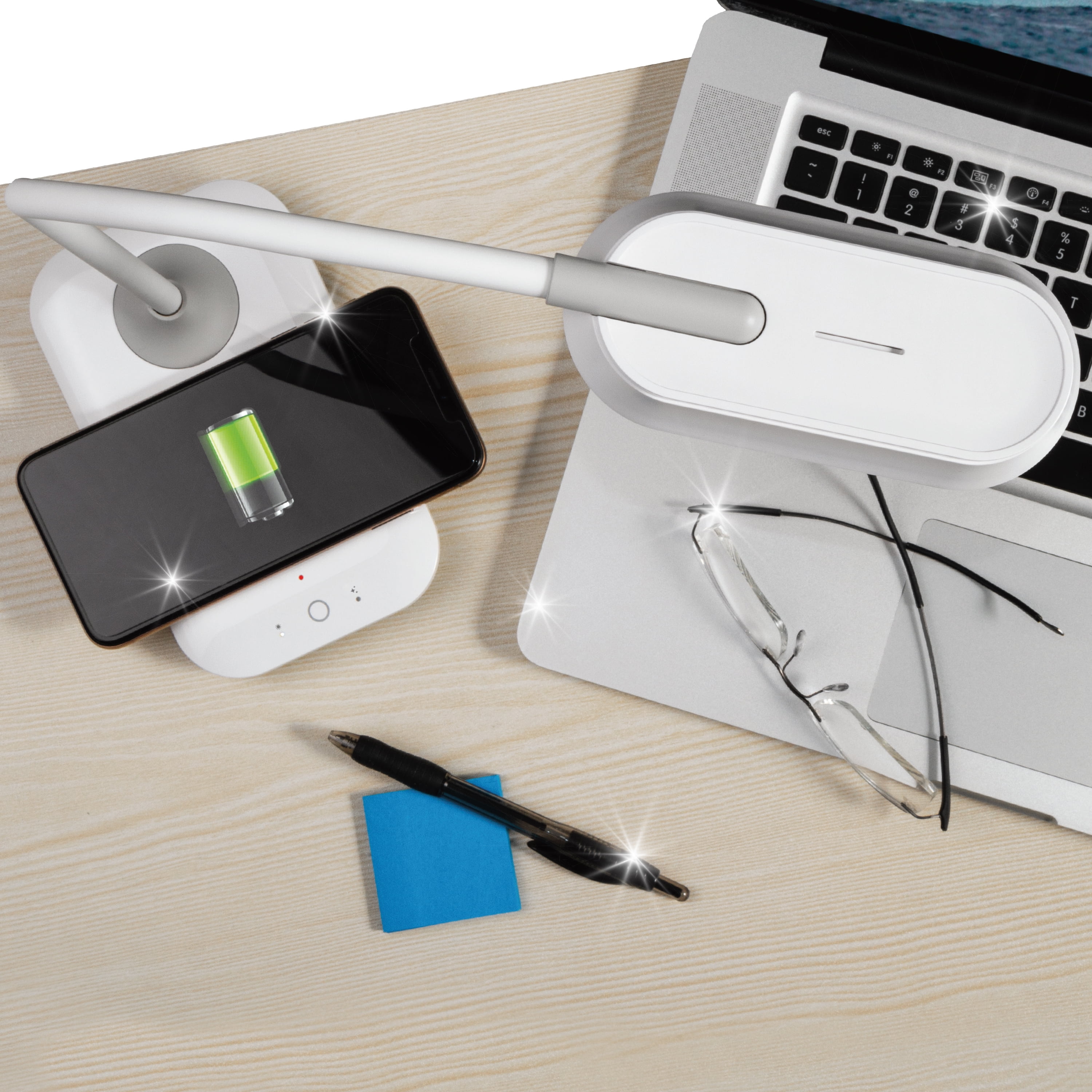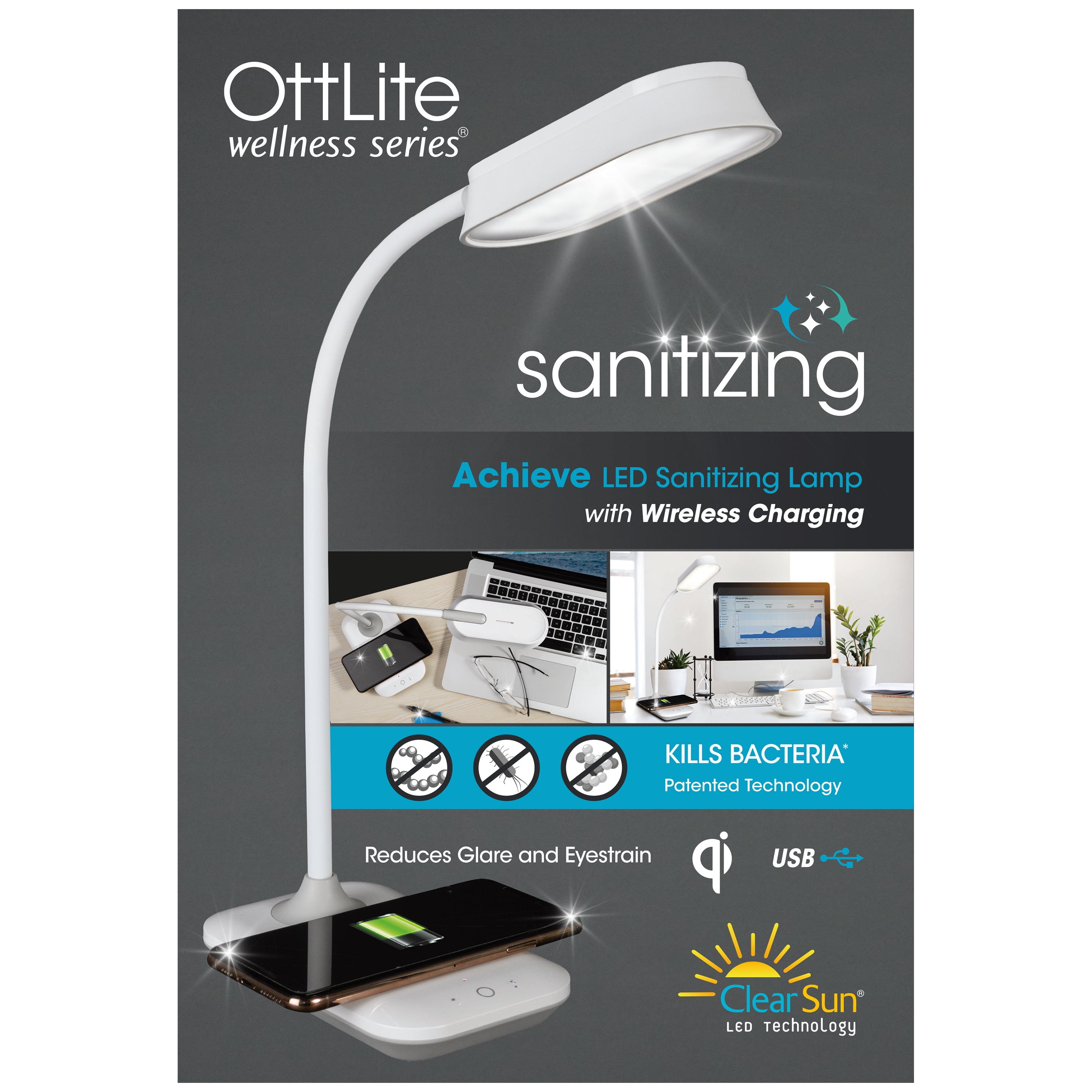 OttLite brings you the only desk lamps designed to break down harmful microorganisms. Now you can have proven sanitizing power right at your desktop with SpectraClean™ visible light disinfection. Using a precise formulation, SpectraClean’s patented technology has been shown to kill potentially harmful bacteria like those prevalent on mobile phones and desktops. Create a healthier workspace every time you turn on your light! The OttLite Achieve LED Sanitizing Desk Lamp also features the eyestrain-reducing power of ClearSun® LED technology – shown to reduce eyestrain by up to 51%. This exclusive low glare, high contrast illumination is as close to natural daylight as you can get and has a superior color rendering index of 95+. Customize your lighting experience with three brightness settings and choice of modes including ClearSun Only, ClearSun + SpectraClean, SpectraClean Only. Plus, keep your phone sanitized and charged with the Qi-wireless charging. 5V, 2.1A USB charging port also included for quickly charging mobile phones, tablets and other devices. This modern lamp adjusts from 11.75 to 21 inches and holds position with the long flexible neck.