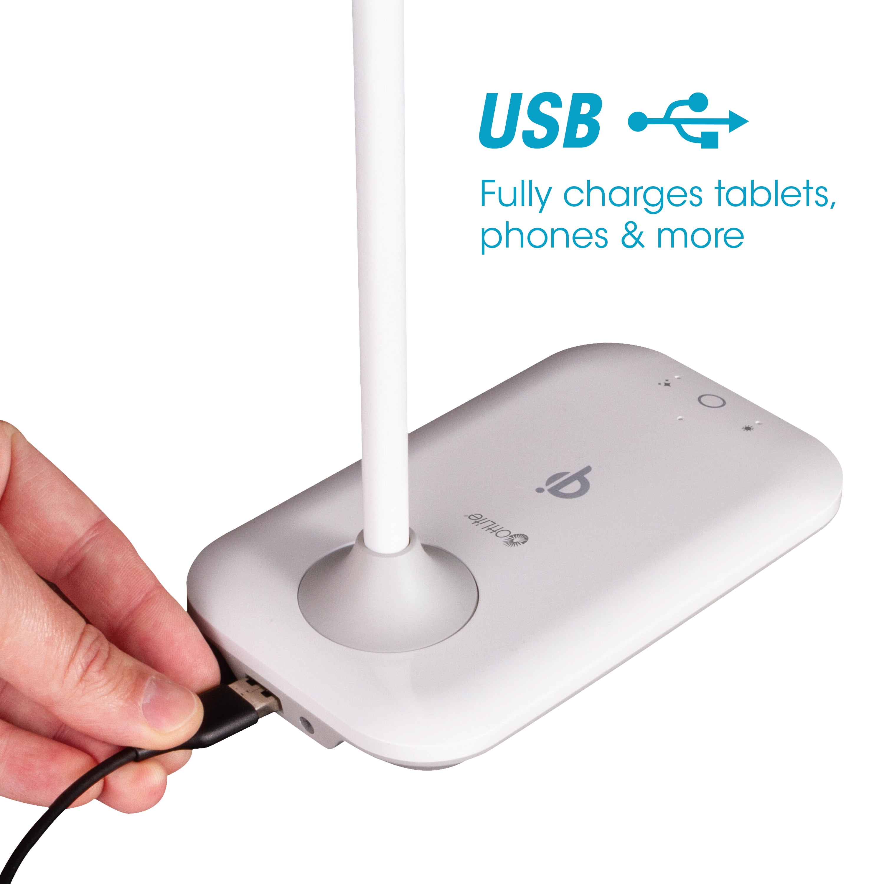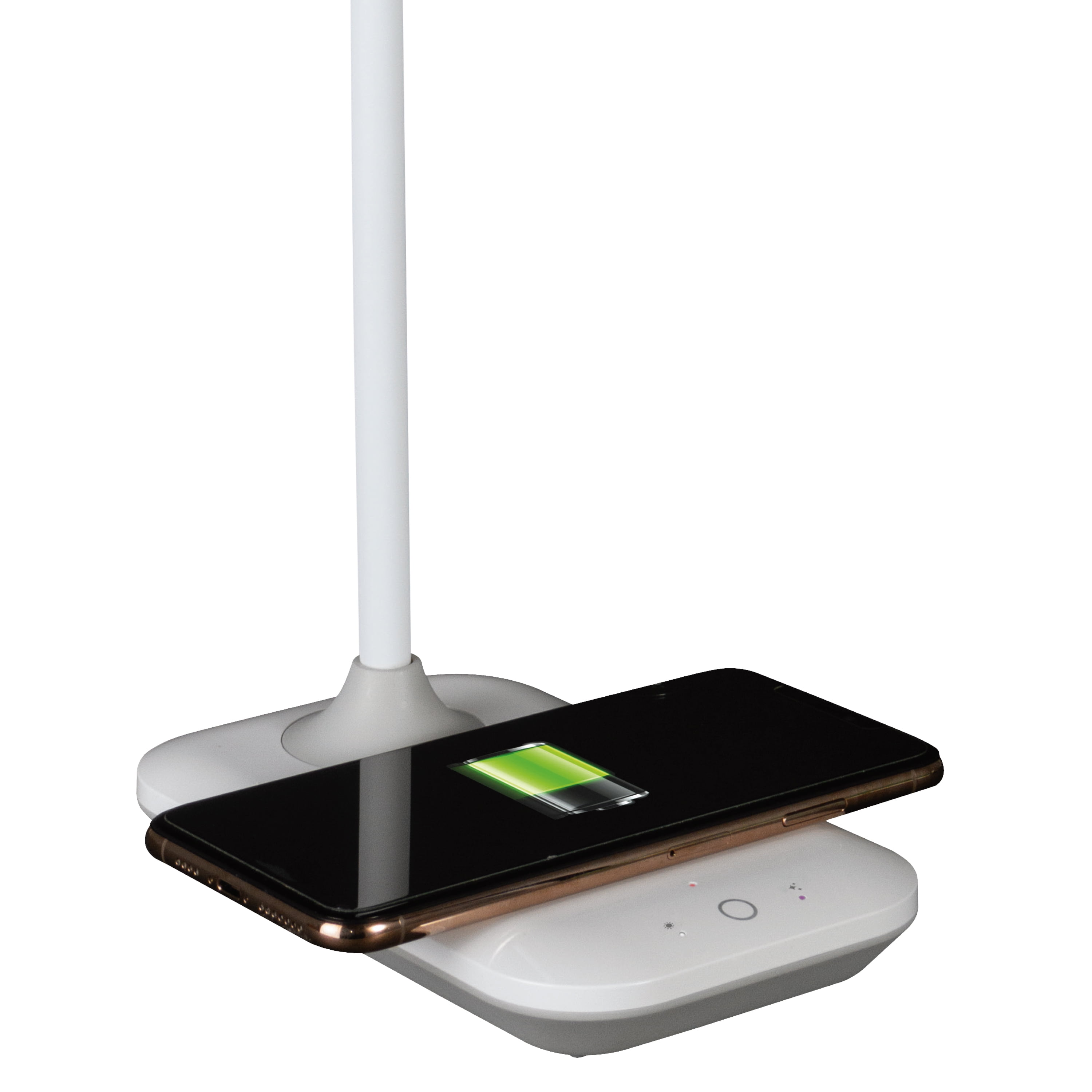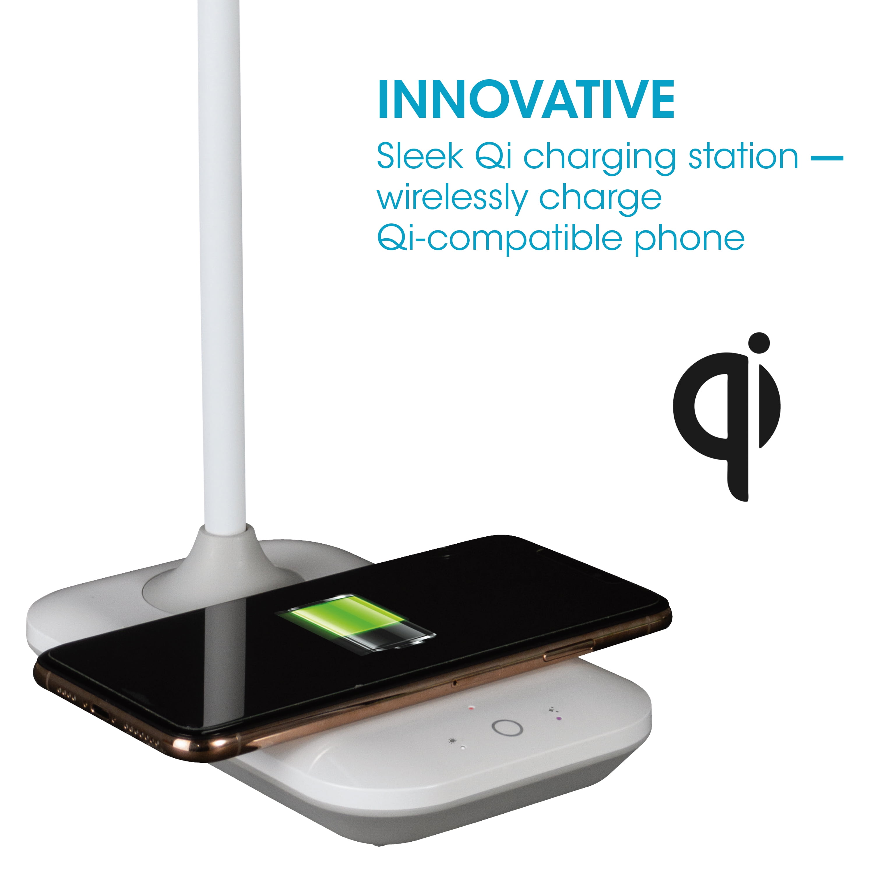 OttLite brings you the only desk lamps designed to break down harmful microorganisms. Now you can have proven sanitizing power right at your desktop with SpectraClean™ visible light disinfection. Using a precise formulation, SpectraClean’s patented technology has been shown to kill potentially harmful bacteria like those prevalent on mobile phones and desktops. Create a healthier workspace every time you turn on your light! The OttLite Achieve LED Sanitizing Desk Lamp also features the eyestrain-reducing power of ClearSun® LED technology – shown to reduce eyestrain by up to 51%. This exclusive low glare, high contrast illumination is as close to natural daylight as you can get and has a superior color rendering index of 95+. Customize your lighting experience with three brightness settings and choice of modes including ClearSun Only, ClearSun + SpectraClean, SpectraClean Only. Plus, keep your phone sanitized and charged with the Qi-wireless charging. 5V, 2.1A USB charging port also included for quickly charging mobile phones, tablets and other devices. This modern lamp adjusts from 11.75 to 21 inches and holds position with the long flexible neck.