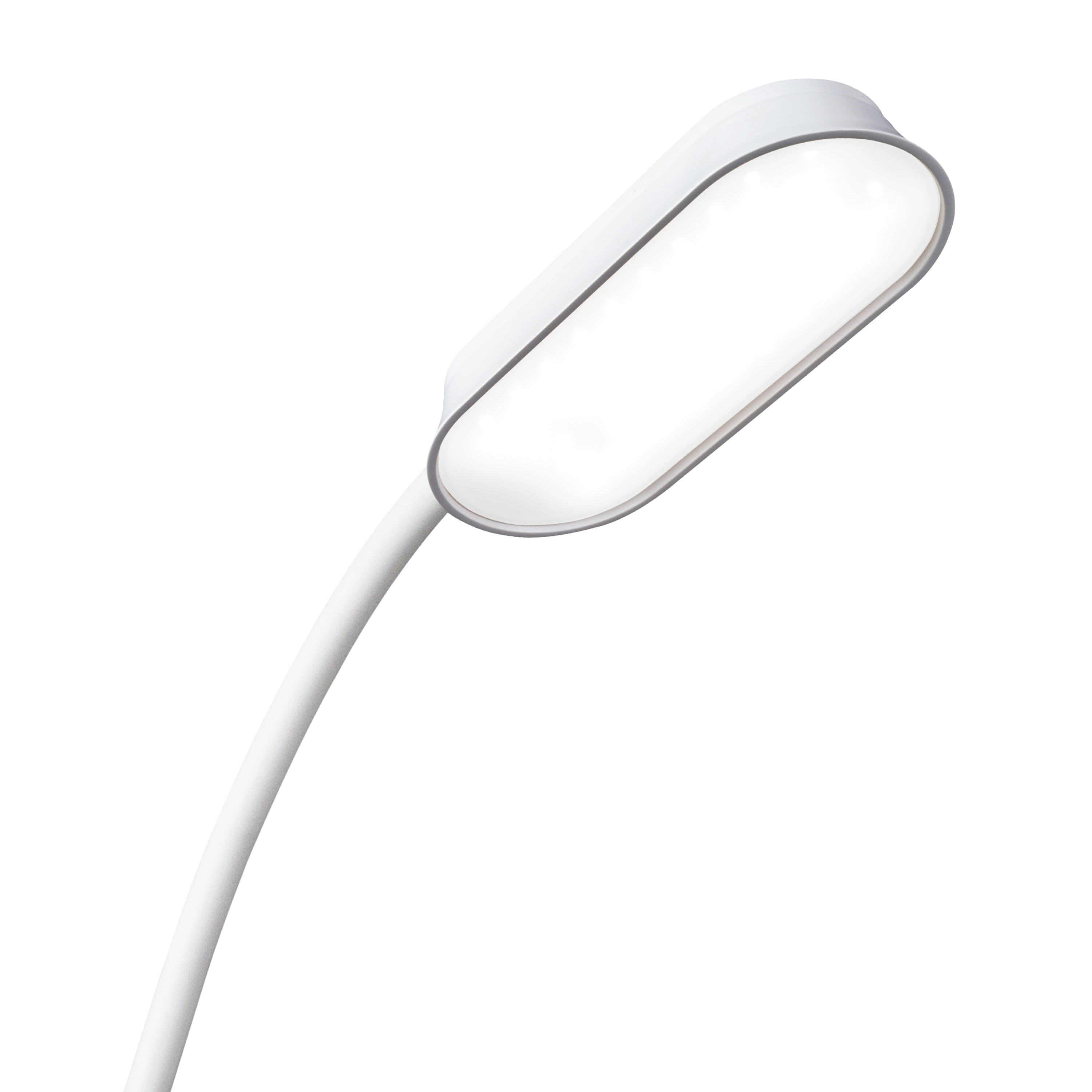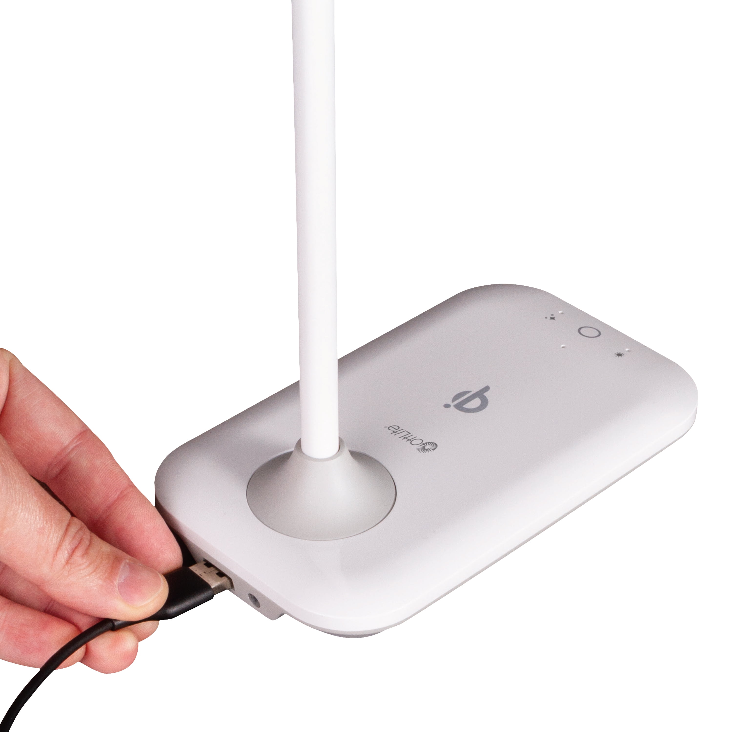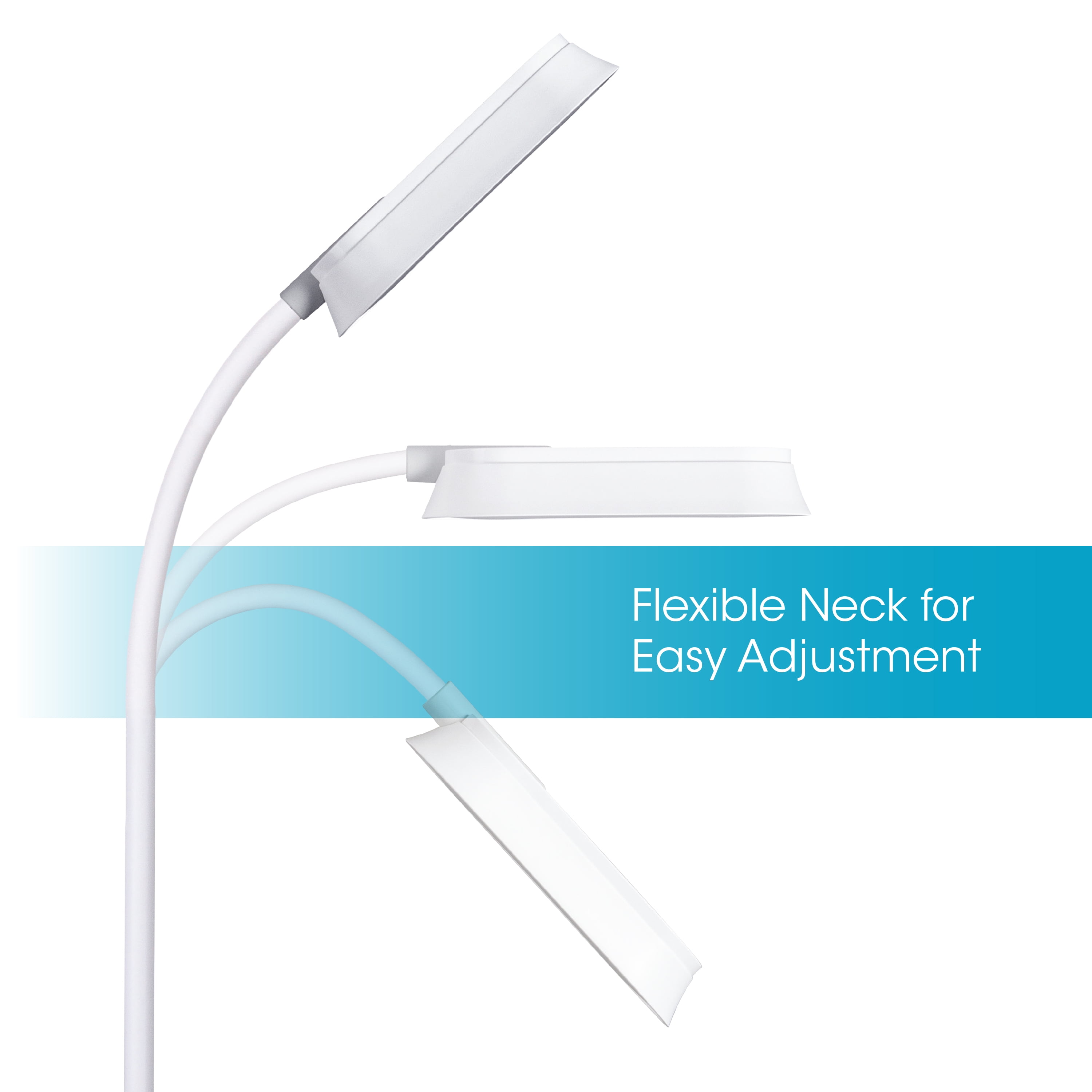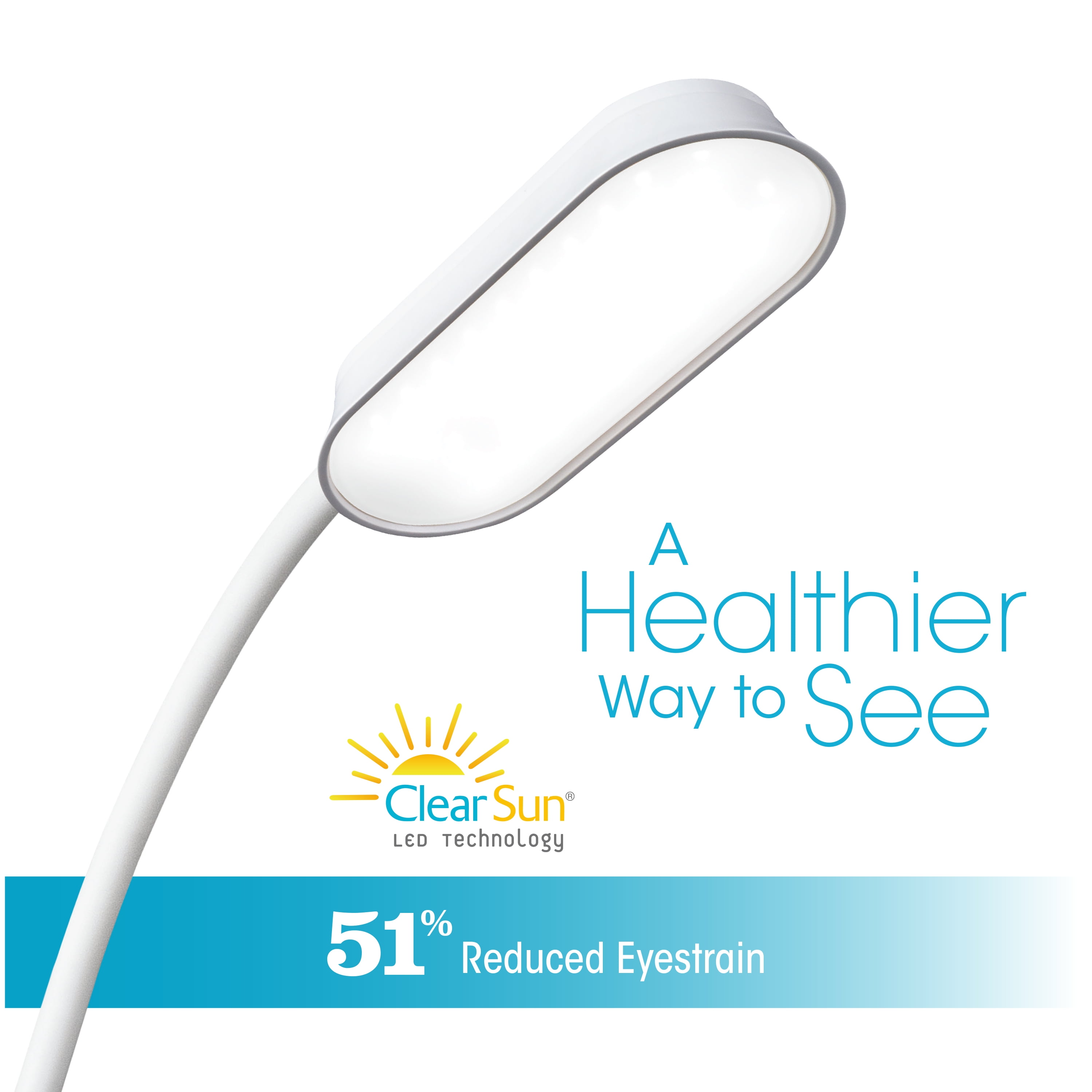 OttLite brings you the only desk lamps designed to break down harmful microorganisms. Now you can have proven sanitizing power right at your desktop with SpectraClean™ visible light disinfection. Using a precise formulation, SpectraClean’s patented technology has been shown to kill potentially harmful bacteria like those prevalent on mobile phones and desktops. Create a healthier workspace every time you turn on your light! The OttLite Achieve LED Sanitizing Desk Lamp also features the eyestrain-reducing power of ClearSun® LED technology – shown to reduce eyestrain by up to 51%. This exclusive low glare, high contrast illumination is as close to natural daylight as you can get and has a superior color rendering index of 95+. Customize your lighting experience with three brightness settings and choice of modes including ClearSun Only, ClearSun + SpectraClean, SpectraClean Only. Plus, keep your phone sanitized and charged with the Qi-wireless charging. 5V, 2.1A USB charging port also included for quickly charging mobile phones, tablets and other devices. This modern lamp adjusts from 11.75 to 21 inches and holds position with the long flexible neck.