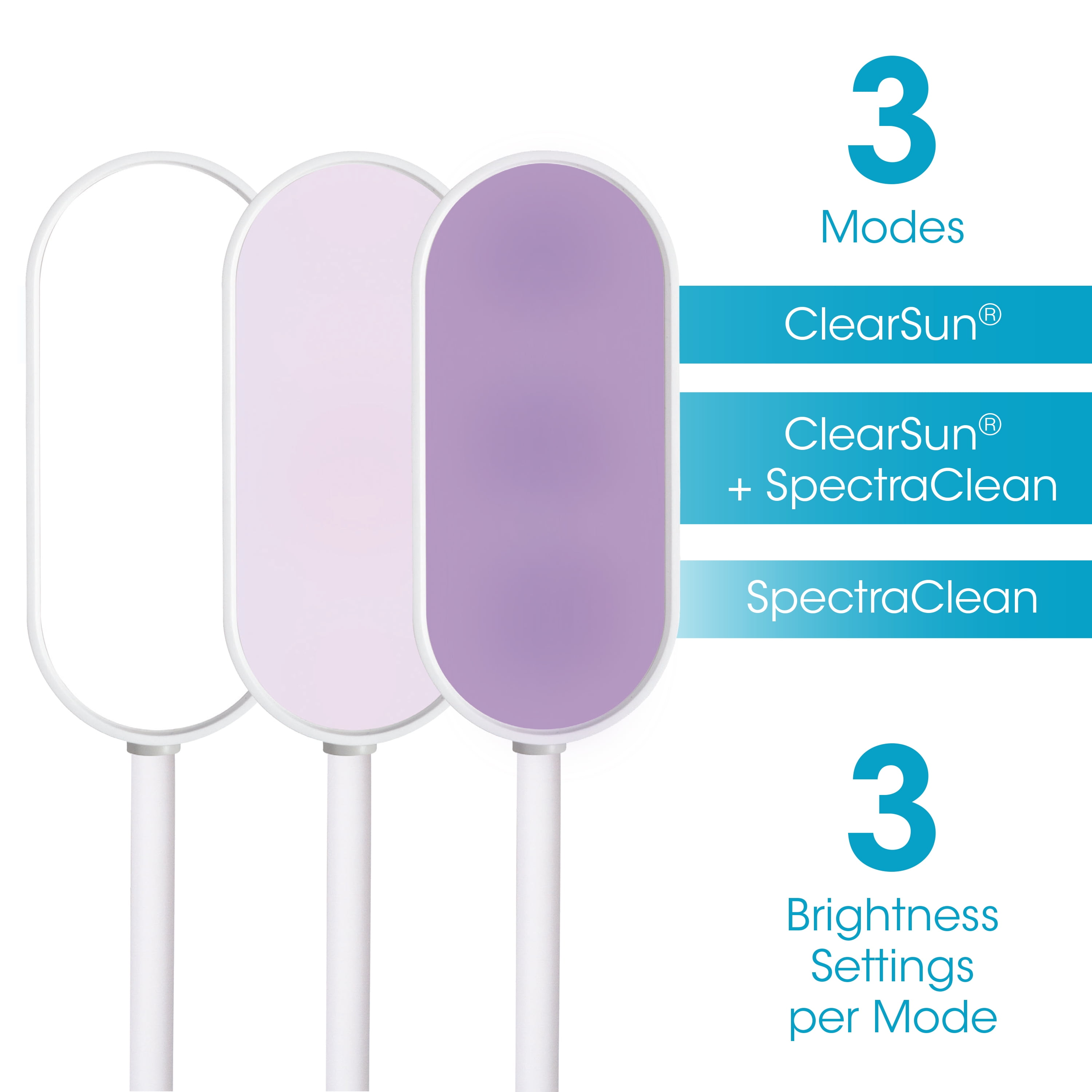 Exclusive to OttLite – the only desk lamp designed to break down harmful microorganisms at the cellular level (bacteria, fungus and mold) Patented SpectraClean™ Visible Light Disinfection technology proven to continuously clean and sanitize your space 3 modes – ClearSun Only, ClearSun + SpectraClean, SpectraClean Only Proprietary, exclusive OttLite ClearSun® LED technology – reduces eyestrain by 51% Charges Qi-compatible mobile phones wirelessly Includes 5V, 2.1A USB port to fully charge smart phones and tablets Touch controls with multiple brightness settings Height adjusts from 11.75 to 21 inches with flexible neck