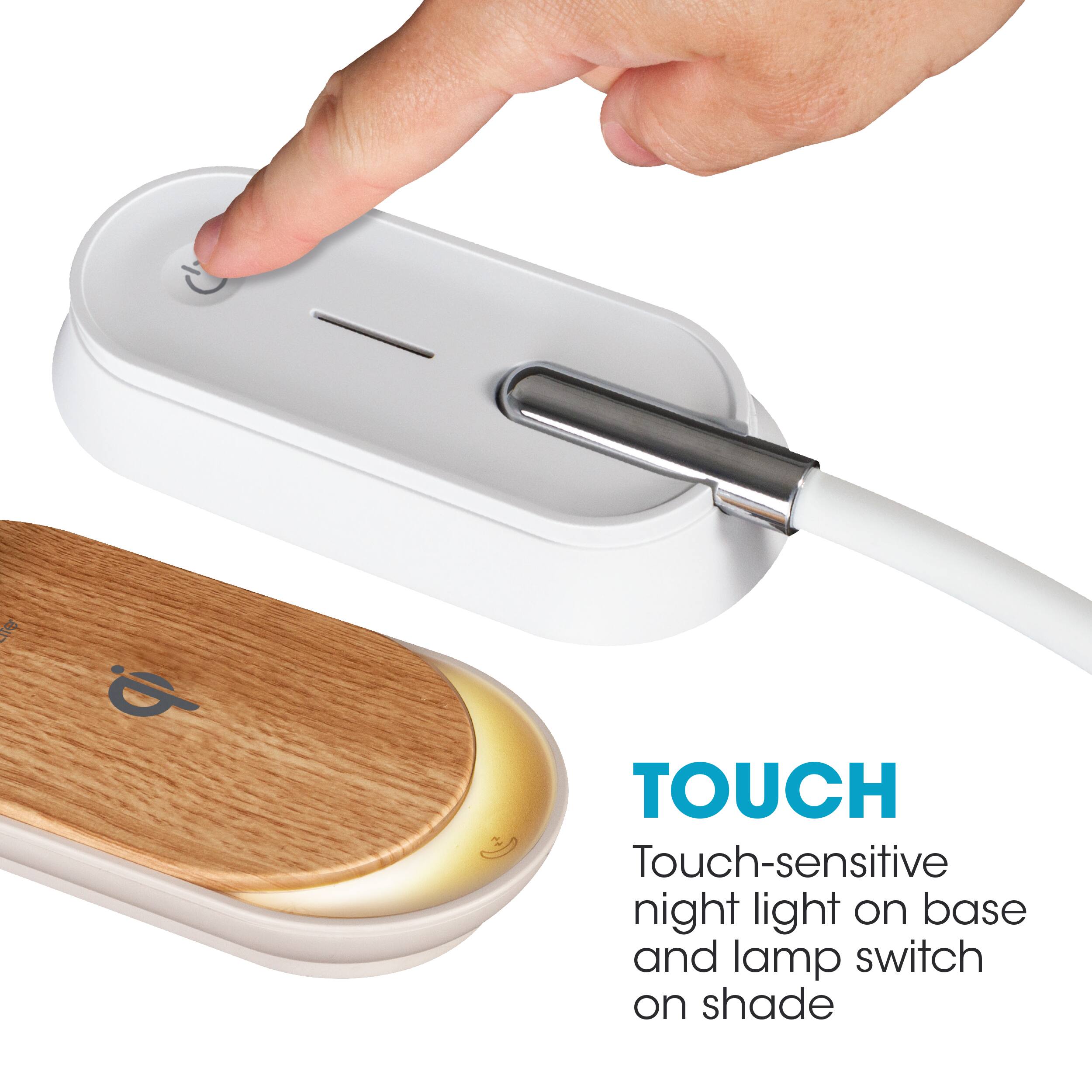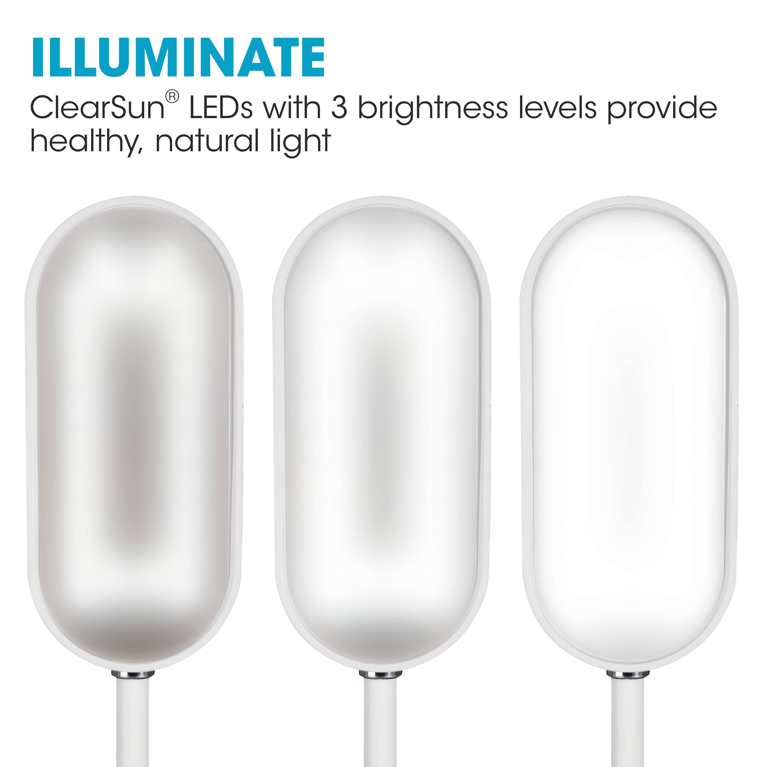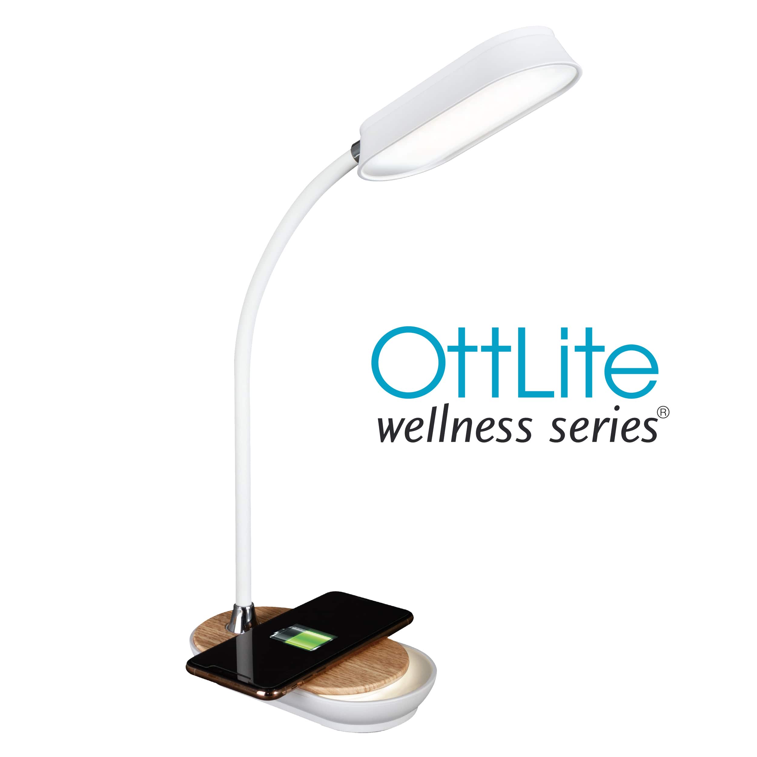 Create a healthier workspace with the OttLite Inspire LED Desk Lamp with Night Light Base. OttLite’s exclusive LED technology reduces eyestrain by up to 51% creating a more comfortable place for you to work, study, read and more! Plus, the night light base glows so you have a soft glow anytime you need it. With three brightness settings and a flexible neck, you can position the light wherever you need it. And, the convenient Qi Wireless Charging built in to the base allows you to charge your phone.