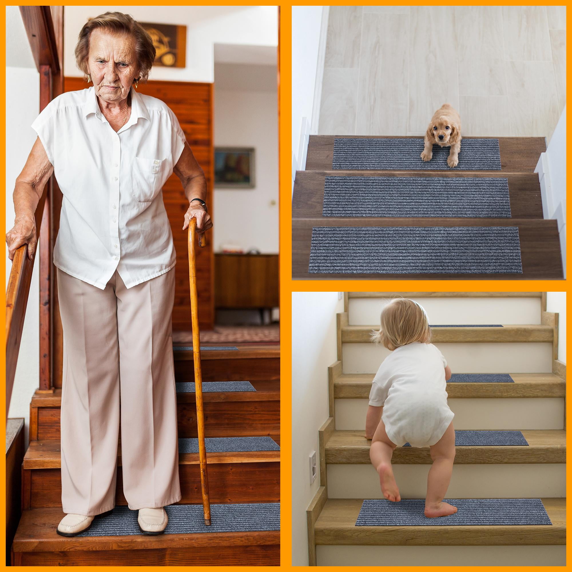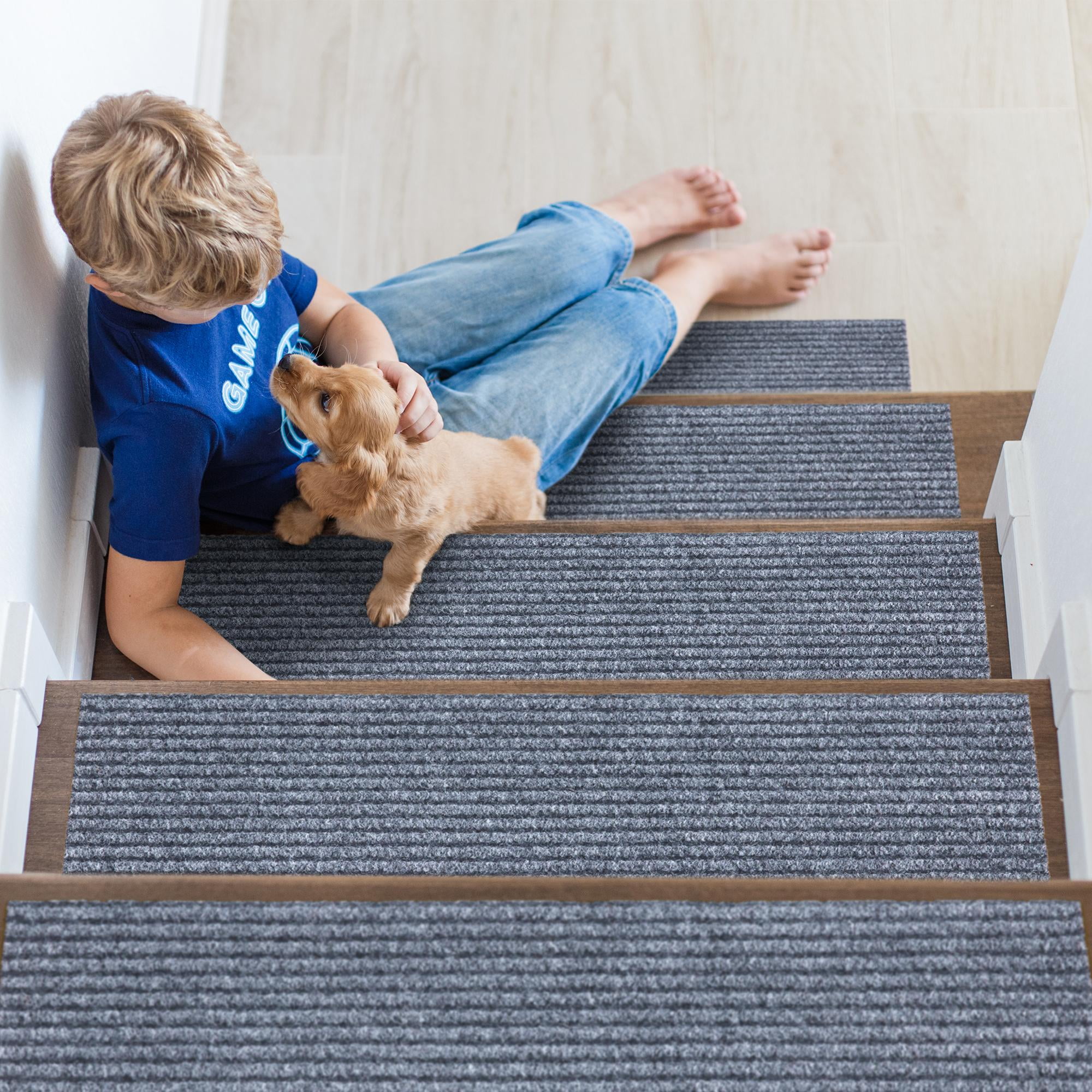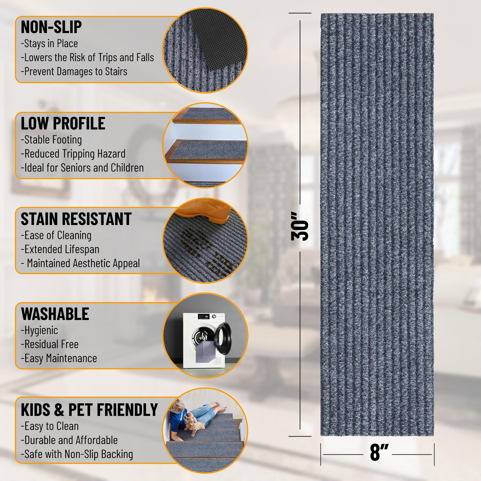 [KEY ATTRIBUTES]: Size: 14 Pack (8″ x 30″) | Thickness: 0.2 in. | Color: Gray [ULTRA THIN]: An ultra thin pile thickness of 0.2 inches offers ideal functionality that is perfect for your stairs. It provides a low profile so that it doesn’t give your stairs a bulky feel while also reduces tripping. [NONSLIP & STAIN RESISTANT]: Made in India with high quality and stain resistant Polyester material. The rubber backing minimizes slipping. To ensure comfort and additional grip please purchase double sided rug tape. [TRENDY STYLE]: These contemporary indoor and outdoor stair treads feature a solid ribbed design that will enlighten any room while also adding color and enhancing the look of your home. Its timeless design can be integrated into a variety of home décor styles. [KID & PET FRIENDLY]: Safe for everyday high foot traffic areas and more resistant to life’s unpredictable messes from kid or pet activity. [EASY CARE]: Stress free cleaning includes regular vacuuming (no brushes/rollers) and gently spot cleaning out minor stains with mild detergent or carpet cleaner. Creases and curling should flatten with 5-7 days of regular use. Hose washing is also applicable, simply wash down with a hose and leave to dry! To expedite this process, reverse roll the corner with the crease and gently apply pressure. [RECOMMENDED USE]: These stair treads will add the finishing touches to your basement steps, front steps, back steps, deck, and outdoor steps. [TRUSTED BRAND]: Quality rugs made for over 20 years. Founded with the aspiration to embellish indoor and outdoor spaces. Ottomanson aspires to provide trendy rugs while always meeting customer needs.