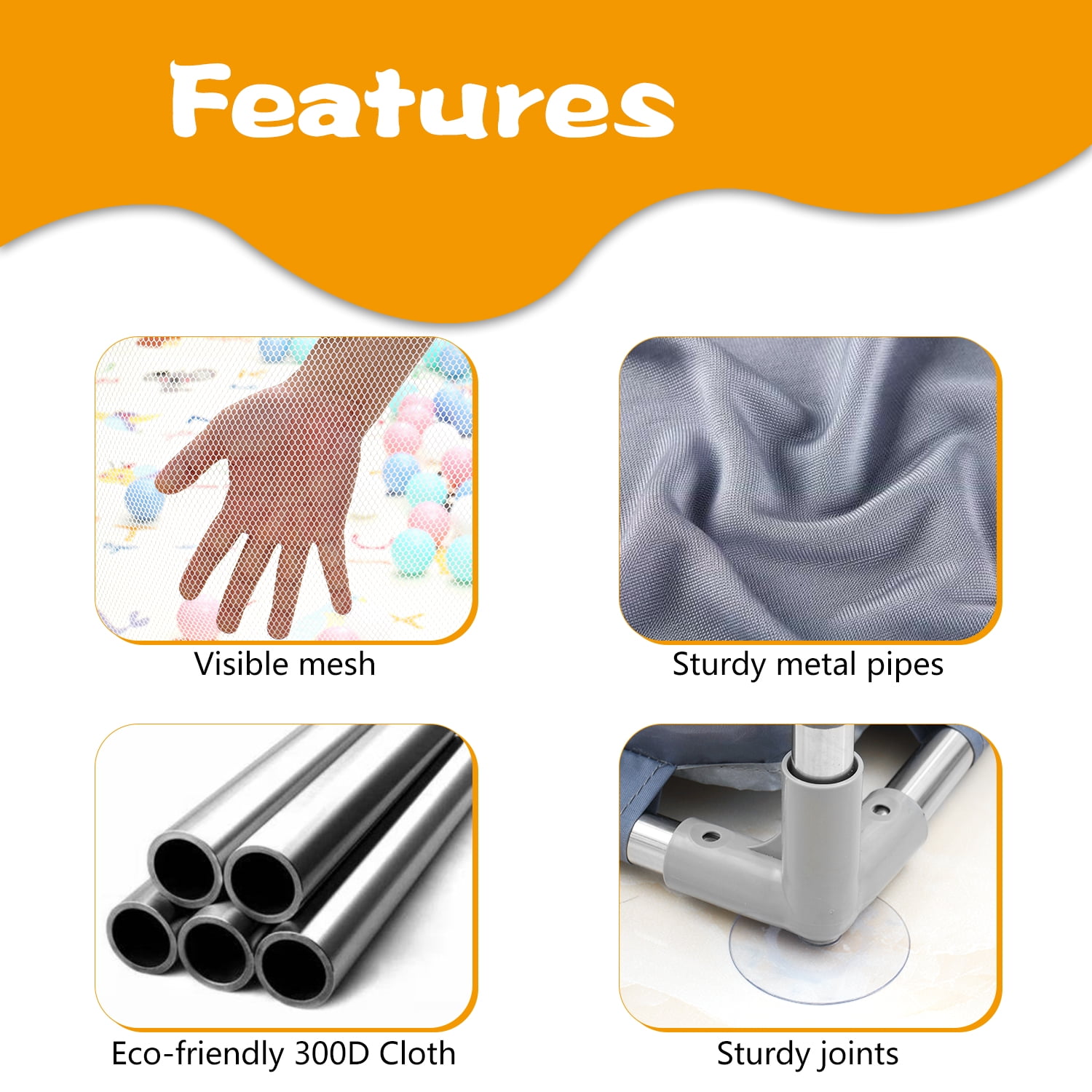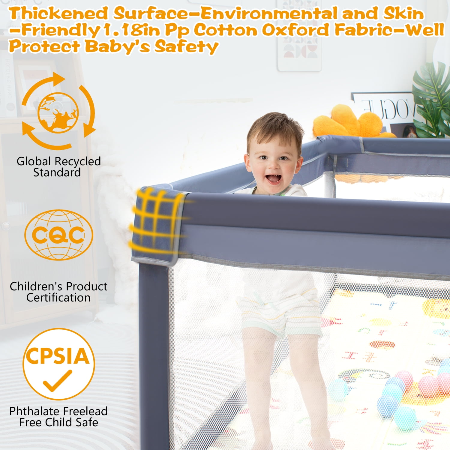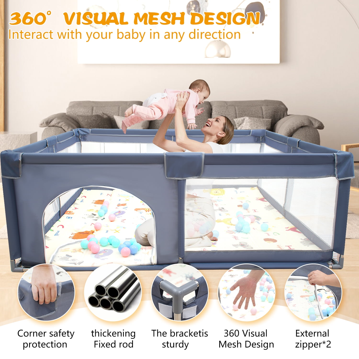 【FREE PARENT’S HANDS】With the help of large baby playpen, you can turns it into a great safe playgrounds for babies! Help kids explore the world of perception, play and learn to move in their own, and keep it away from being lost or exposing to hazard areas as well. The parents can free their hands to do their own things but still keep an eye on babies. 【360° FULL VISION DESIGN】Baby playpen has visible soft breathable mesh in the side panels. See-through mesh that allows to you sees the baby, and the baby sees you, make them feel comfort and safe. The external gate zipper design, allow to interact with your baby at any time, give your baby a sense of security. 【SAFE SEAMLESS BABY PLAY PEN】 It is made of wear-resistant, tear-resistant oxford fabric and strong steel pipe. There are 4 sturdy safety non-slip suction cups on the bottom, which are difficult to move or tip over. A thicker sponge has been added to prevent children from being hit while playing. At the same time, our fence is entirely wrapped in soft cloth, there is no exposed gap, there is no danger of pinching, and it is safer than plastic baby playpen. 【EASY TO ASSEMBLE, STORE & CLEAN】 The extra large baby playpen pipes are made of rust-proof alloy pipes and ABS joints connection, easy to disassemble and assemble. With a storage bag, easy to store and carry. The bottom is made of wear-resistant, tear-resistant, non-slip, breathable, quick-drying, fabric. Only need to wipe with wet cloth and soap to clean.
