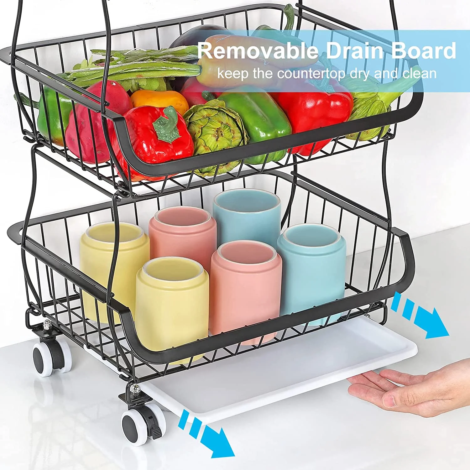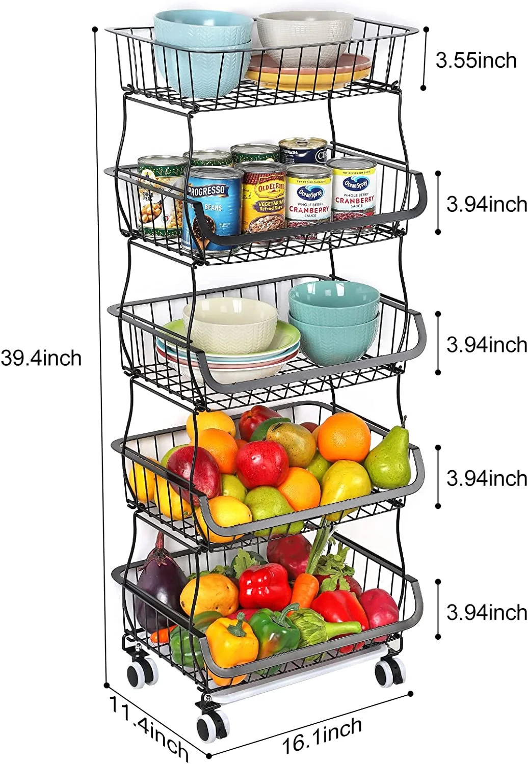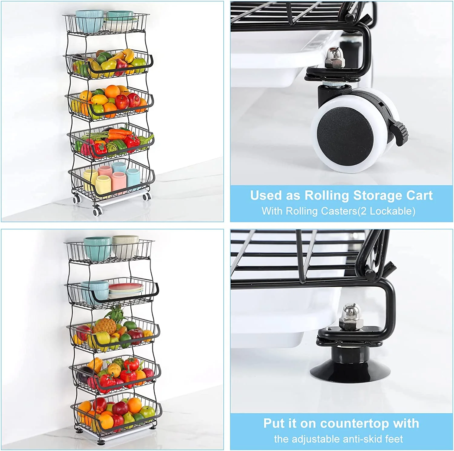 With a 5-tier compact design, you can use the four baskets individually or as a complete set of shelves for storage space or storage of fruits and vegetables. This vegetable basket can help you to save tons of space and time by making it easier to access various things and supplies around the kitchen. The large capacity of the fruit storage basket could be used as kitchen cart basket for vegetable, fruit, snacks or other small items. Comes with 4 heavy duty wheels, 2 of which are lockable, so that you can move the cart around with ease to wherever you need. The bottom tier shelf features a removable drain board that will collect water drainage, making it the perfect shelf for freshly washed fruit and vegetables.