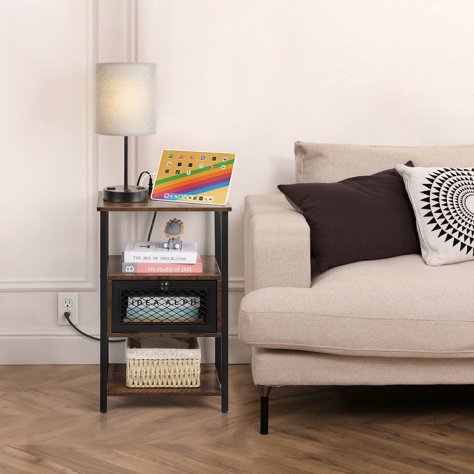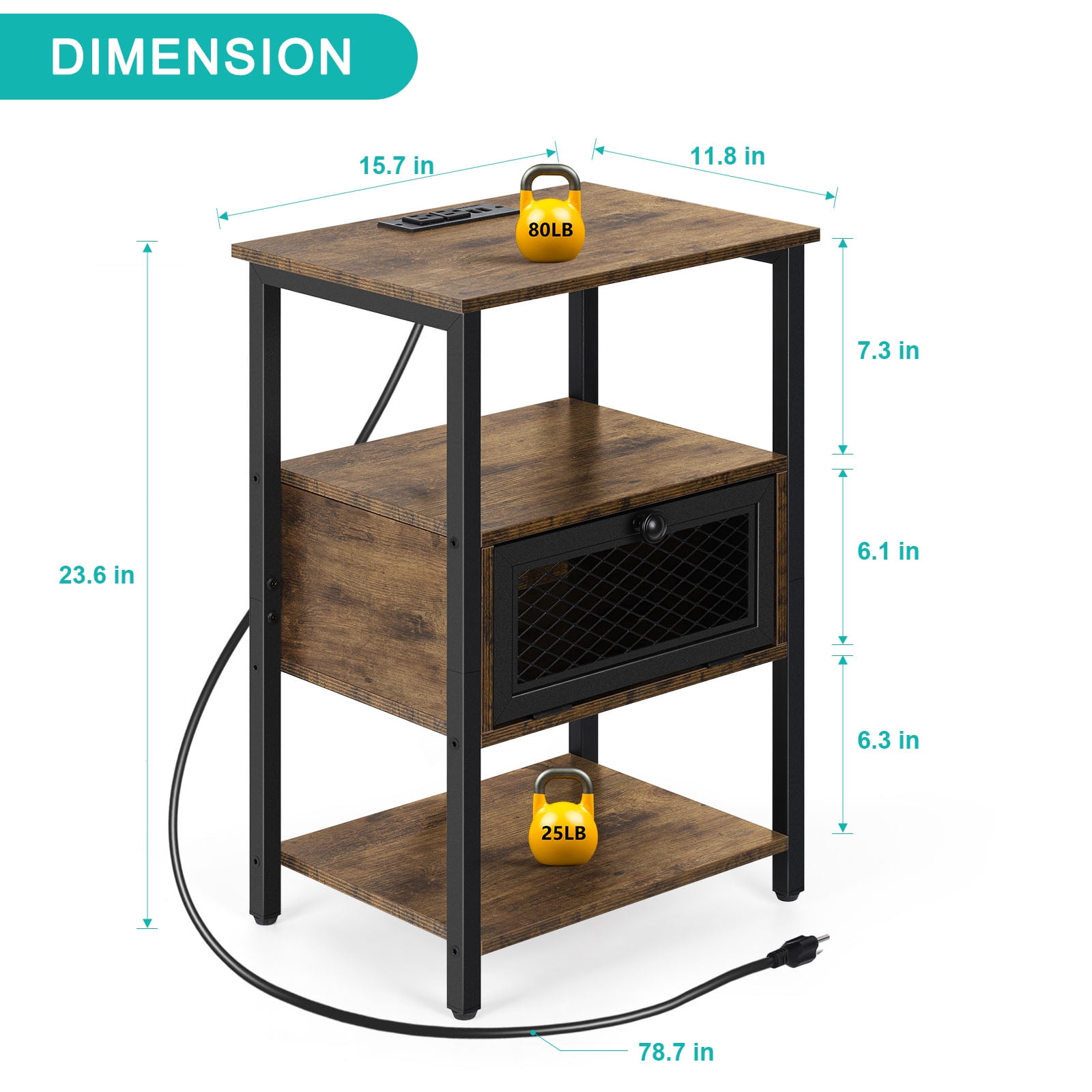 Oumilen Rustic Nightstand with Charging Station, Brown Simple and stylish with a charming vintage look and compact design, ideal for bedside or sofa side use without occupying too much space Equipped with 2 outlets and 2 USB ports for ample charging space, along with a 6.6ft (78.7in) long power cord Includes a flip-top drawer and two open dividers for organizing items like table lamps and books, suitable for living rooms, guest rooms, kitchens, and offices Constructed from sturdy metal and MDF wood veneer, with a tabletop capacity of up to 80lbs and drawers/dividers supporting up to 25lbs Parts are clearly labeled with detailed installation instructions for quick and hassle-free assembly