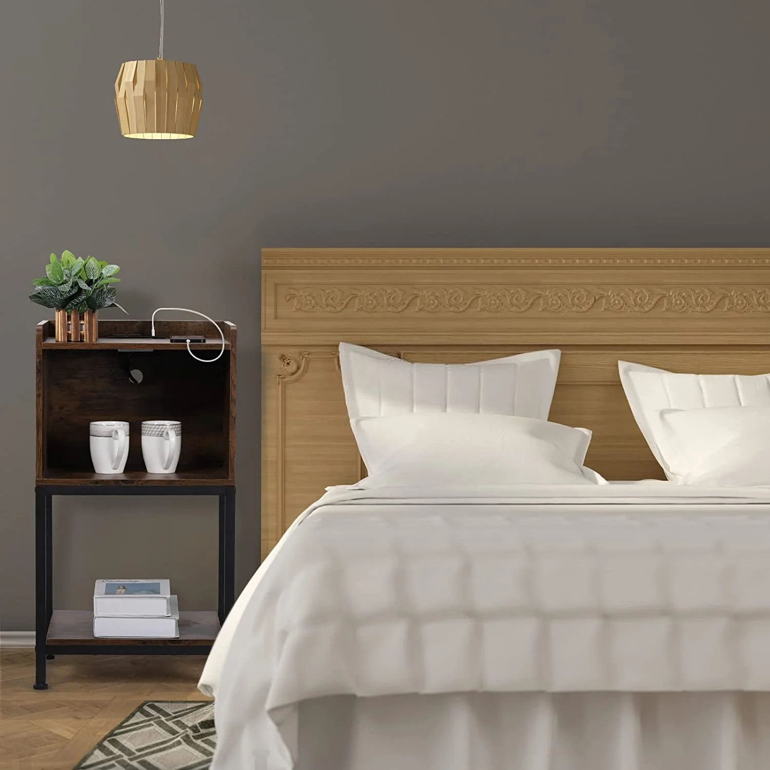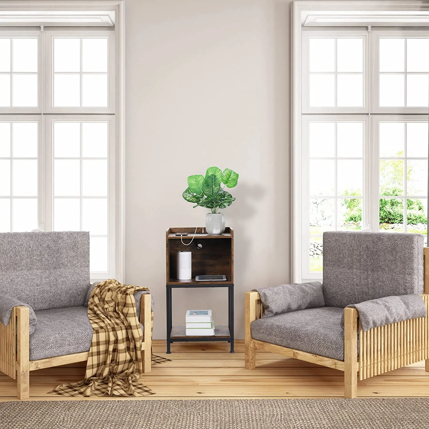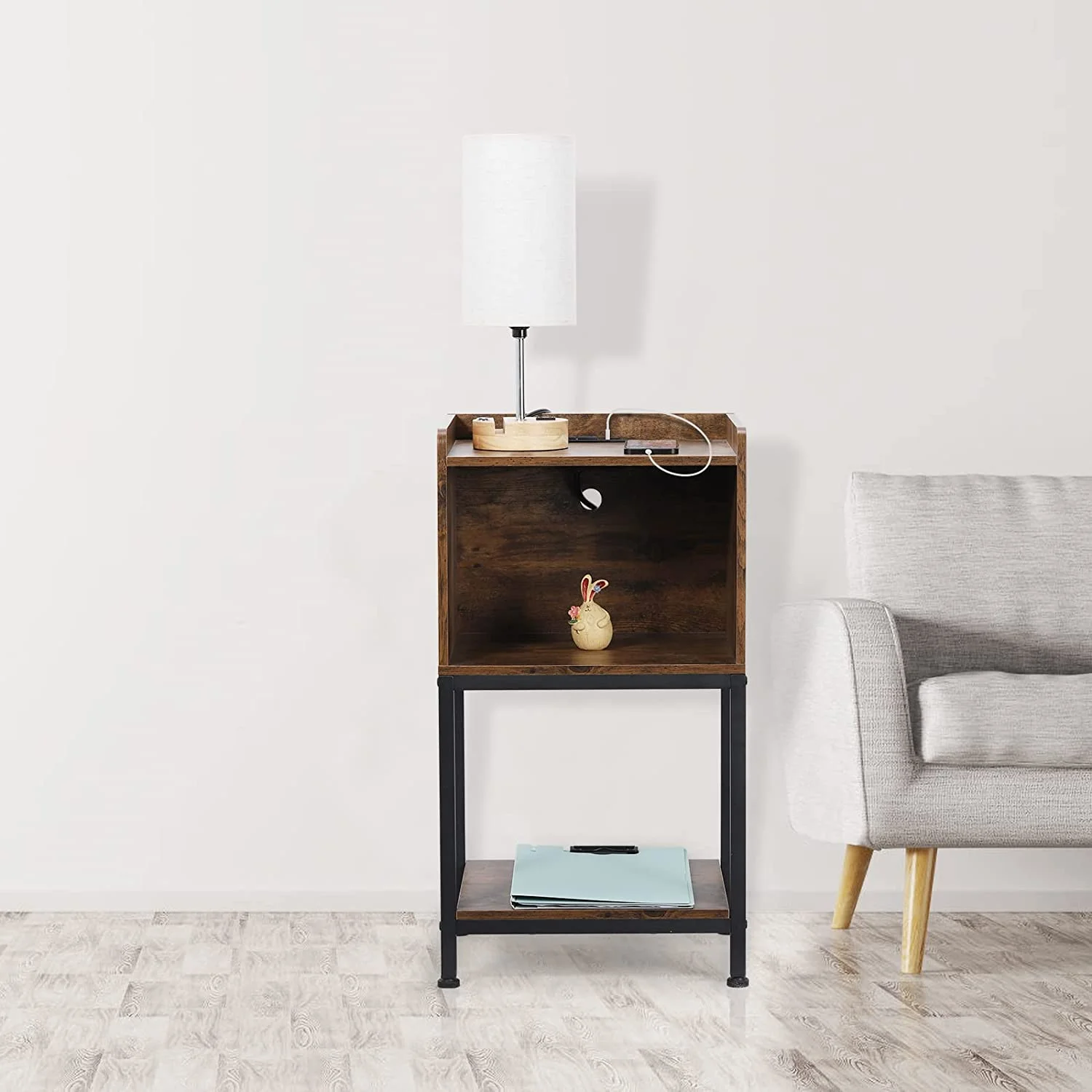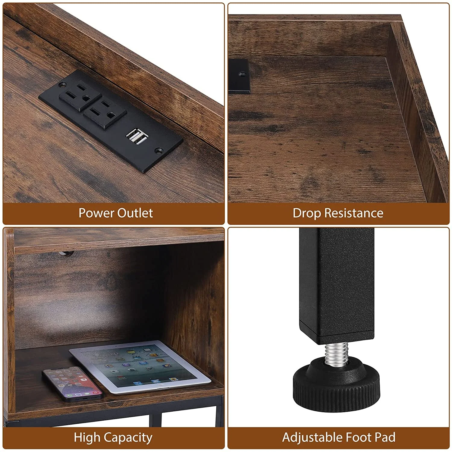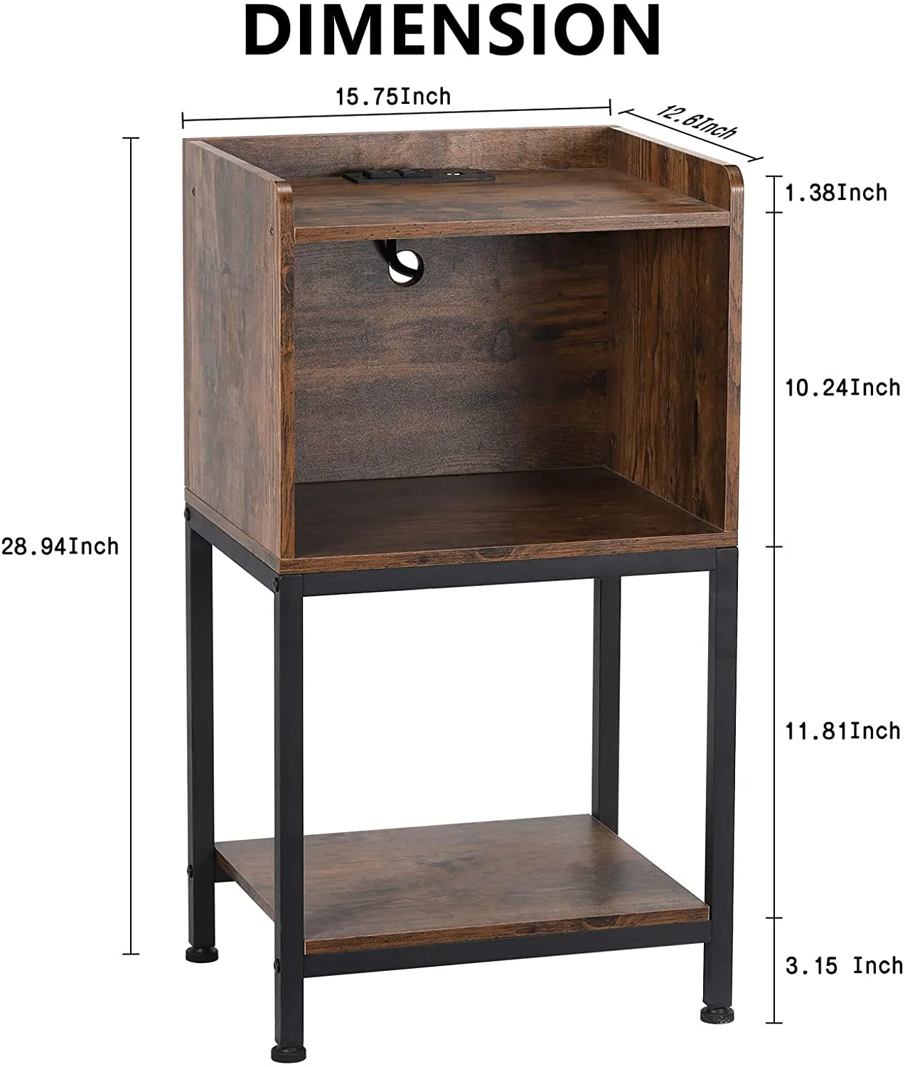 [Side Table with Charging Station] The modern charging station includes two 3-prong AC outlets and two USB ports, which can easily charge your phone, tablet, etc. 6.46ft long power supply cord allows you to move this end table freely. [Perfect Storage Space] Sofa side table with an oversized drawer and open shelves to storage. There are 1.38 inches anti-drop baffles on the left, right and back of the desktop to prevent electronic products from falling when you use them, the lower part is open storage, on which you can place your decorative books and etc. [Sturdy Construction] Made of premium particleboard and robust steel frame, providing great stability and durability. Also equipped with 4 feet while adjusting side end table height on uneven surfaces and enhancing stability. [Easy to Assemble] The living room table comes with all tools needed, you can definitely complete the installation easily and smoothly by following clear and detailed instruction. Product dimensions: 15.75″L x 12.6″W x 28.94″H [Rustic Style & Vintage Design] The matte black metal frame represents the industrial style, while the brown wood panel represents the retro design, a perfect pick for your bedroom, living room, home office, it can be used as a bedside table, couch table.