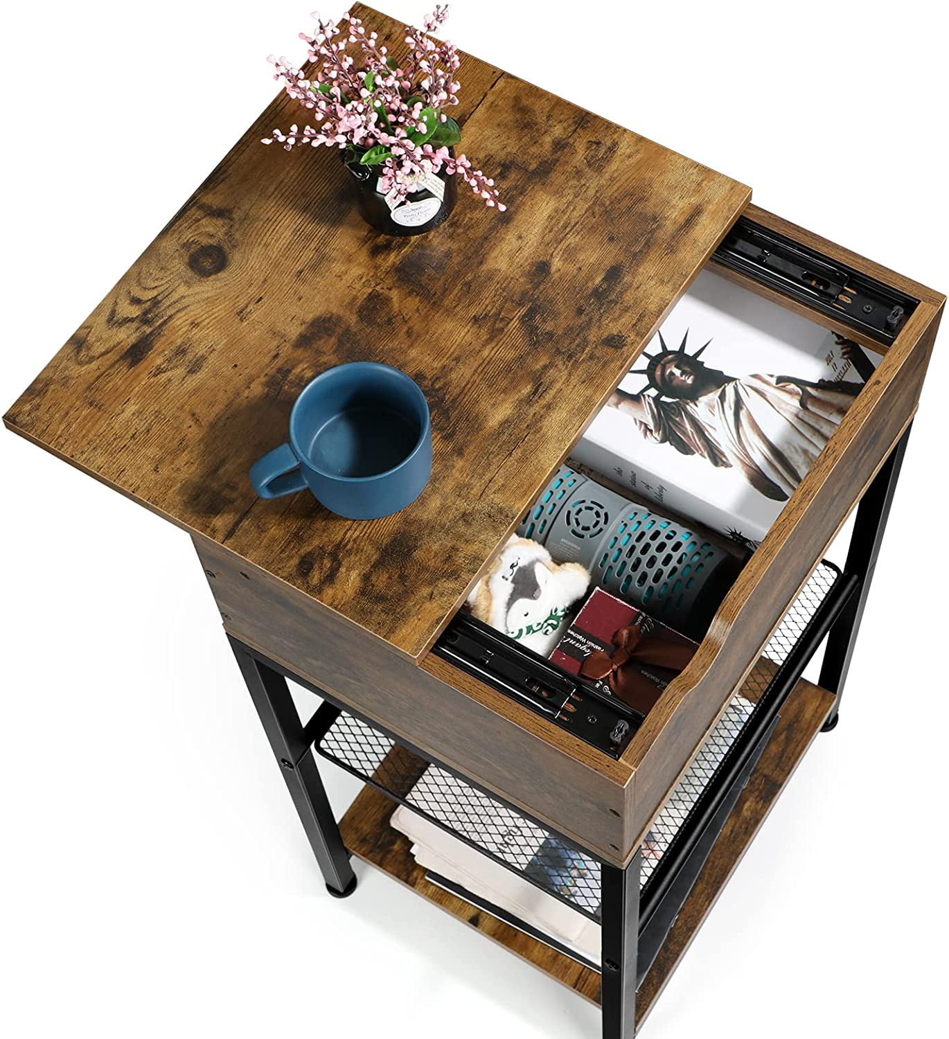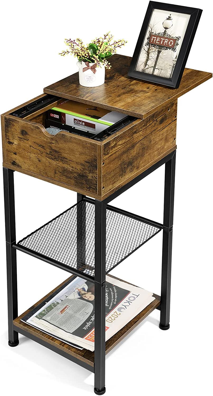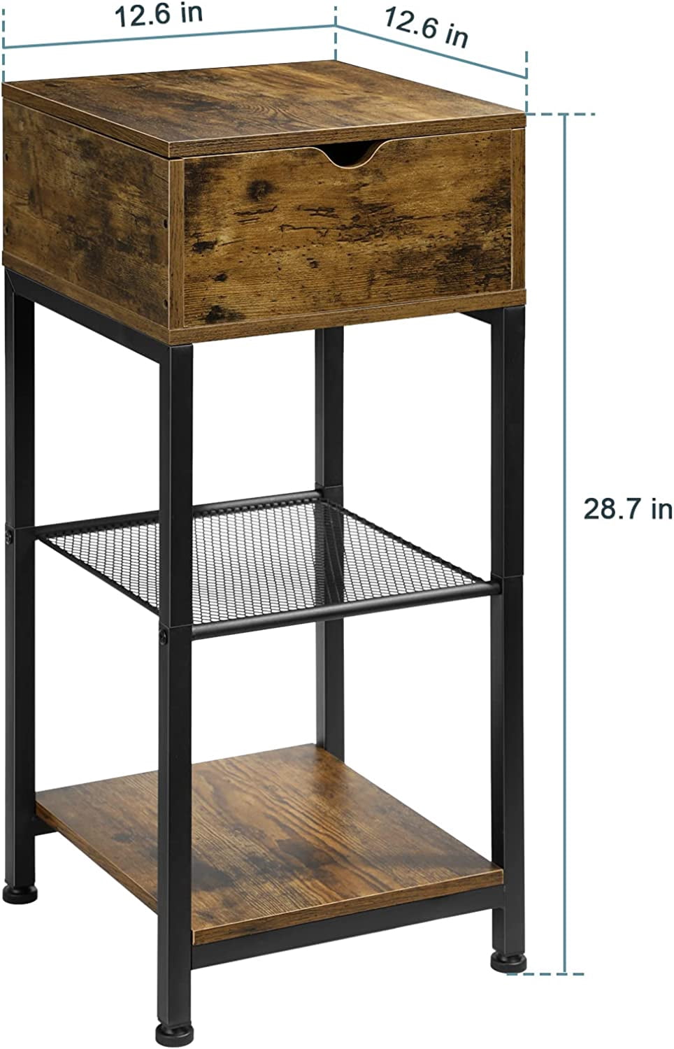 [Farmhouse End Table] Rustic brown wooden tabletop is complemented by the 2 tier storage shelf of the side table. Understated design not only adding a unique personality but also creating a warm atmosphere for your room. Not only as a furniture, but also as a home decoration. [Slide Design for Easy Storage] The nightstand features a slide rail design, you can easily open it to store or take out items. And the small end table with 2 shelves to hold remotes, favorite decors, books next to the couch, or beside the bed. Ideal for small space, between the sofa and the wall as a side table, an entry table in the hallway, or a nightstand beside your bed. [Strong & Stable] This sofa side table is constructed with strong MDF board and a robust metal frame which is waterproof, wear-resistant and easy to clean. Even if the narrow end table is loaded with 150 pounds of items, it will not be damaged. Adjustable pads ensure that the coffee table remains stable on uneven floors. [Versatility Side Table] Overall Dimensions: 12.6” L x 12.6” W x 28.7” H, this compact bedroom nightstand has enough storage space without taking up too much floor space, suitable for small spaces. You can put it as a sofa side table, bedside tables, nightstand, farmhouse end table for your bedroom, living room, entryway, hall, etc.