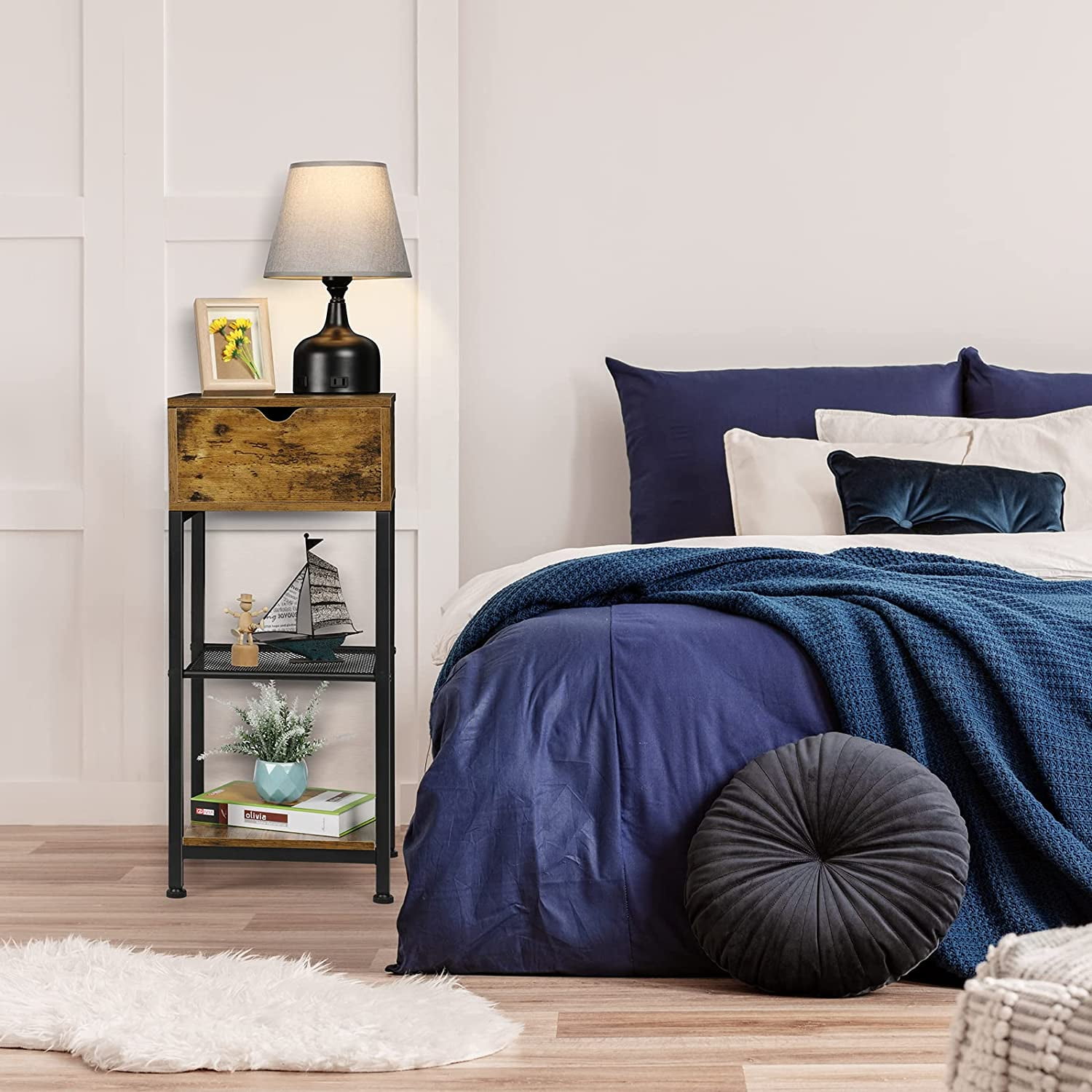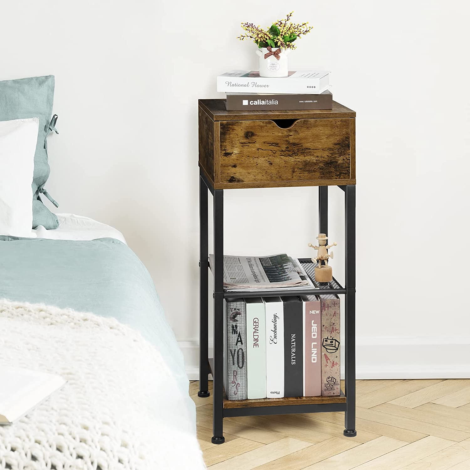The bedroom side table adopts an industrial style design, with a rustic brown finish and black metal frame that adds a farmhouse feel to your living room. The bedside end table with storage shelf can be used in any place in your bedroom and living room. It is the best choice as a bedside table, side table, end table, nightstand. The nightstand features a slide rail design, you can easily open it to store or take out items.