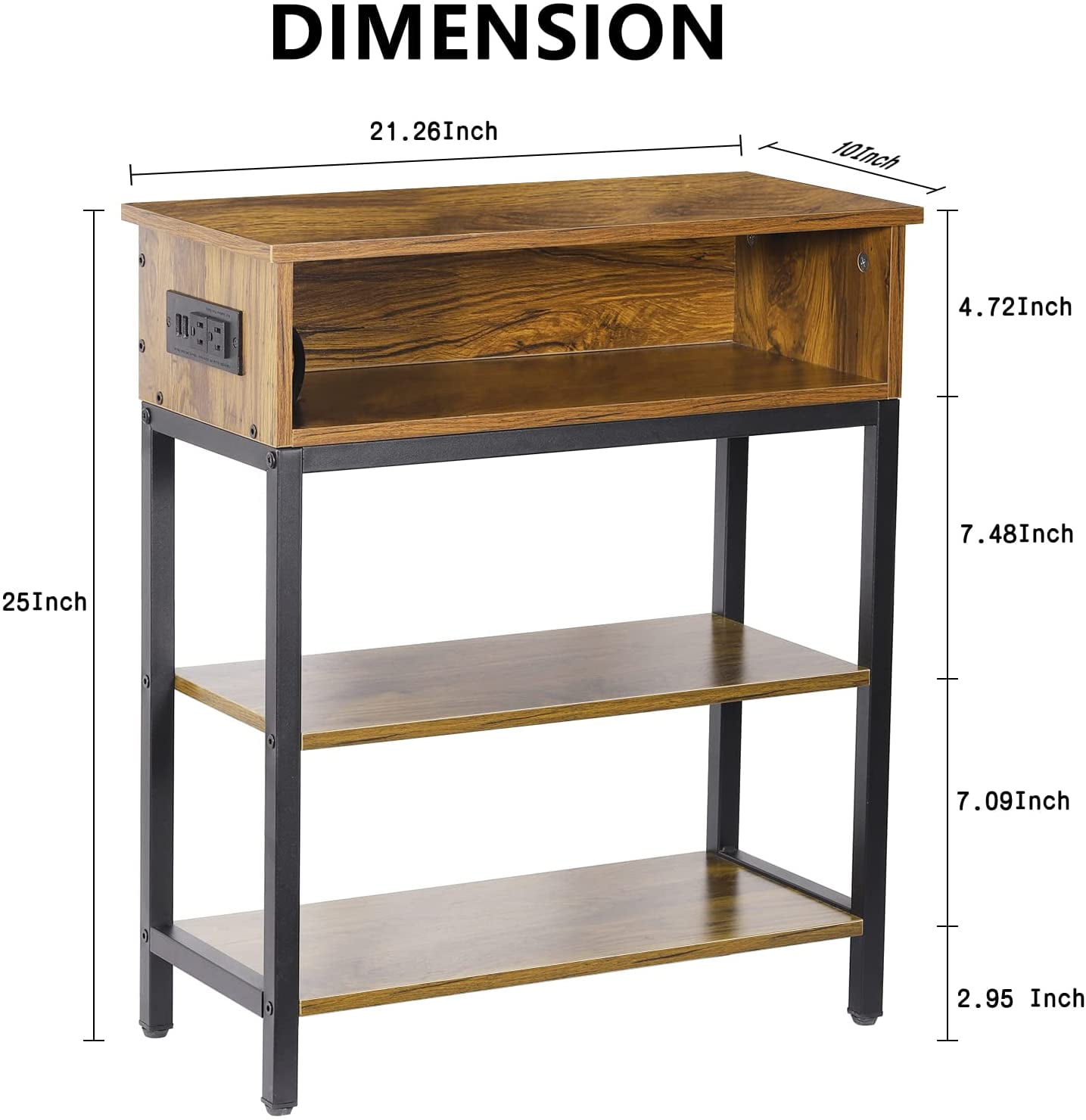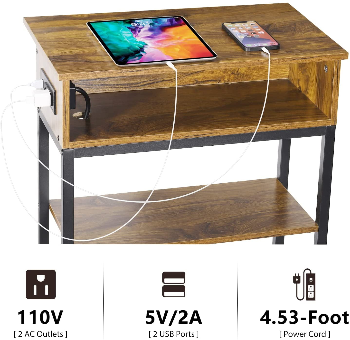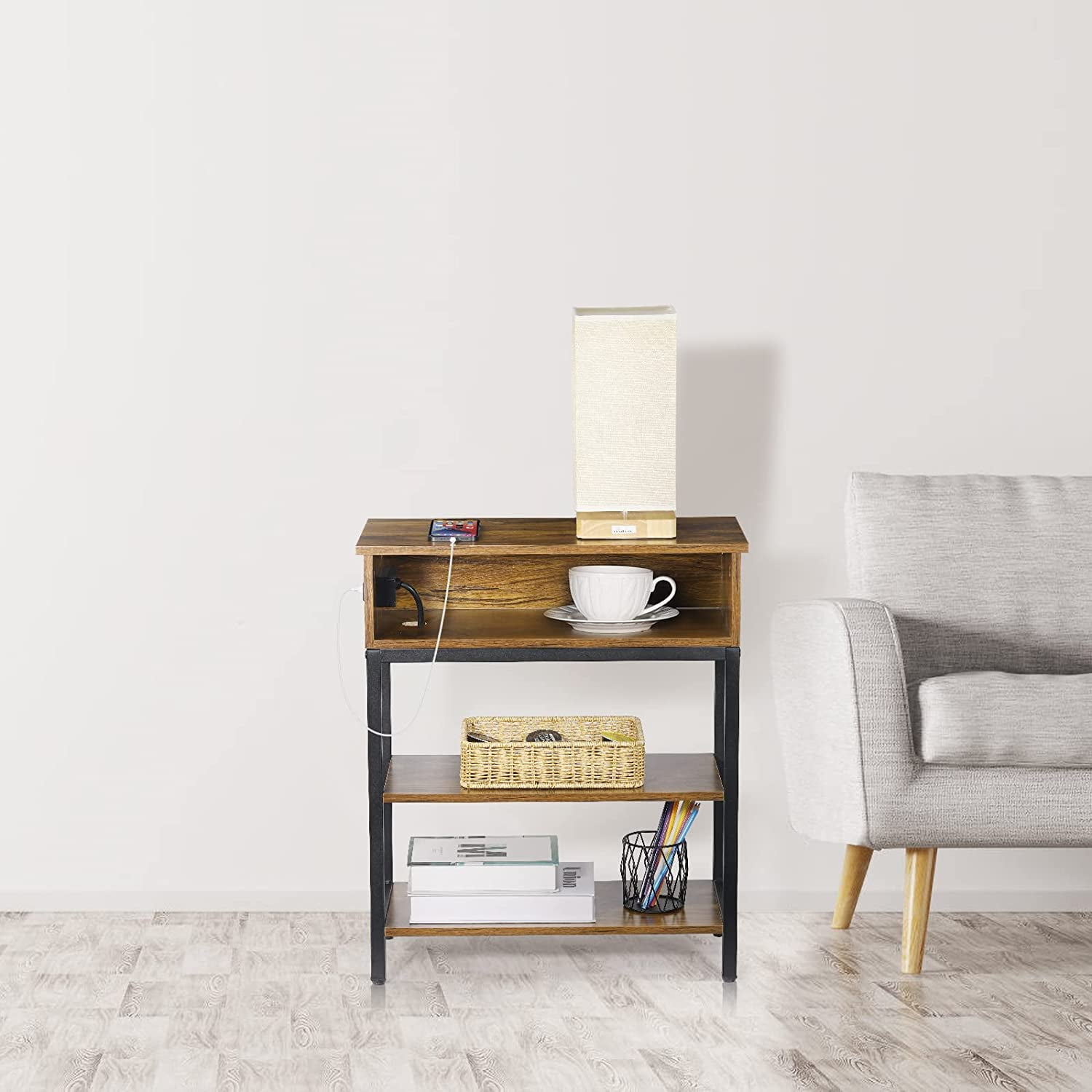 [End Table with Charging Station] The charging station includes two 3-prong AC outlets and two USB ports, which can easily charge your phone, tablet, etc. 4.15ft long power supply cord allows you to move this end table freely. [Perfect Storage Space] Sofa side table with a drawer and 2 shelves offer you ample space to storage. Top board can place an laptop, drawers provide separate space to organize your little things, the lower part is open storage, on which you can place your decorative phone lamps books and etc. [Sturdy Construction] Made of premium particleboard and robust steel frame, providing great stability and durability. Also equipped with 4 feet while adjusting side end table height on uneven surfaces and enhancing stability. [Sturdy Construction] Made of premium particleboard and robust steel frame, providing great stability and durability. Also equipped with 4 feet while adjusting side end table height on uneven surfaces and enhancing stability. [Rustic Style & Vintage Design] The matte black metal frame represents the industrial style, while the brown wood panel represents the retro design, a a perfect pick for your bedroom, living room, home office, it can be used as a bedside table, couch table.