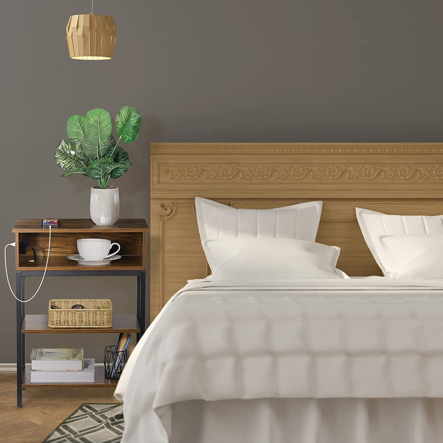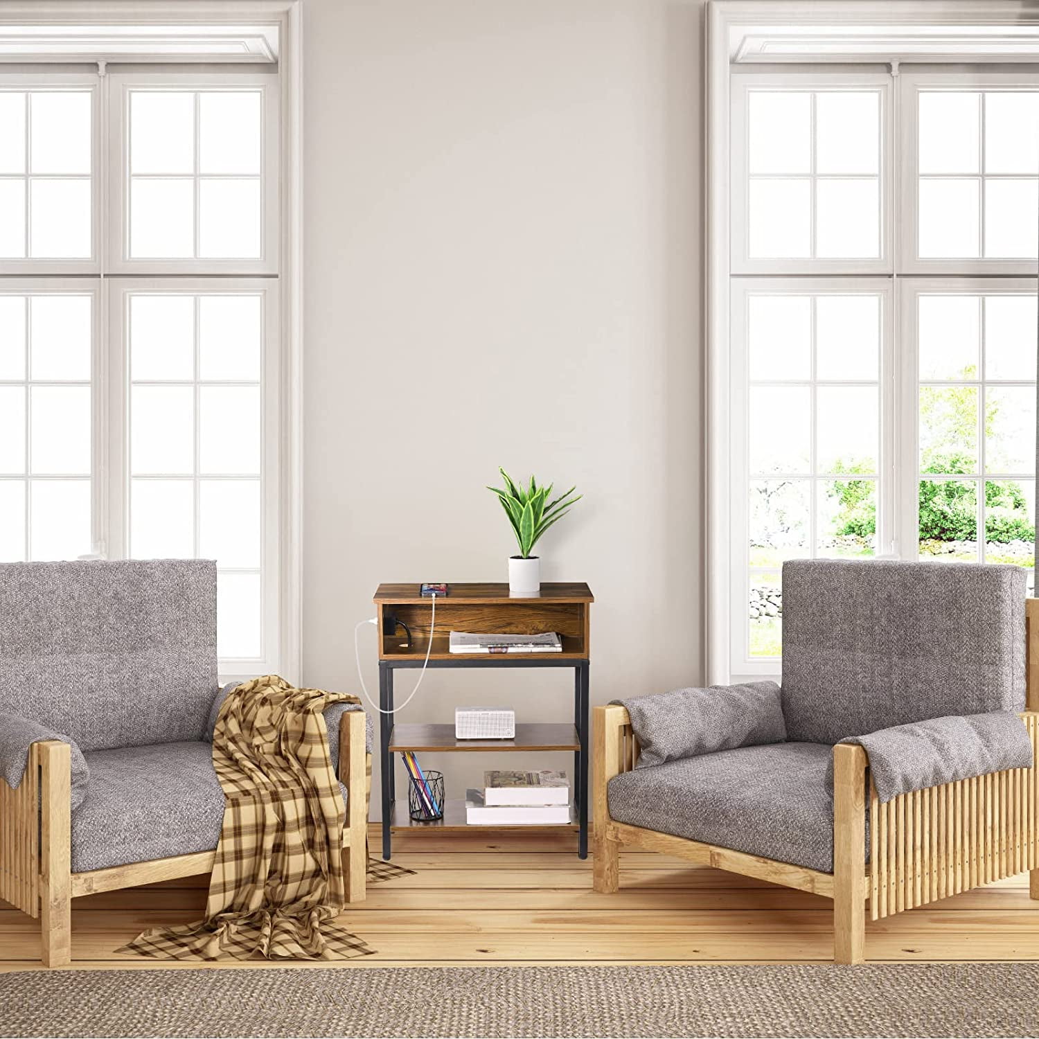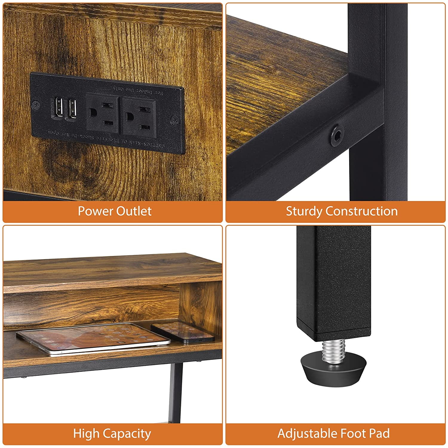 [End Table with Charging Station] The charging station includes two 3-prong AC outlets and two USB ports, which can easily charge your phone, tablet, etc. 4.15ft long power supply cord allows you to move this end table freely. [Perfect Storage Space] Sofa side table with a drawer and 2 shelves offer you ample space to storage. Top board can place an laptop, drawers provide separate space to organize your little things, the lower part is open storage, on which you can place your decorative phone lamps books and etc. [Sturdy Construction] Made of premium particleboard and robust steel frame, providing great stability and durability. Also equipped with 4 feet while adjusting side end table height on uneven surfaces and enhancing stability. [Sturdy Construction] Made of premium particleboard and robust steel frame, providing great stability and durability. Also equipped with 4 feet while adjusting side end table height on uneven surfaces and enhancing stability. [Rustic Style & Vintage Design] The matte black metal frame represents the industrial style, while the brown wood panel represents the retro design, a a perfect pick for your bedroom, living room, home office, it can be used as a bedside table, couch table.