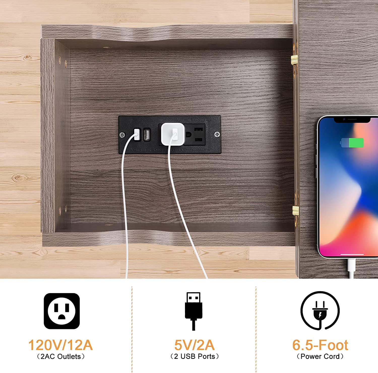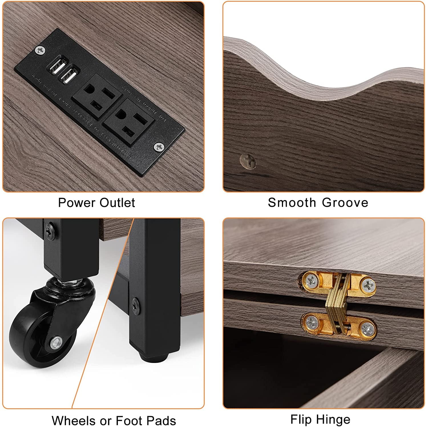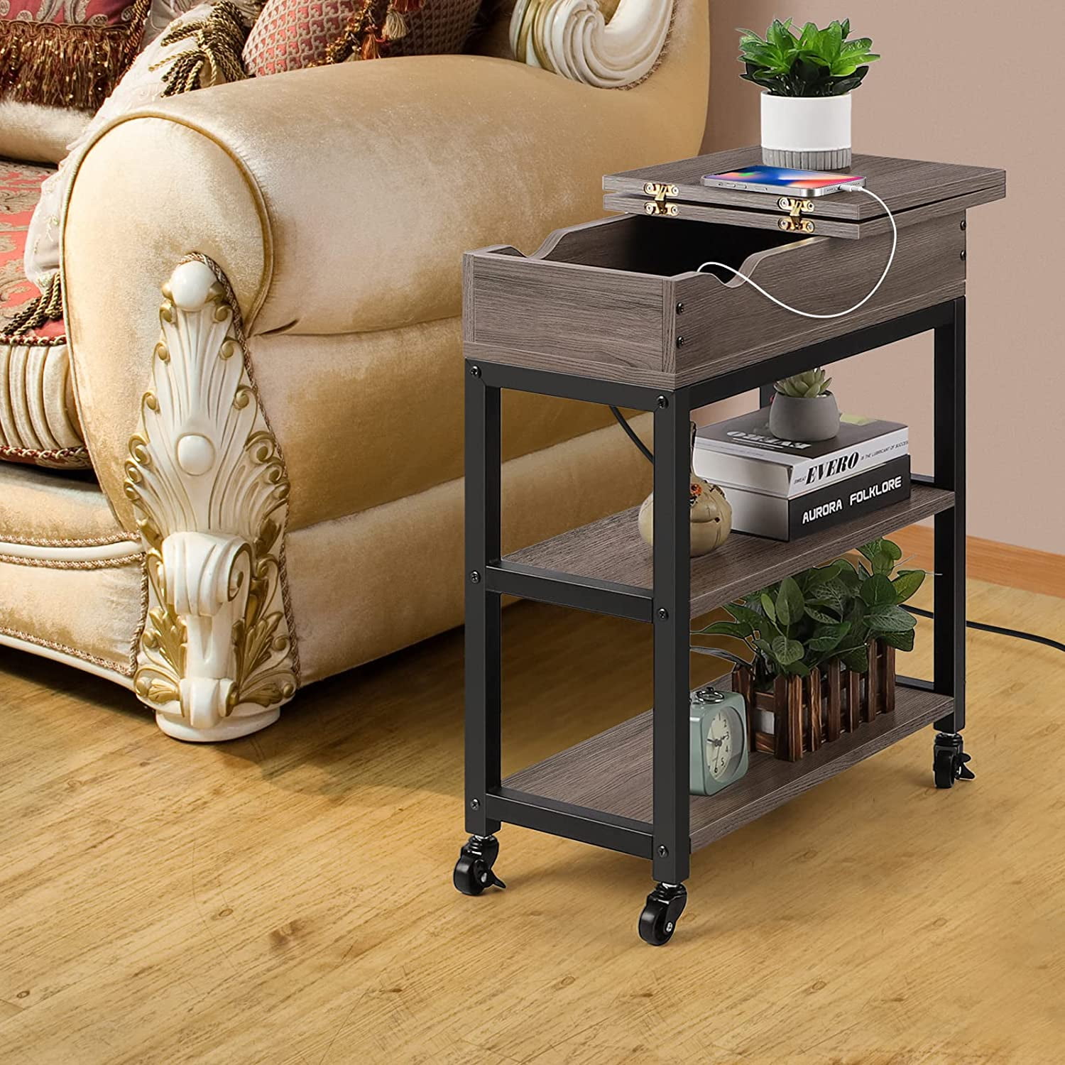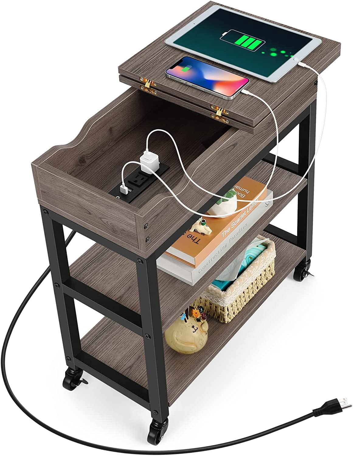 The flip top side table with charging station features a modern and convenient design equipped 2 USB charging ports and 2 AC power outlets, which will allow you to charge phones, tablet, kindle, speaker and more mobile devices at any time. Designed with 3 tiers, this end table will provide you with more space to storage small items. To meet your diverse needs, this end table equipped with 4 feet pads, 4 360-degree rotating wheels, you can change the feet as your preferences. The table top is designed with a large flip table part, so you can tuck away and take out small items easily.