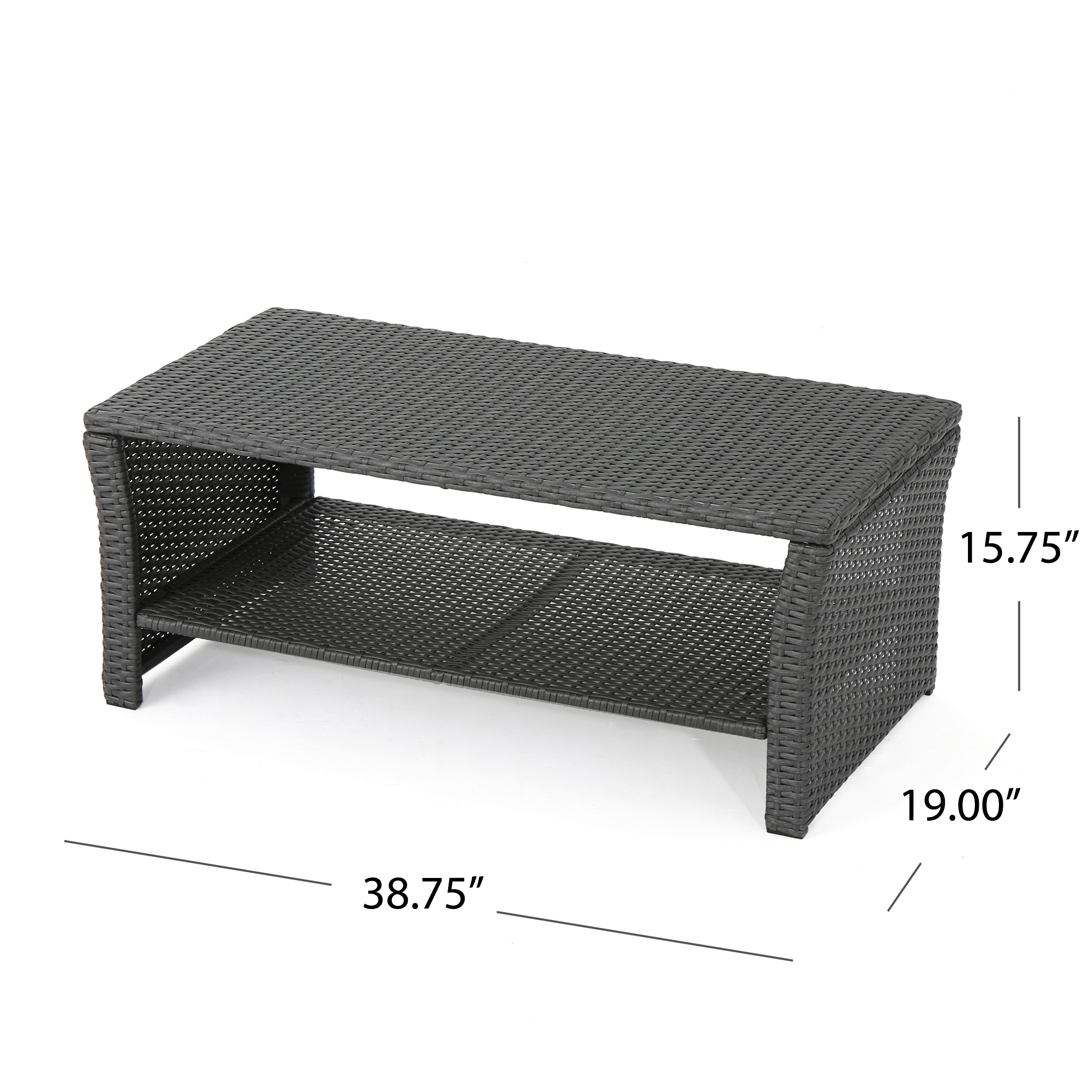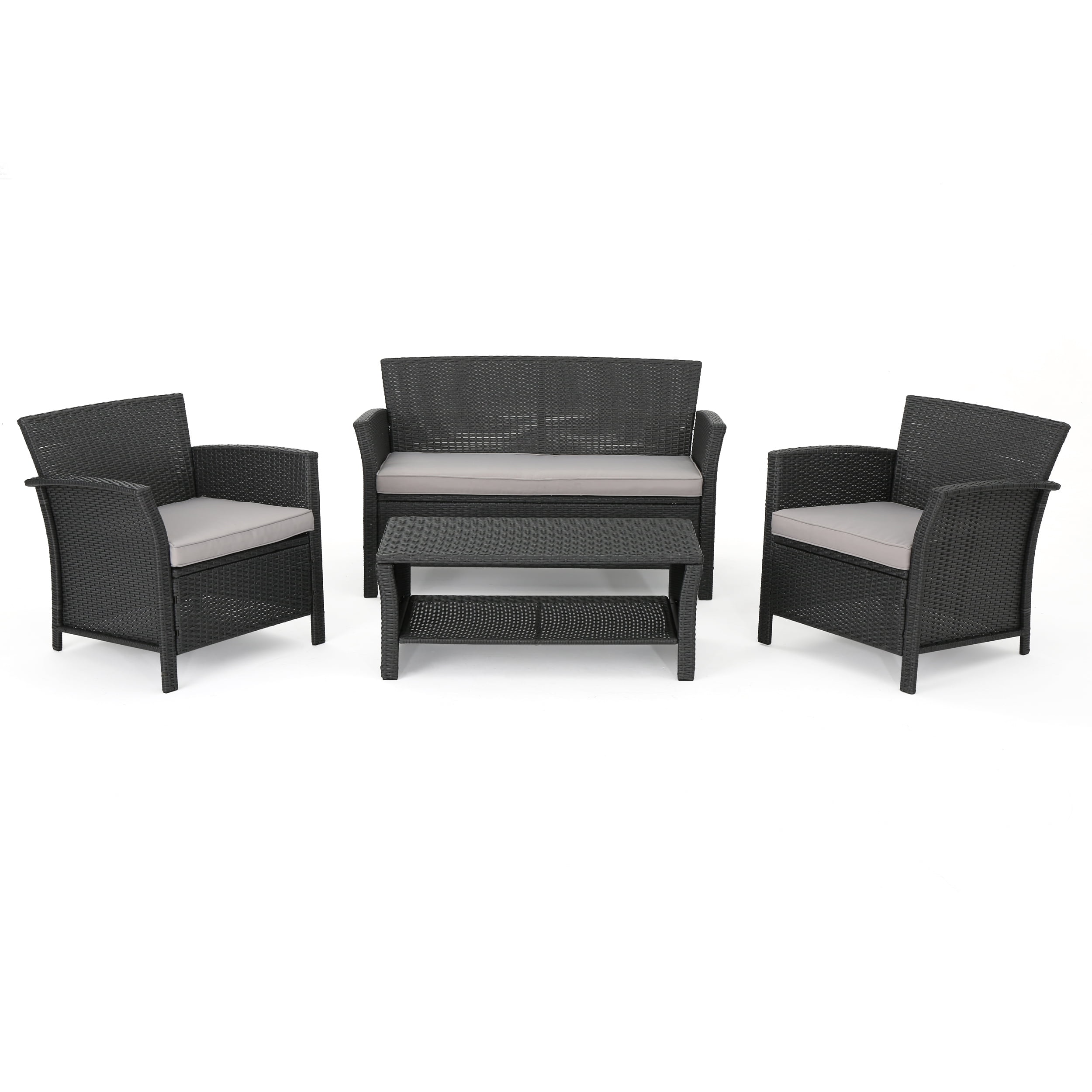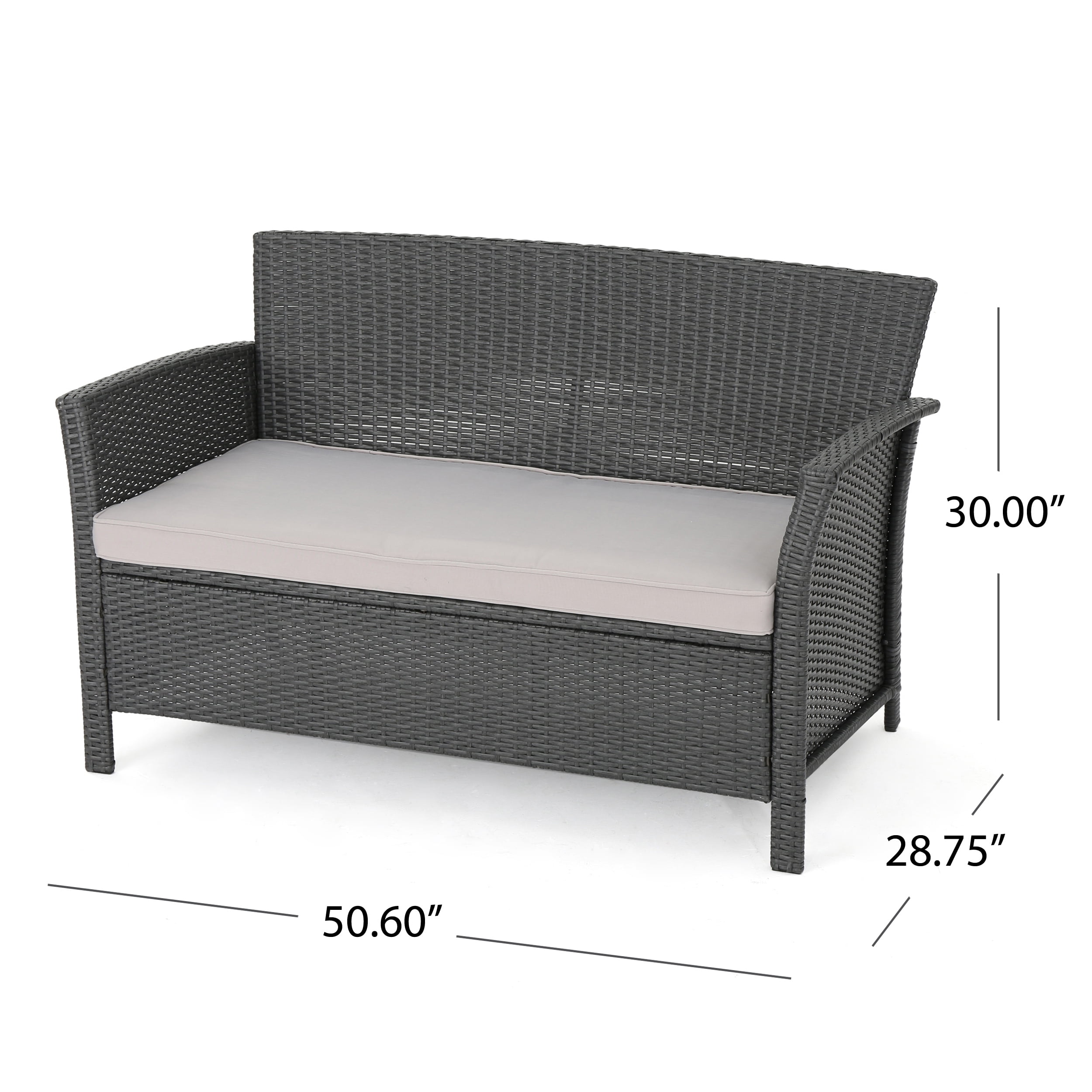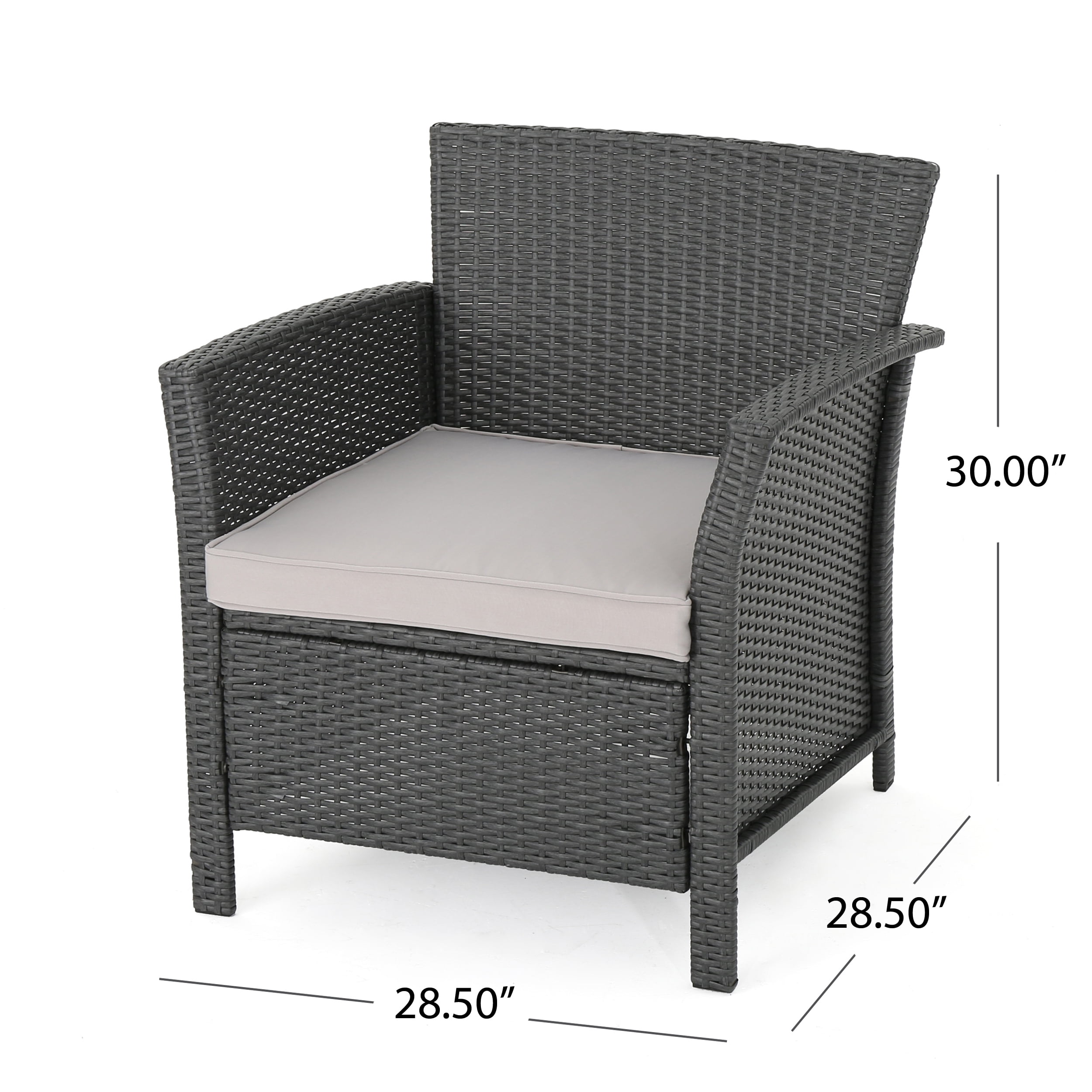 Includes: Two (2) Club Chairs, One (1) Loveseat, One (1) Coffee Table Material: Polyethylene Wicker Cushion Material: Water Resistant Fabric Fabric Composition: 100% Polyester Frame Material: Steel Wicker Finish: Grey Cushion Color: Silver Assembly Required Hand Crafted Details Club Chair Dimensions: 28.50 inches deep x 28.50 inches wide x 30.00 inches high Loveseat Dimensions: 28.75 inches deep x 50.60 inches wide x 30.00 inches high Table Dimensions: 19.00 inches deep x 38.75 inches wide x 15.75 inches high