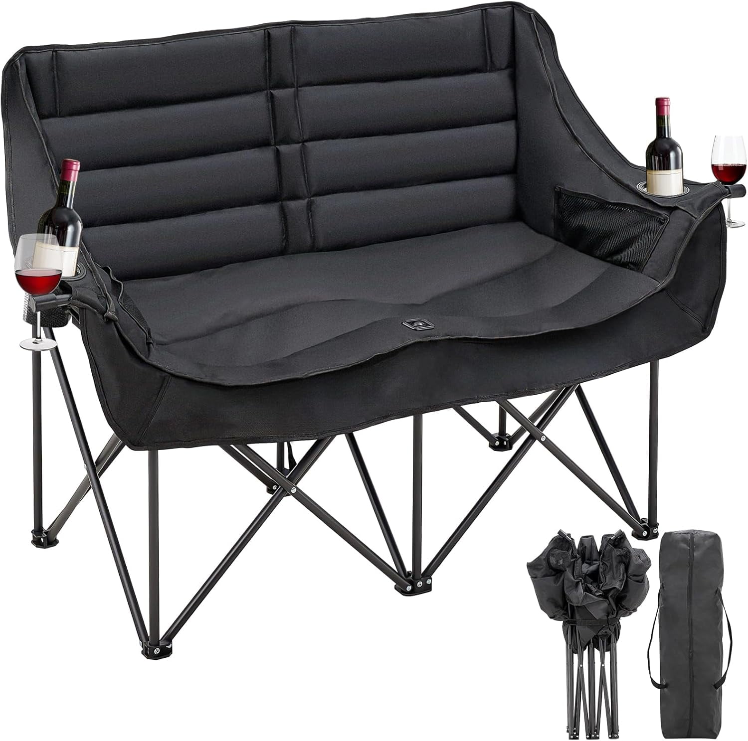 Outdoor Double Camping Chair Oversized Loveseat Camping Couch Folding Camping Chairs for Adults with Cup & Wine Glass Holder, Portable Double Chair for Camp Lawn Picnic, Support 600LBS