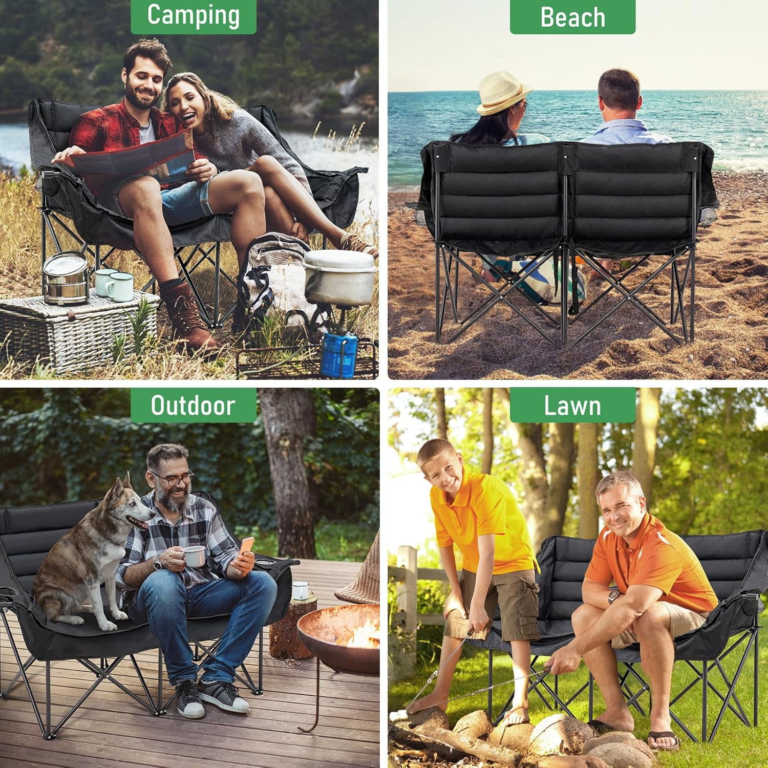 【Large Comfy Camping Loveseat】This roomy double chair comfortably seats two adults, making it the perfect camping loveseat for couples. Its sturdy circular steel tube frame supports up to 600LBSs and comfortably accommodates two people.Enjoy your outdoor adventures with added comfort and intimacy. 【Premium Material】The double camping couch is crafted from breathable and durable 600D double-layer Oxford fabric, known for its tear-resistant qualities. Additionally, it features sponge padding in the seat and backrest, with meticulous stitching that maintains its shape and prevents cotton shifting. This results in a softer and more comfortable experience compared to other standard camping chairs. 【Convenient Armrests with Cup Holders】Equipped with armrests that include both cup holders and wine glass holders, this lawn chairs adds a touch of luxury to your outdoor experience, allowing you to relax with your favorite beverages close at hand. 【Easy to Fold and Store】Folding loveseat camping chair is convenient for storage and quick setup. It’s the ideal camping loveseat for those who love to travel and engage in outdoor activities without the hassle of bulky equipment. 【Lightweight and Portable】 Double chair for outdoor weighs 13.40lbs and, when folded, the size of the double camp chair only 36 x 8 x 5 inches. It is portable and light enough to be carried like small luggage on a trip and fits most car trunks to meet your camping needs.
