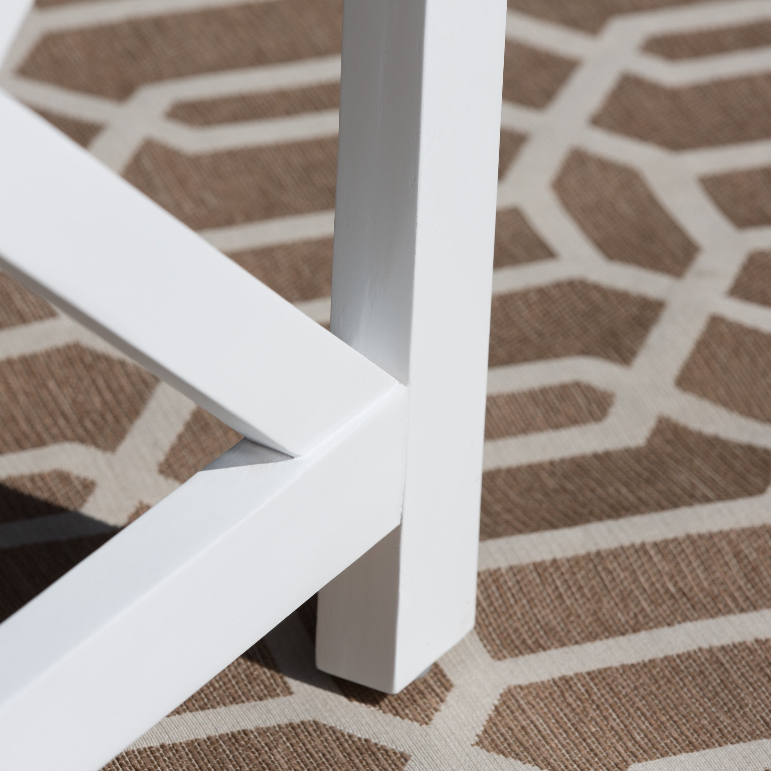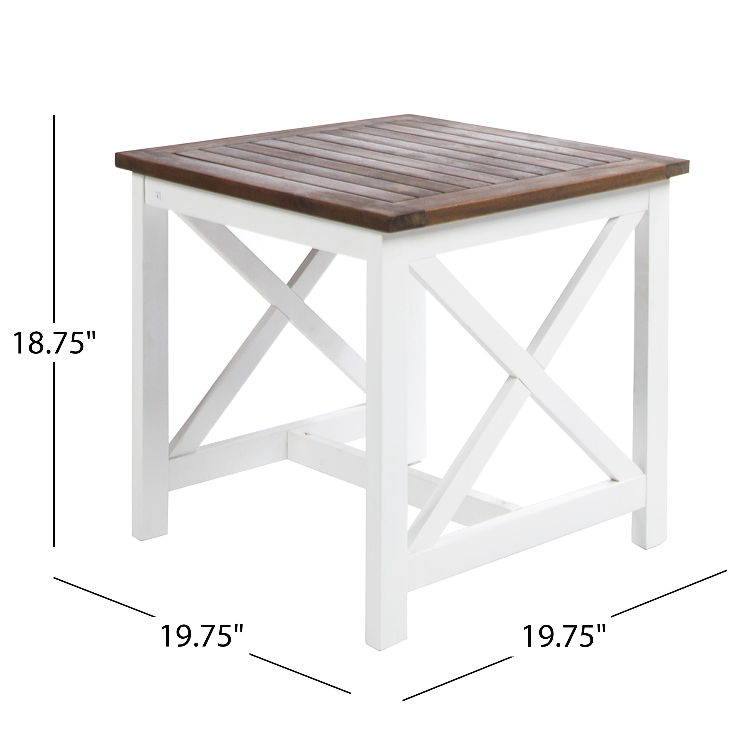 Includes: One (1) Table Material: Acacia Wood Top Finish: Dark Oak Leg Finish: Polyurethane White Assembly Required Hand Crafted Details Dimensions: 19.75 inches deep x 19.75 inches wide x 18.75 inches high