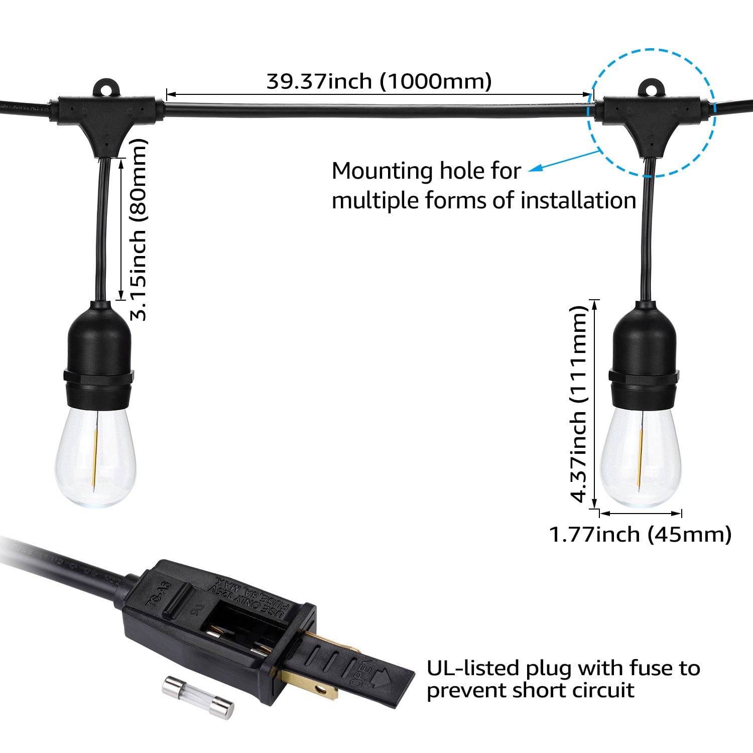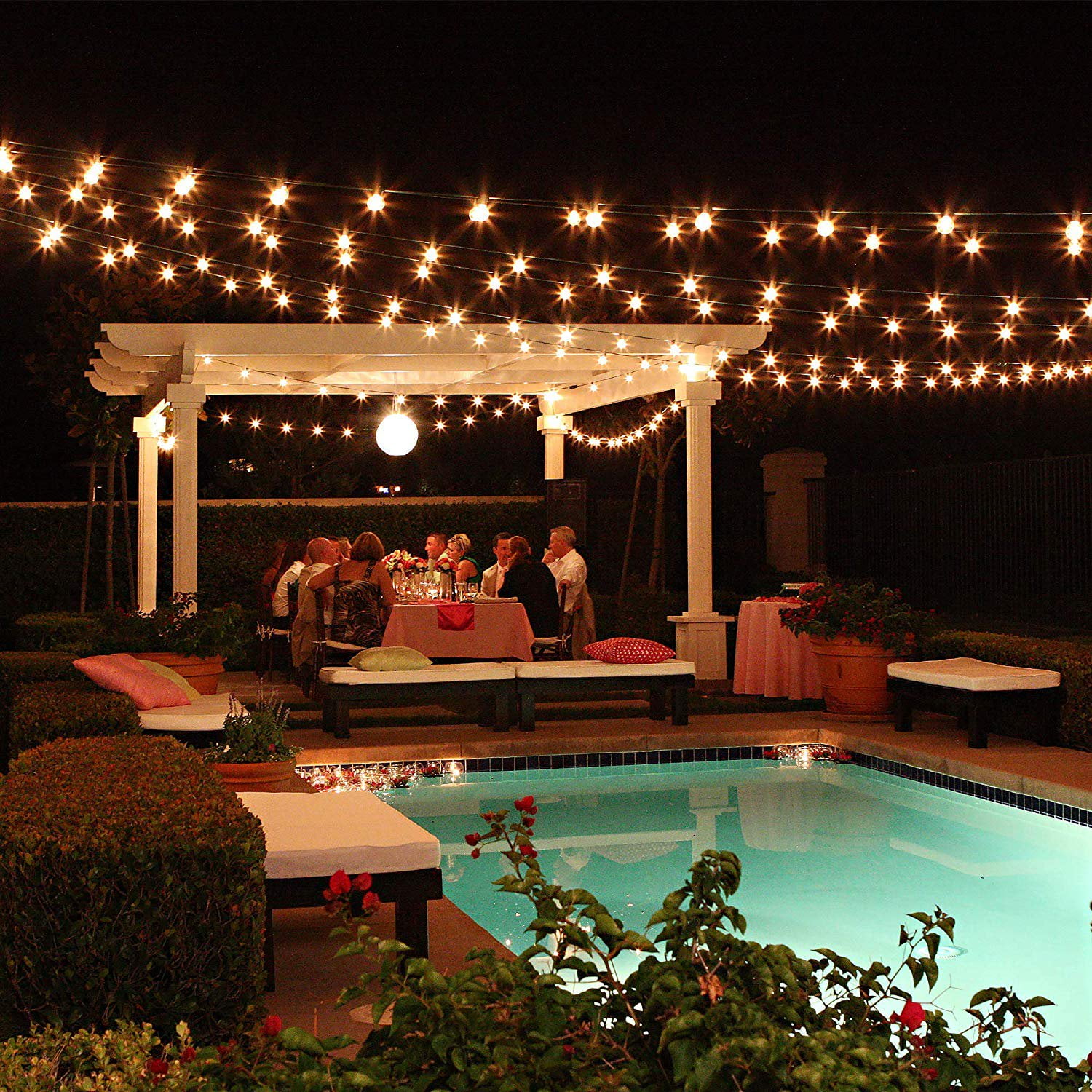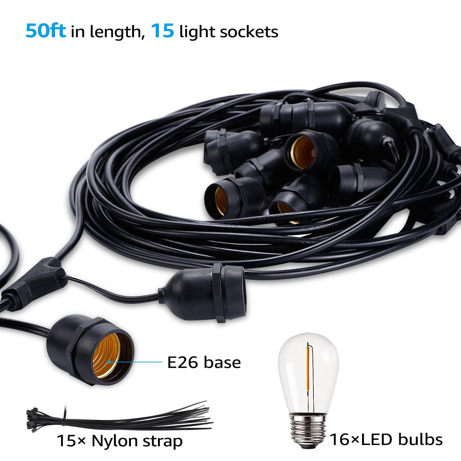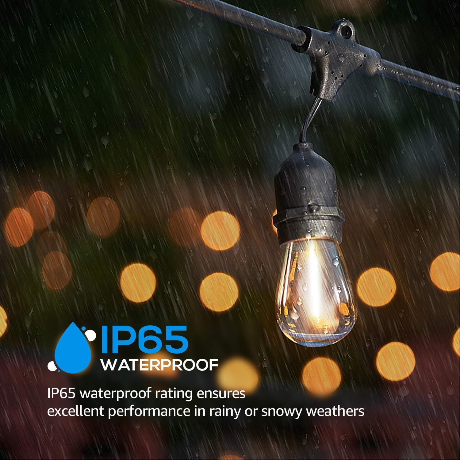 You can get other string lights that you need here: Patio String Light Outdoor Globe String Lights Globe String Light Patio String Lights TorchStar 50ft LED Outdoor String Lights, Weatherproof Patio String Light for Party, Restaurant, Garden, Patio Lights, 15 Sockets, 16 Bulbs Included Perfect Ambience String Lights Create a cozy and relaxed atmosphere with this string light’s 2700K soft white shine that makes it great for setting the mood at weddings, birthdays and cocktail parties. Optimal Choice The IP65 waterproof rating of this light means it can withstand extreme temperatures and harsh weather like rain and snow. This string light is widely used for yards, decks, patios, porches and bistro decoration. Extendable Design You can easily connect strings together end to end thanks to the female plugs, letting you connect up to 10 sets of lights. A single 18AWG lamp cord can hold a maximum load of 800W LED. Satisfaction Guarantee Come with 3 years of product warranty for your rights and benefits. Compatible with plug-in dimmer for an adjustable brightness level. Note The product warranty does not apply for the free bulbs included. Specification Wattage: 15W in total, 1W/bulb Voltage: 110V Length: 50ft Waterproof rating: IP65 CCT: 2700K Soft White Lifespan: 15, 000hrs Material: PVC copper wires & glass bulbs Base type: E26