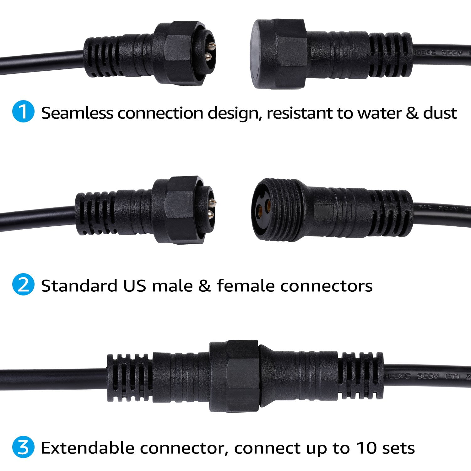 IP65 waterproof rating Commercial grade string lights UL listed lamp cord Come with 16 LED bulbs At most connect up to 15 strands