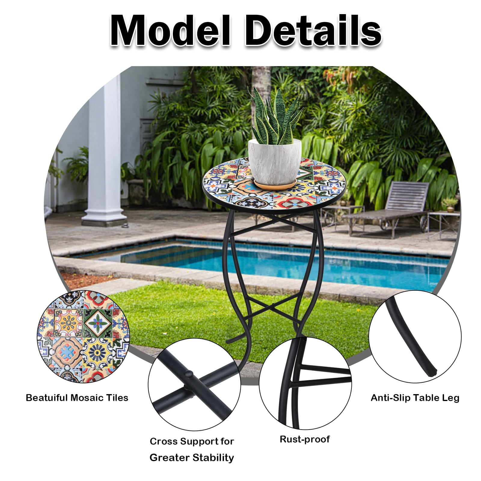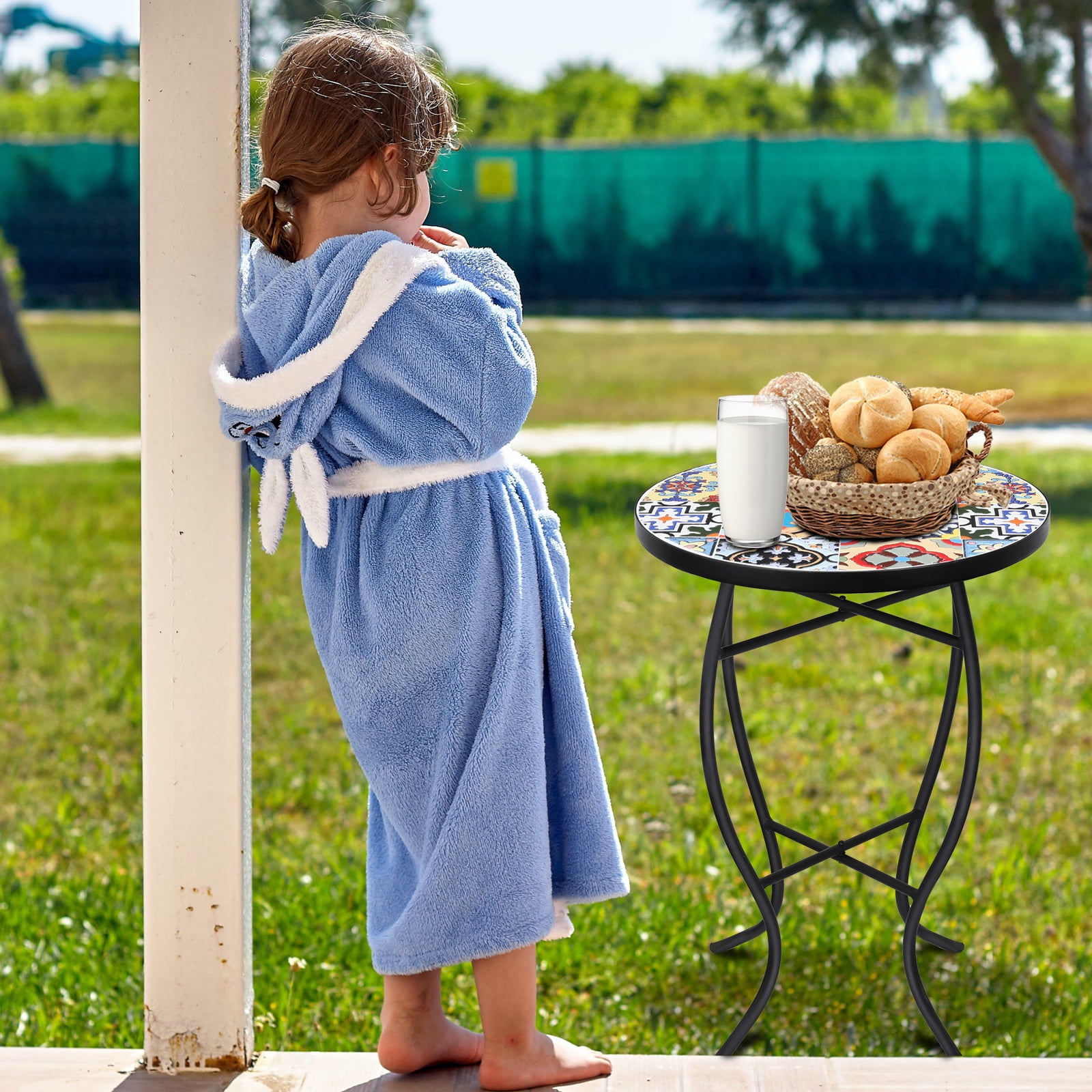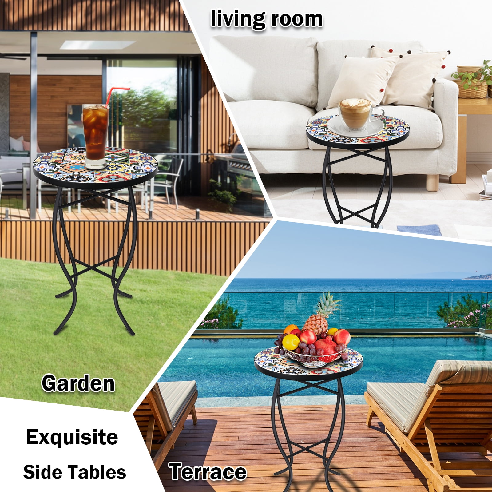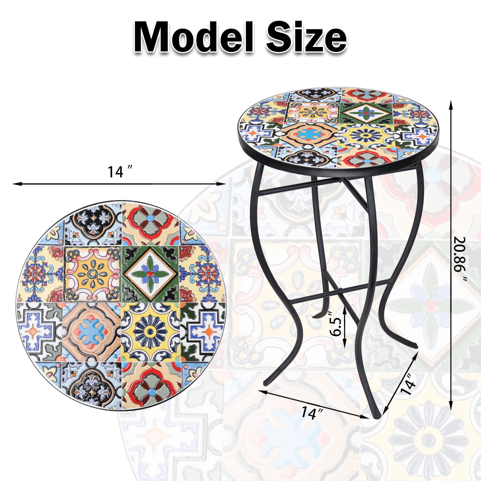 Outdoor Mosaic Patio Side Table Small Round Patio Accent Printed Glass Balcony Coffee Desk for Garden, Yard or Lawn 14 Inches