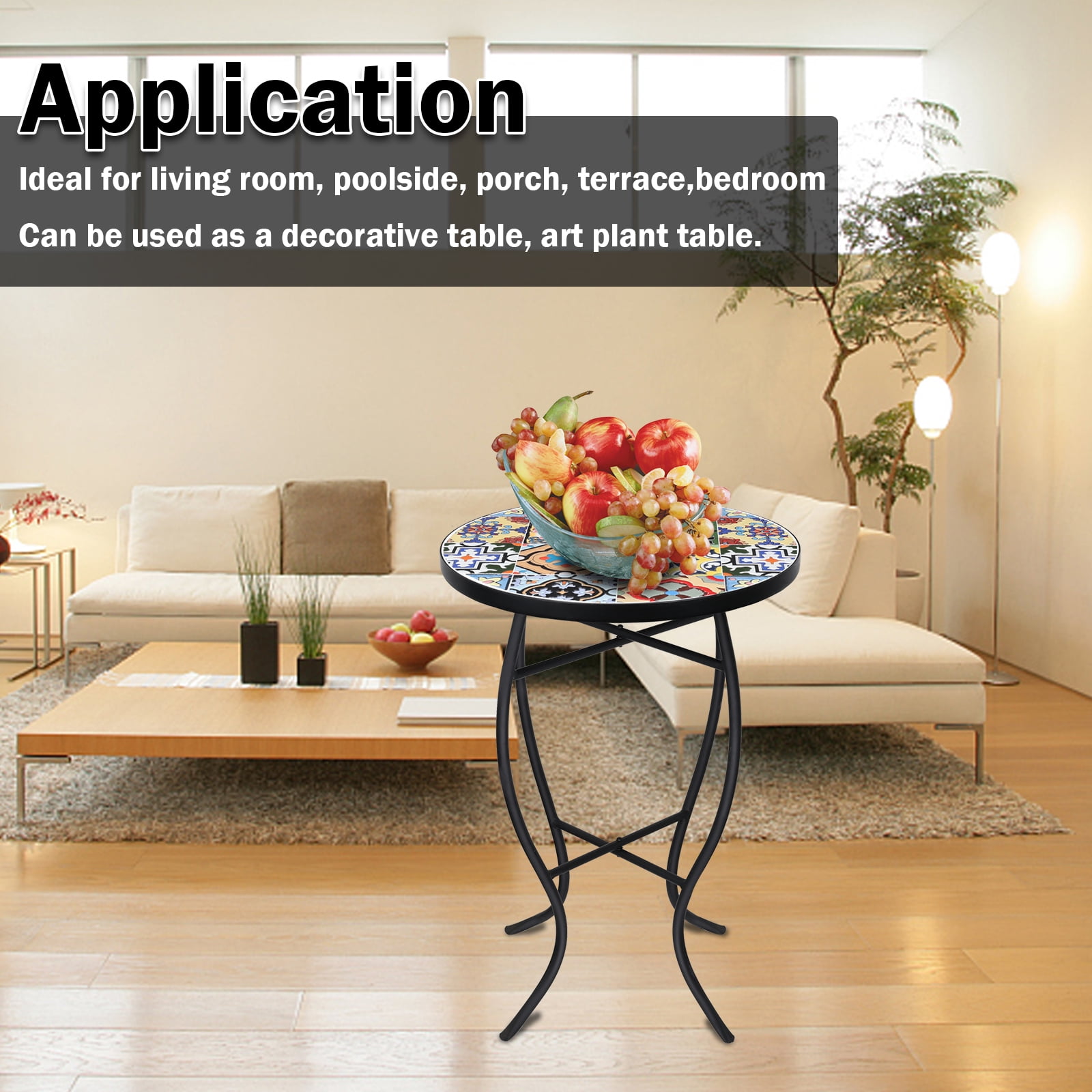 Smart size for any space: The tabletop is 14 inches in diameter, and the table is lightweight, so you can easily move it. It is very suitable for places such as the living room, kitchen, corridor, yard, garden or swimming pools. This beautiful glass tabletop design will beautify your space. It is the perfect size for a small lounge area, and it can perfectly match any large space Appearance design: The mosaic coffee table is made of ceramic tiles with beautiful patterns. The mosaic coffee table is a kind of interesting and creative furniture that can light up your space and give it a more artistic atmosphere Sturdy Metal Frame: Built with reinforced metal frame with anti-rust coating and mosaic table top to ensure the sturdiness and lifetime of this table, ideal for daily use. Stable curved legs structure and it withstand all kinds of weather Easy to assemble: No tools are required, and they can be easily installed in 4 minutes. The ceramic tabletop is waterproof and easy to clean