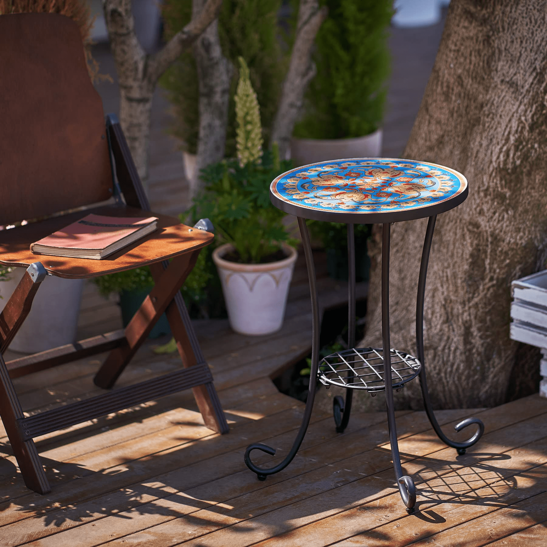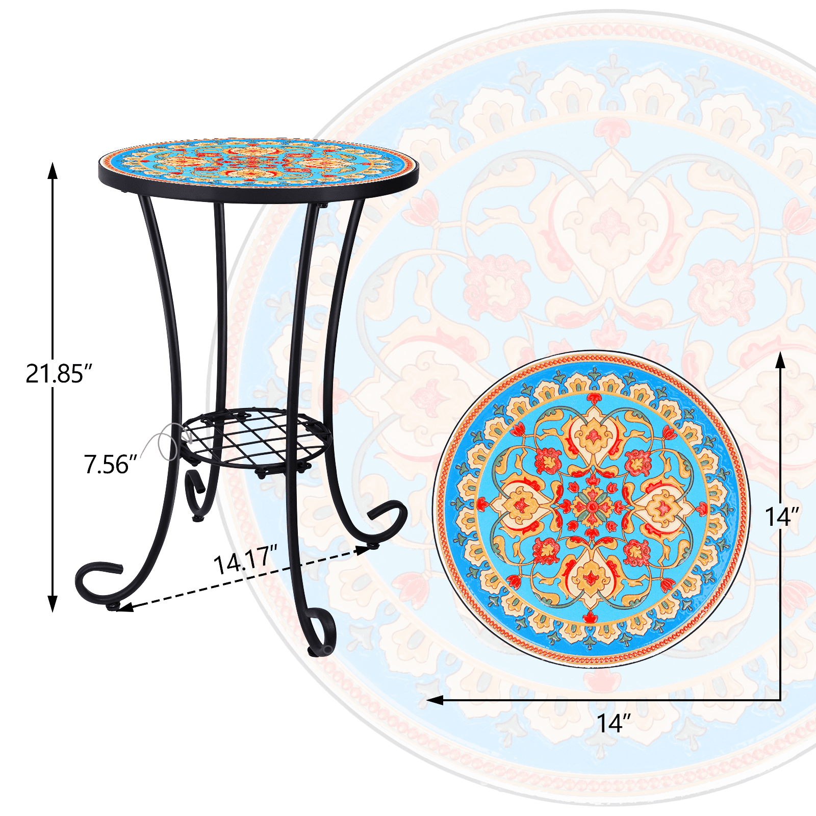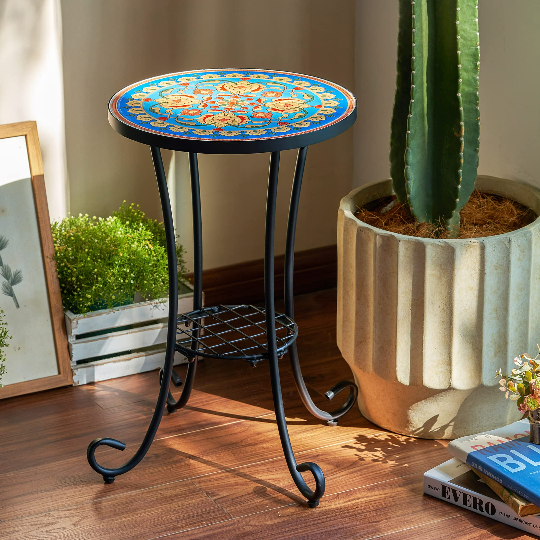 Durable Material: The table top of the outdoor mosaic table isceramic and the surface has a smooth coating, which is easy to clean and scratch-resistant; the iron frame is weather and rust-resistant, and the garden table has a good load-bearing capacity and will serve you for years to come. Outdoor Side Table: This 21-inch high versatile outdoor & indoor plant stand can also be used as an end table, side table, or bedside table—it’s a perfect place to perch your beverages, books, or begonias. Stylish Design: Mosaic coffee table is made of ceramic tiles with beautiful patterns. The small porch table is an attractive and decorative furniture that can light up your space and give it a more artistic look. Easy to Assemble: No tools are required, and this versatile side table can be assembled in 4 minutes. The ceramic table top is waterproof and easy to clean. Good Customer Service: If you have any doubts or encounter problems, you can contact us immediately and we will attend to you immediately. Just assemble the table top and frame according to the instructions. Secure it to prevent the desktop from falling. When done, place the side table where you want and it’s ready to use.