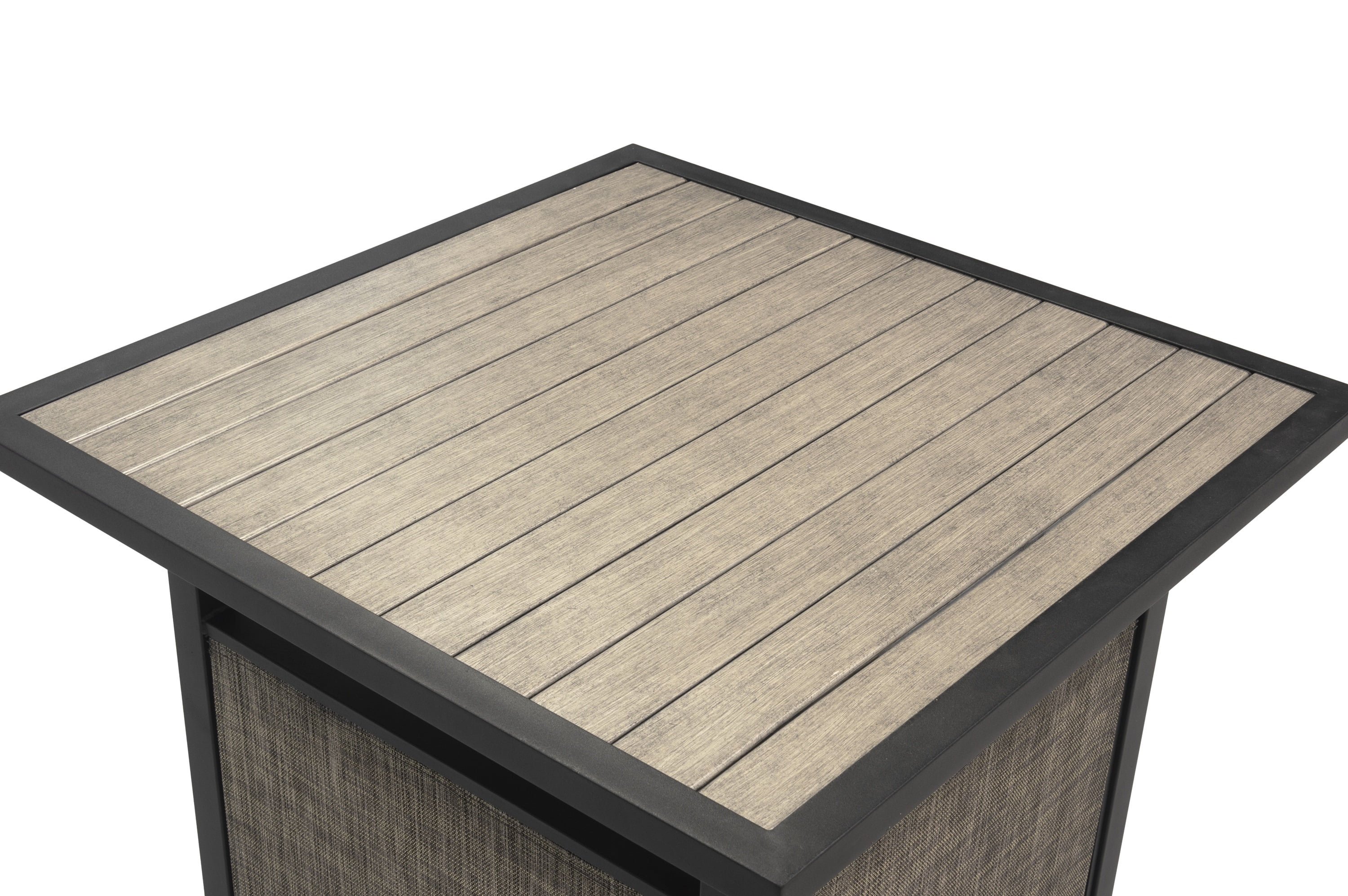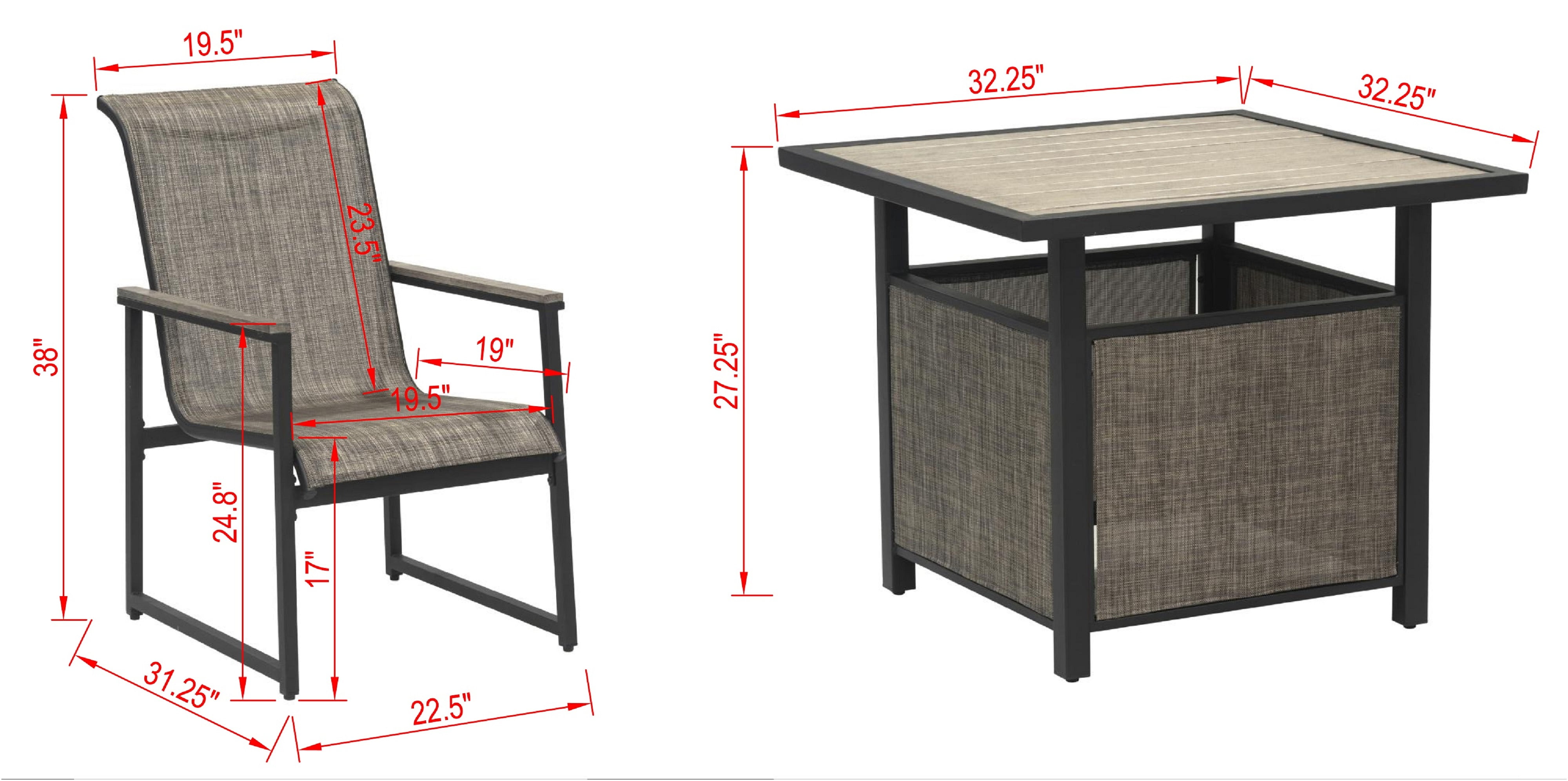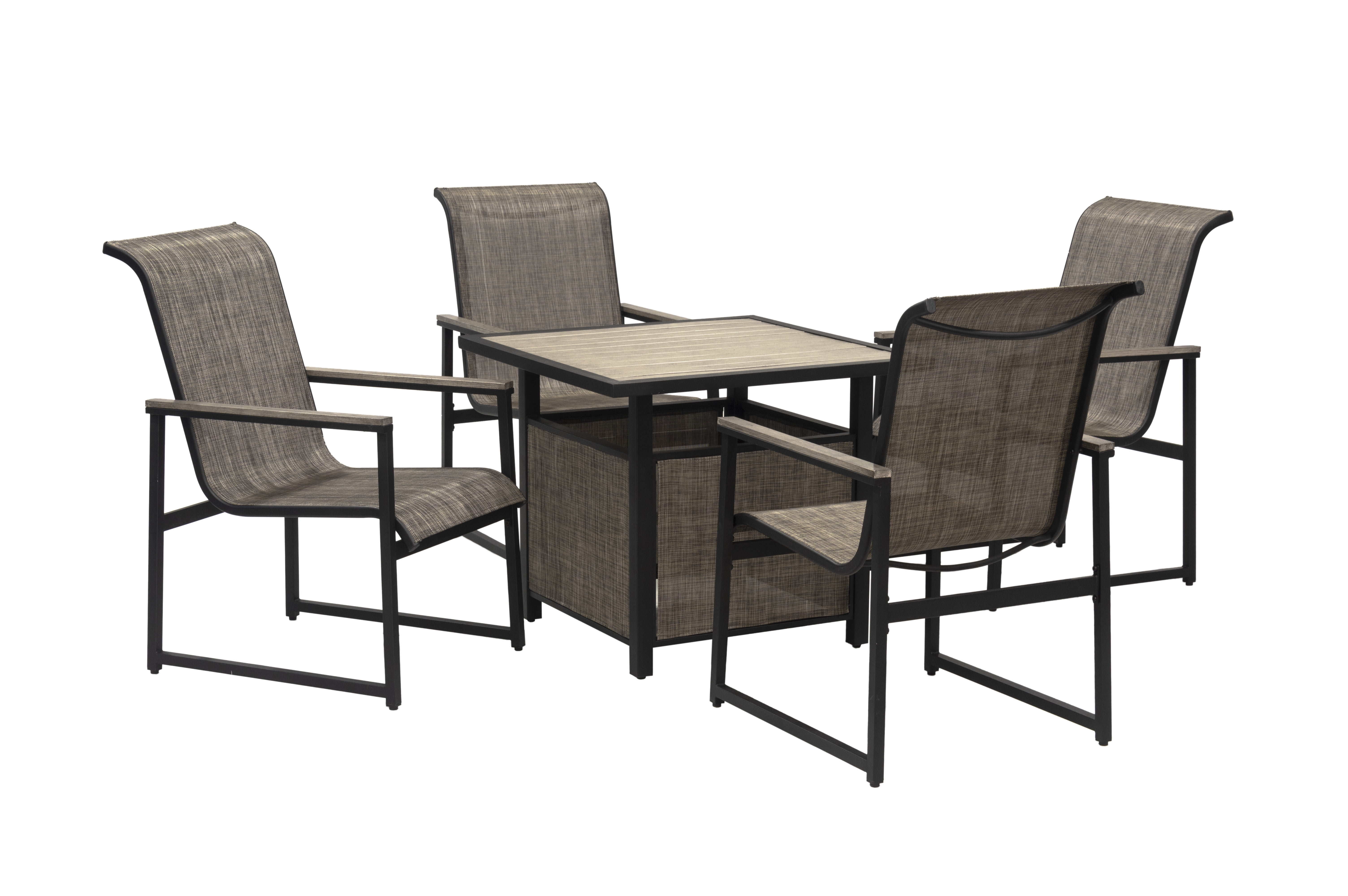This 5-piece patio set is designed for both dining and chat, its elegant and contemporary design creates the ideal outdoor dining and chat experience for your patio, garden, or pool area, this patio set includes four sling chairs with a sled base and a 32.25-inch square table. The frames are made out of heavy-duty steel and finished with a black & multi-step gray mixed powder coating, the table contains a multi-step gray finish with a slat top.