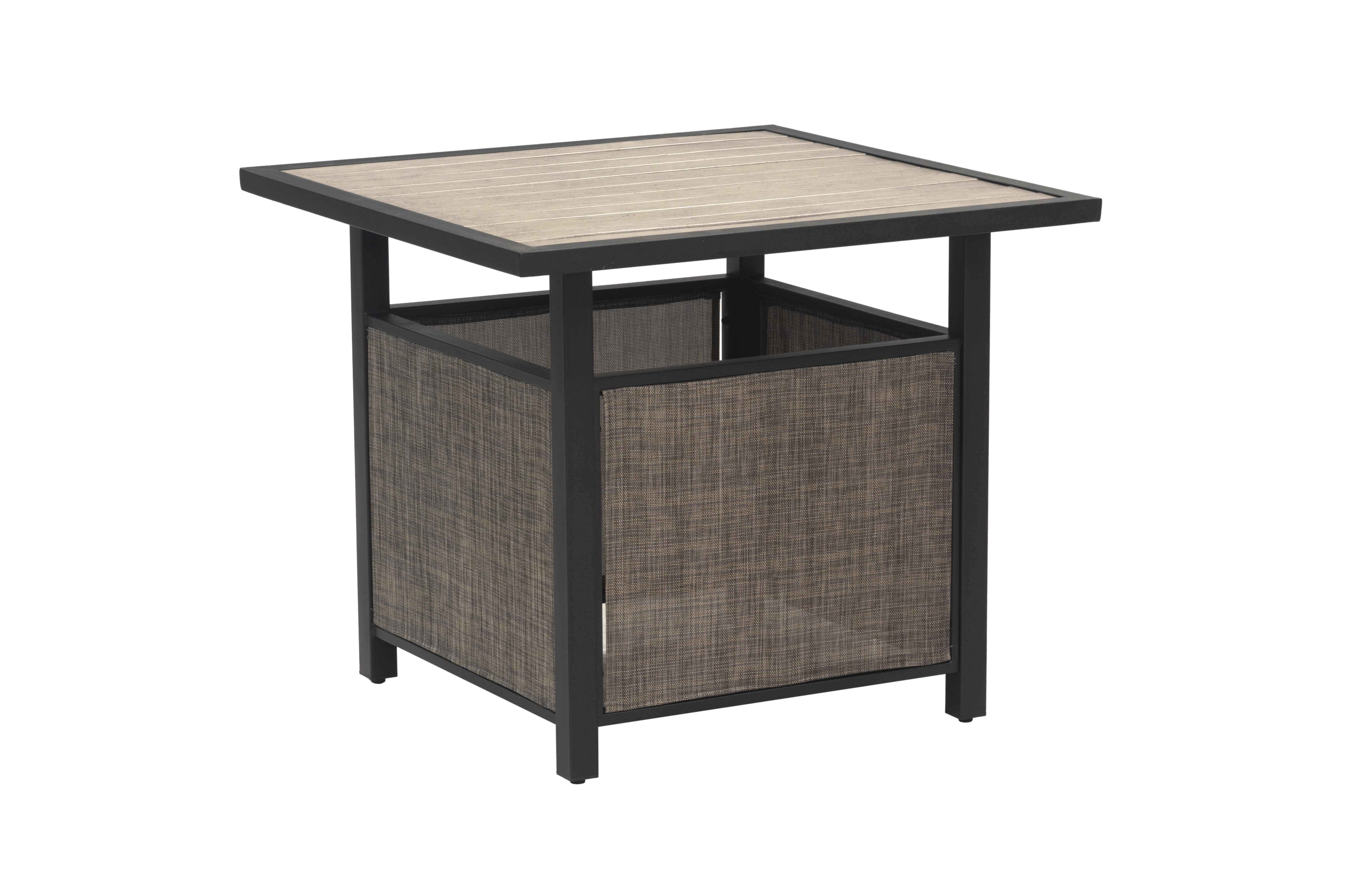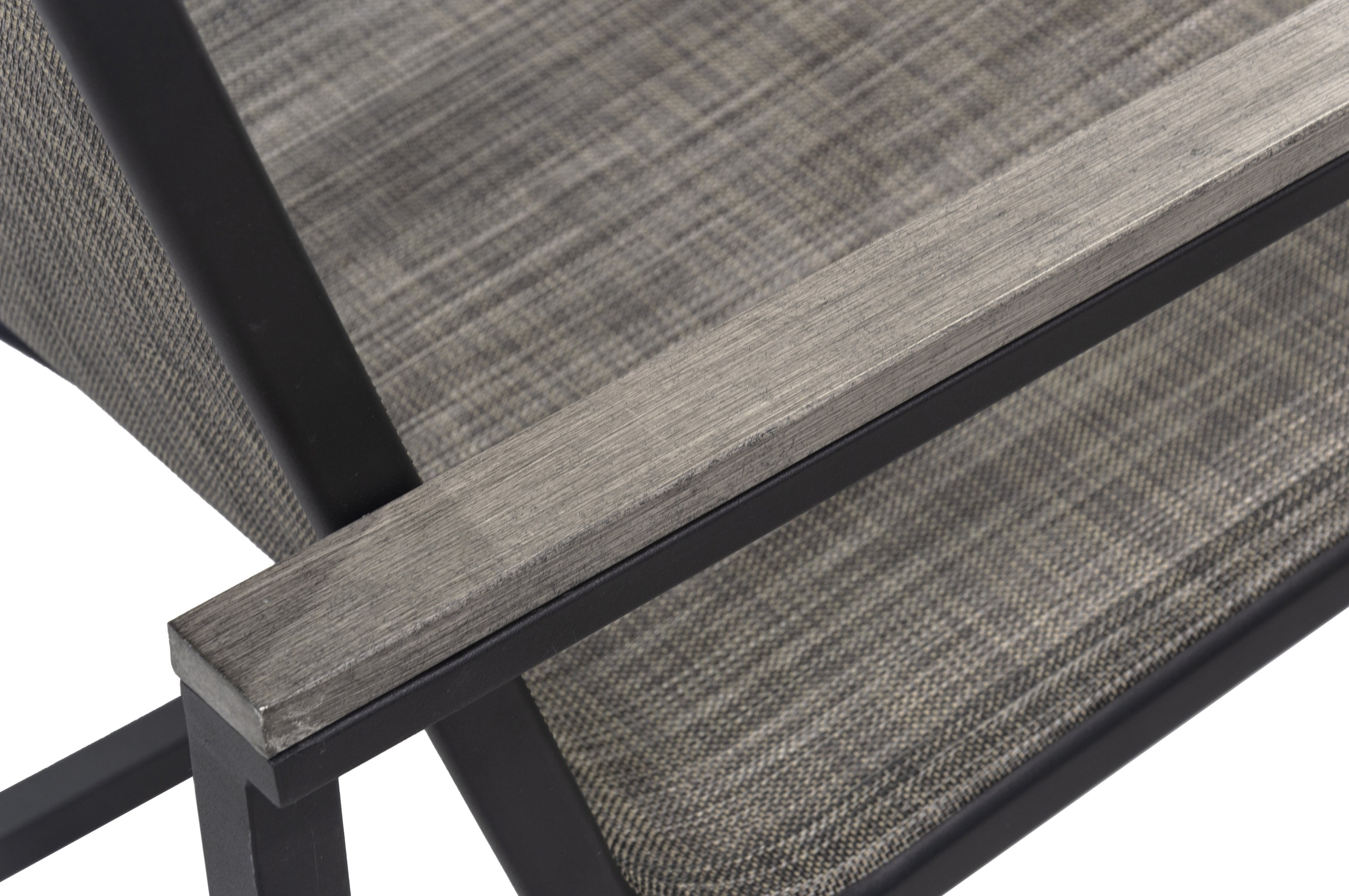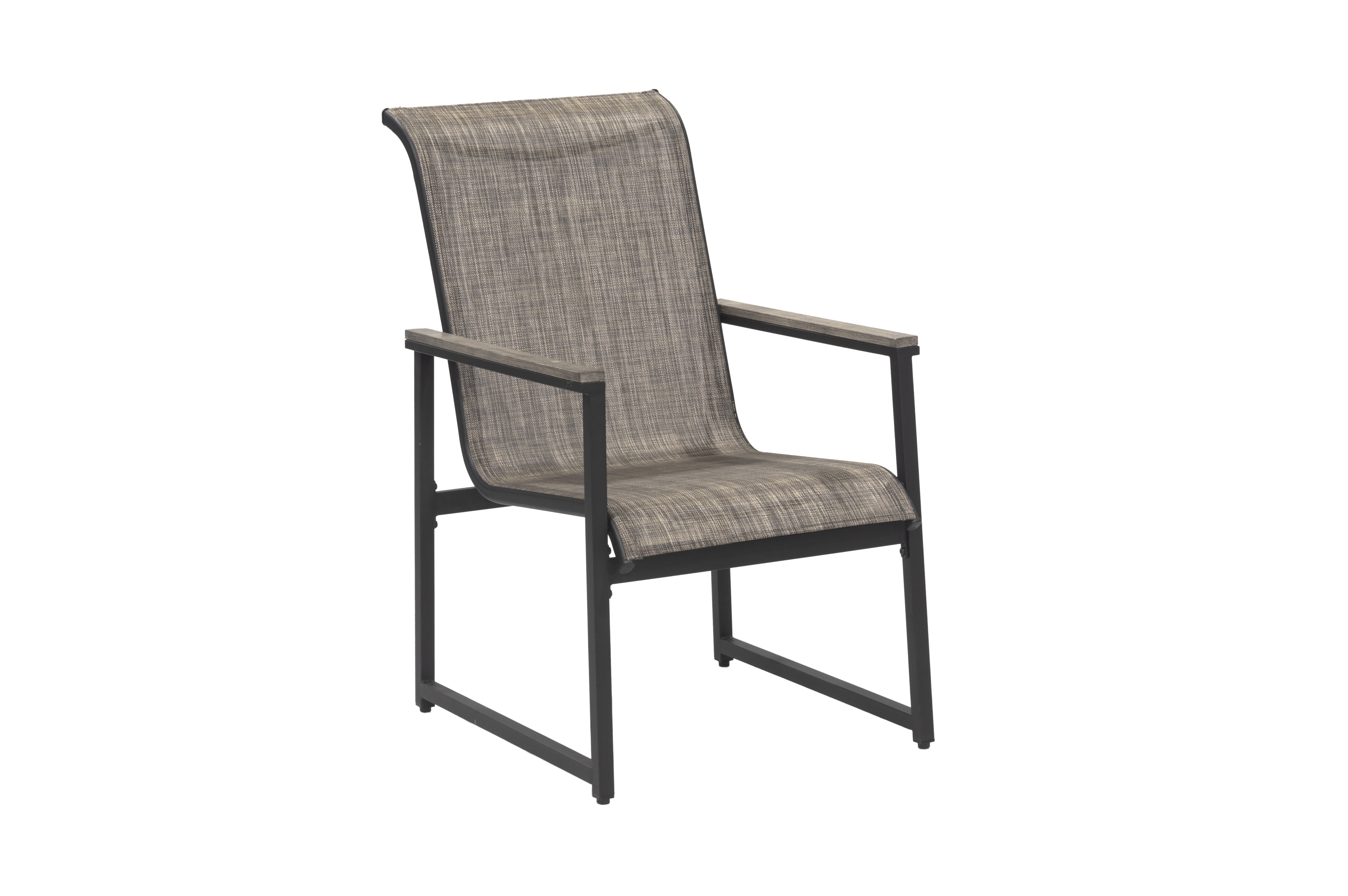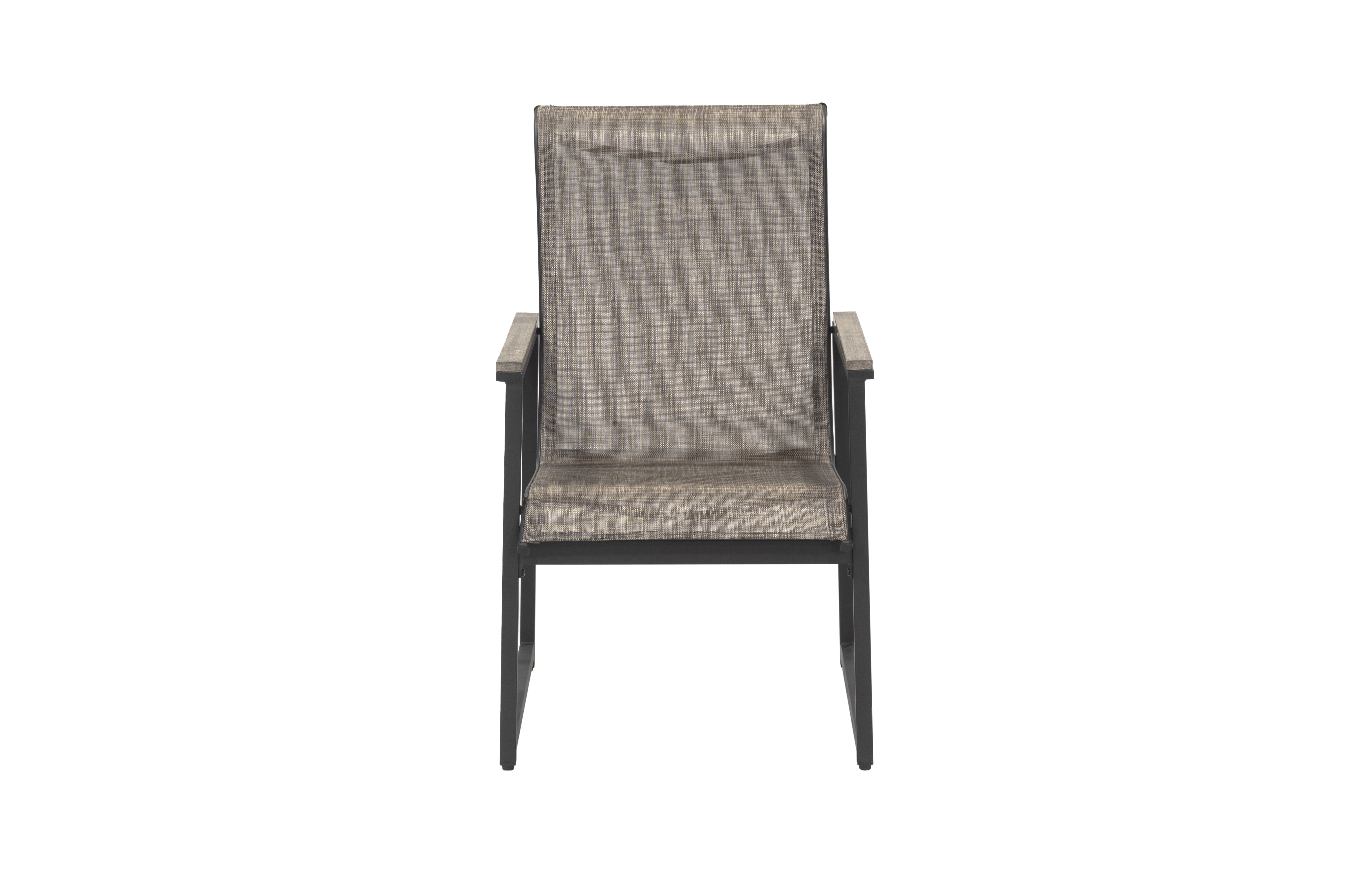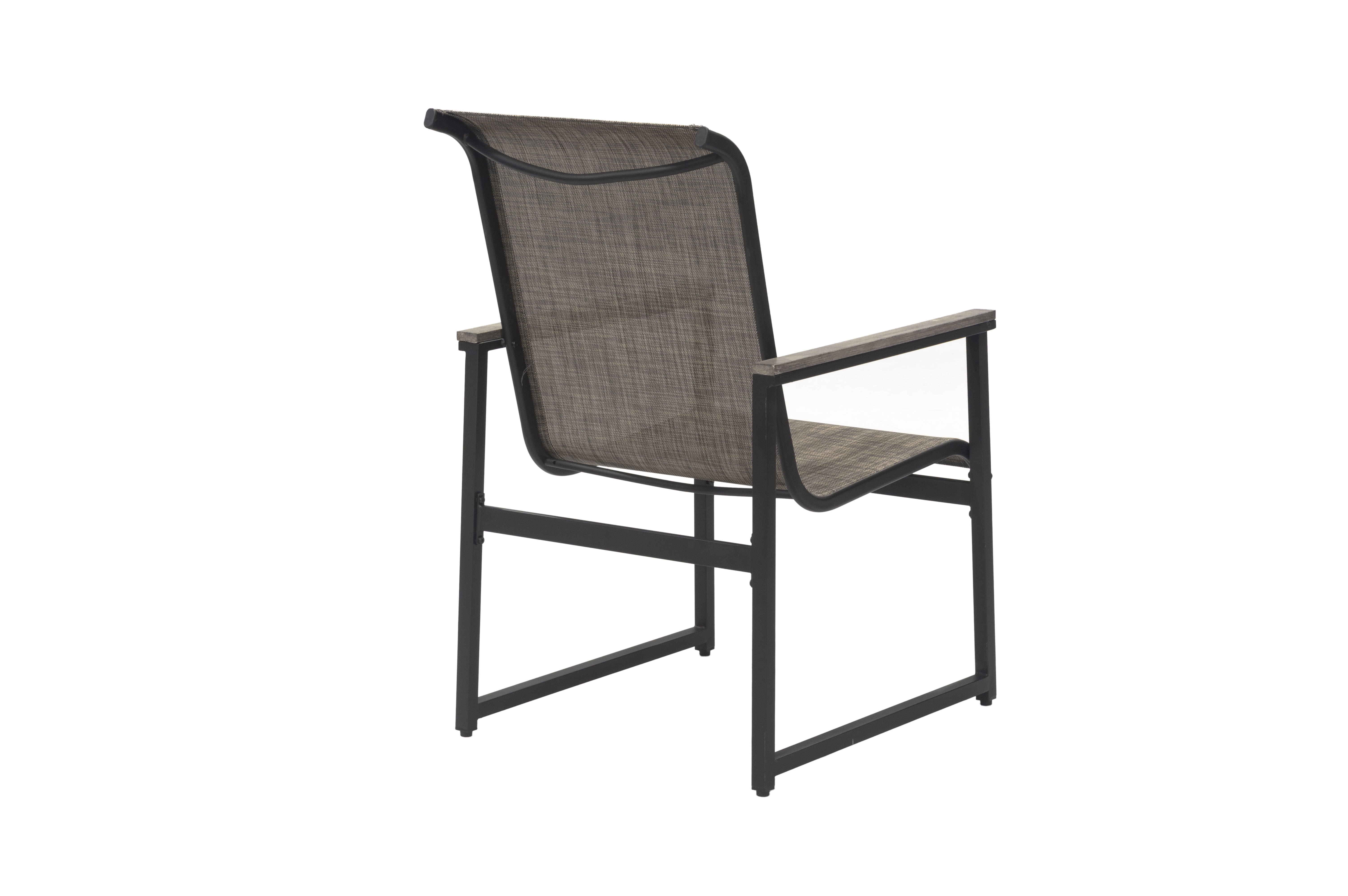 5-piece set includes 4 sling chairs and a metal slats table Powder-coated steel frame Multi-step gray finish for the arms The table features a multi-step gray finish with a slat top and 4 sling panels understructure.