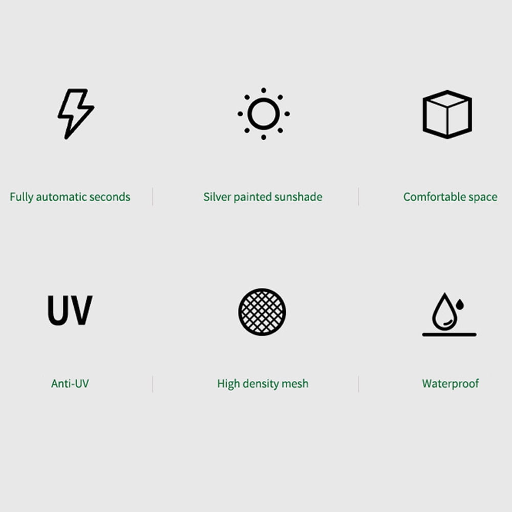 Fully automatic structure, upgraded spring support, easy to lift and pull into a tent. The outer account is made of 210D oxford cloth silver-coated material that is wear-resistant enough as the material of the tent, which is enough to meet your leisure and camping rain-proof and sunshine-proof needs. Double face each other door structure, not stuffy. The space is large enough to accommodate a family. Built-in storage mesh bag and hook for more convenient use. With a bag for easy carrying and storage.