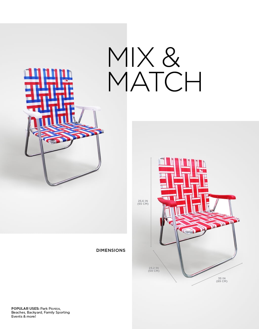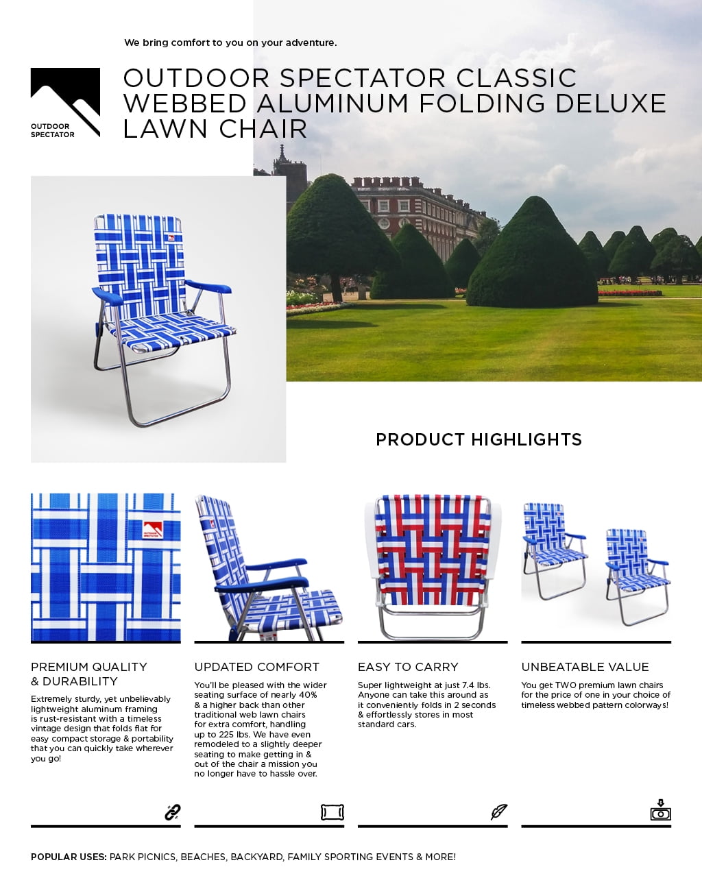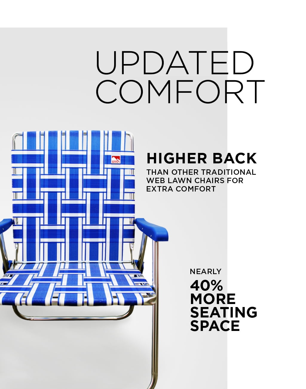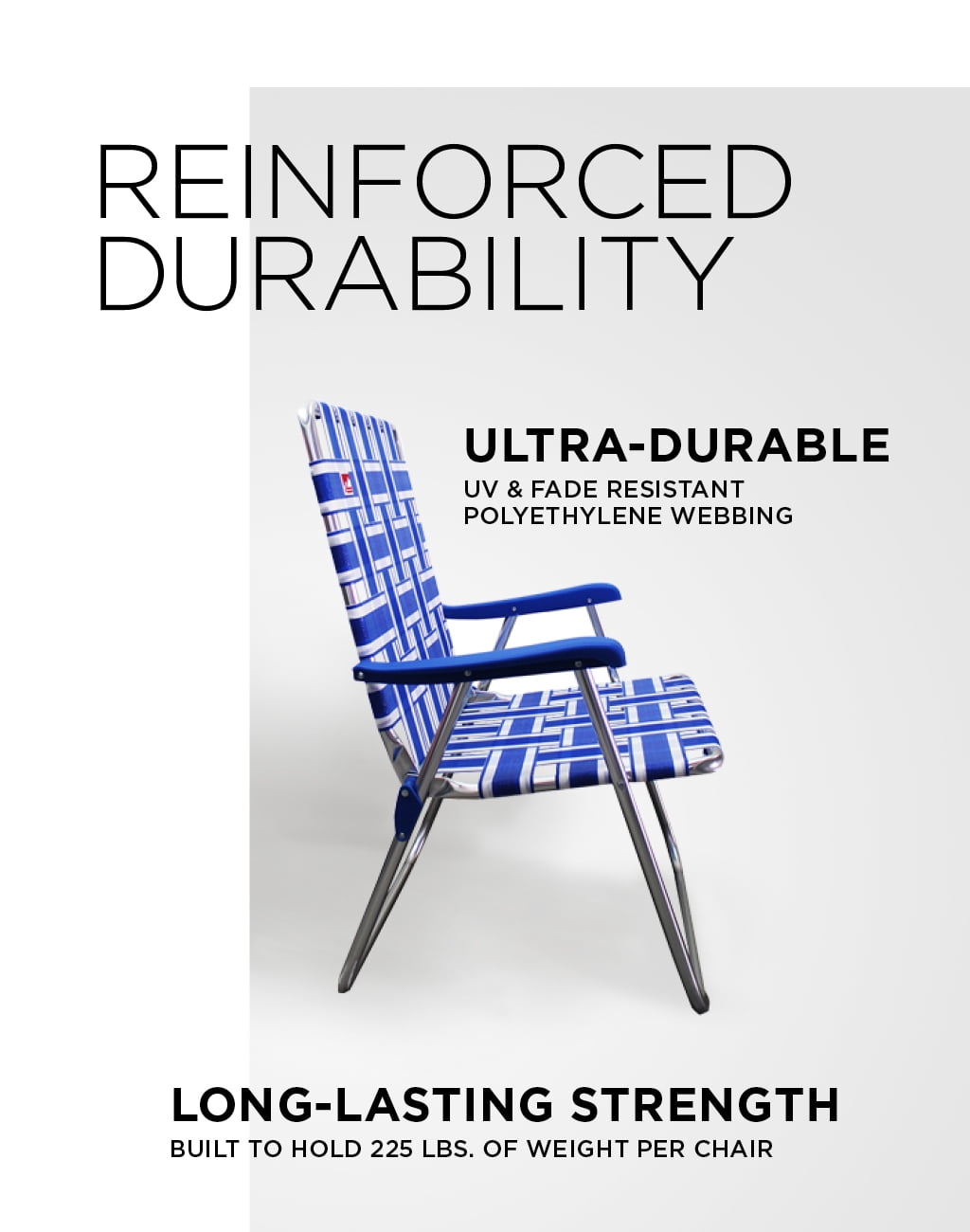 PORTABILITY: 22mm Aluminum Frame is both lightweight and rust resistant with a timeless compact fold flat storage design UV- DURABILITY: Our Ultra-Durable UV- Fade Resistant PE Webbing goes through rigorous Independent 3rd-Party Testing and Inspections to ensure it will your future classic UPDATED COMFORT: Built on the classic frame but updated for the more modern sized comfort featuring a slightly wider seat (25.5″ width), that’s also a bit deeper (23″ deep) and slightly higher back than the classic WEIGHT CAPACITY: 225 Lbs. NOTE: the webbing will slightly stretch after the first few uses