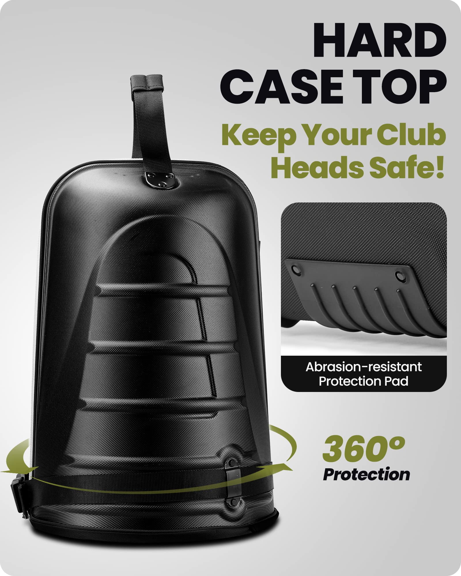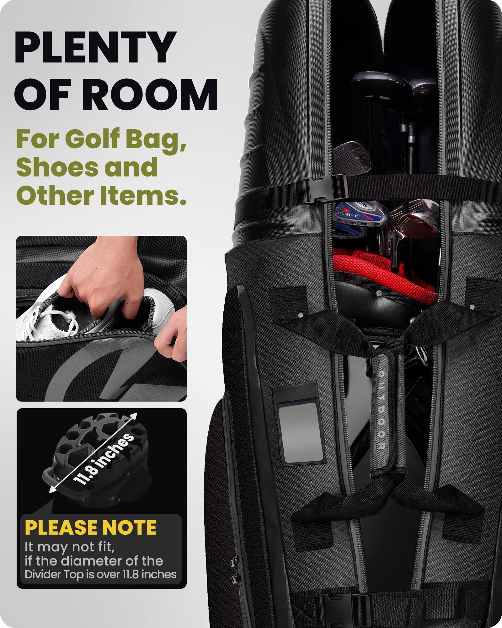 HARD SHELL CASE OFFERS MAXIMUM GOLF CLUB PROTECTION – Golf Travel Cover combines crush resistant Hard Shell ABS Top with Soft Sided all weather 1680D Ballistic Nylon Fabric Body and Unique 2x thickened cushion layer for and long-lasting durability. EASY TO MANEUVER WITH DURABLE SMOOTH ROLLING & TOUGH WHEEL – Featured with optimized in-line skate wheel and premium rubber base securing long-lasting and unobstructed carrying experience. Easy to move through a crowded airport to check it in. HOWEVER YOU PREFER TO CARRY – The golf club travel bag held up well and design to meet different conditions by adding shoulder strap, multiple handles and separated bags for golf shoes. SPACE-SAVING STORAGE – Golf travel case has plenty of room for storage. Ideal 54″ (138 CM) length and roomy design for full set golf clubs, cart bag , extra secure and stable with two fixing straps. WHAT YOU GET – 1 x OutdoorMaster Golf Travel Bag, 1 x Carry Bag, our CUSTOMER-FAVORITE 1 YEAR WARRANTY and friendly customer service. PLEASE NOTE – This golf travel case may not fit if the diameter of the divider top is OVER 11.8 inches.