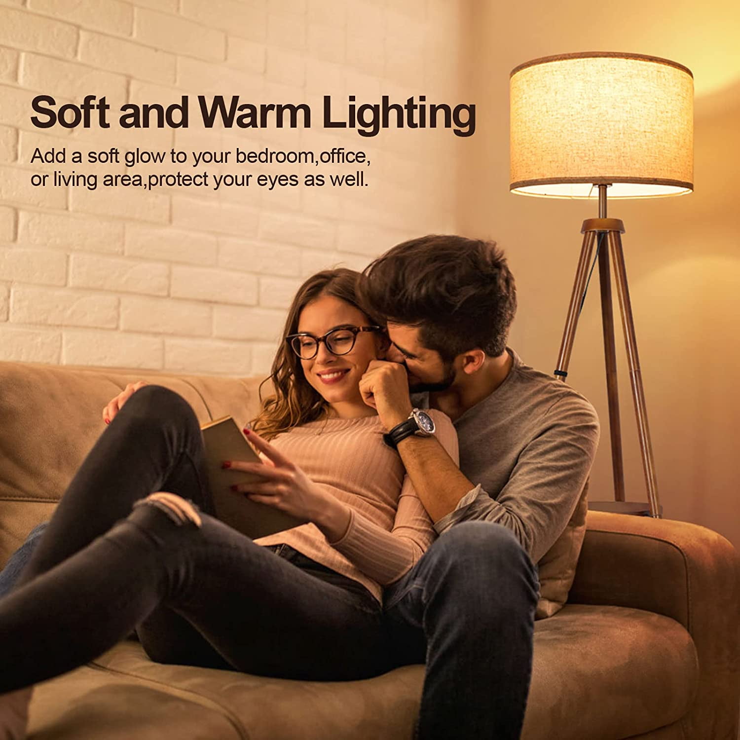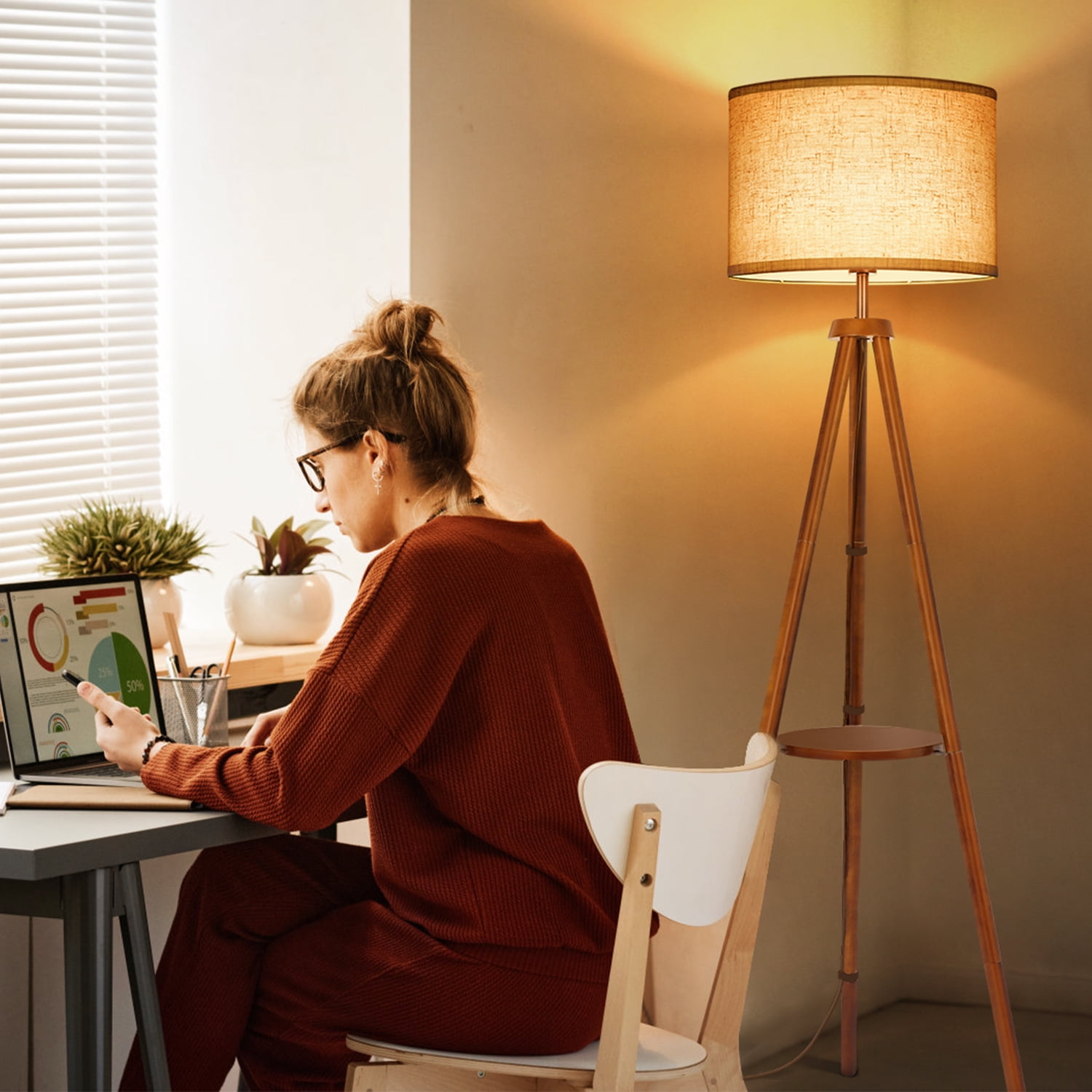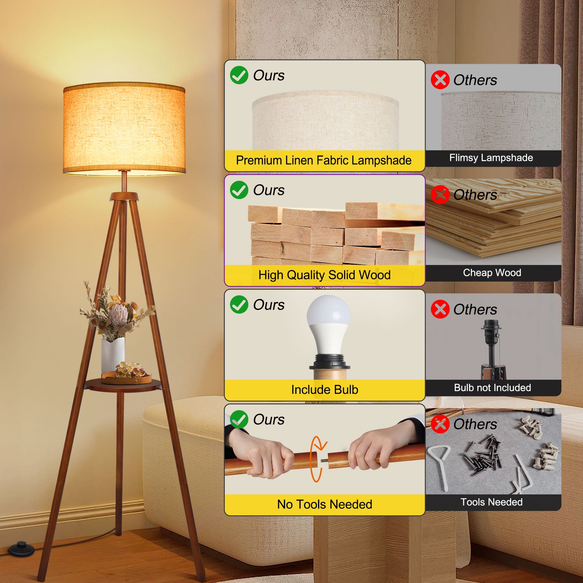 Different Lights Settings & Memory Function:The wood tripod floor lamp comes with 9W LED bulb. It offers 4 color temperatures at warm, warm white, cool white, and daylight, which can come in handy when you want different light for a late evening, or if you are setting the mood for a dinner or event. The standing lamp has a memory function to remember your last setting when you turn the lamp back on. You don’t need to cycle through every color temperature to get to the desired setting. Solid Wood & Stable Tripod Design:The modern floor lamp consists of a high-quality Nature Rubber wood tripod and durable beige lampshade. The tall floor lamp can fit into a variety of decor and adds both style and function to a mid-century or modern décor. It’s heavy and sturdy to keep the pets from knocking it over. Floor Lamp with Shelves:The shelf floor lamp features one sturdy wood round shelf, which perfect platform for showing off framed photos, figurines, or rows of your favorite books. Whether you’re going to put it in your bedroom, living room, foyer, or recreation room, it promises to serve you well. Remote Control & Foot Switch:The floor lamp with shelves adopts a combination remote control & foot switch, which is convenient for you to turn on/off the light. You can also use the remote control to adjust the brightness and color temperature without leaving the bed or sofa (with a 50ft range). In addition, you can set a 1-hour timer mode to avoid the trouble of forgetting to turn off the light. Easy to Assemble & 2 Years Warranty:The LED standing lamp is assembled step-by-step, not tools required. You can get our mid-century floor lamp assembly done within 15 minutes. We are sincerely devoted to providing our customers with 100% satisfaction with our products and services, if you have any problems when using this lamp, please feel free to contact us. Quick and friendly service will be provided!