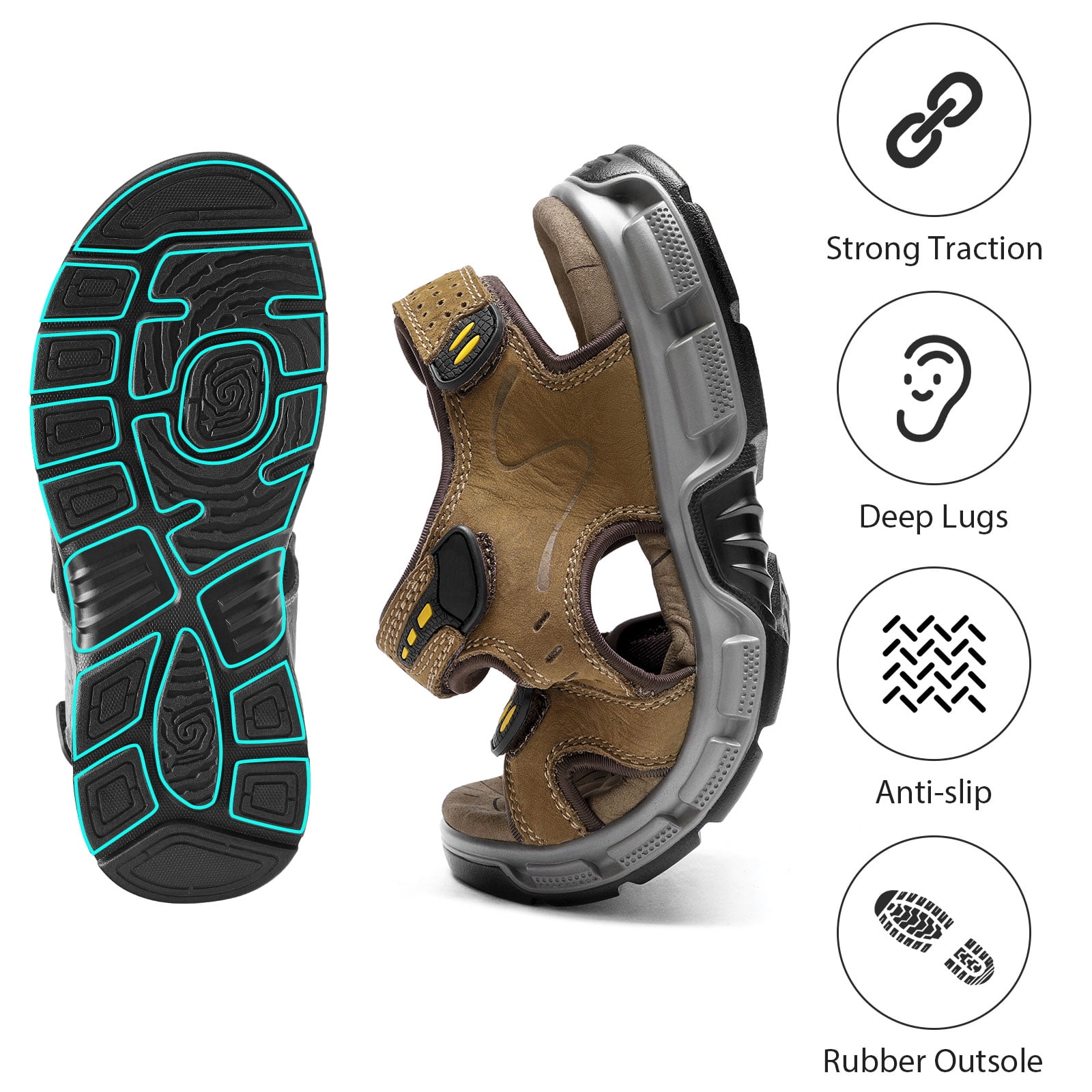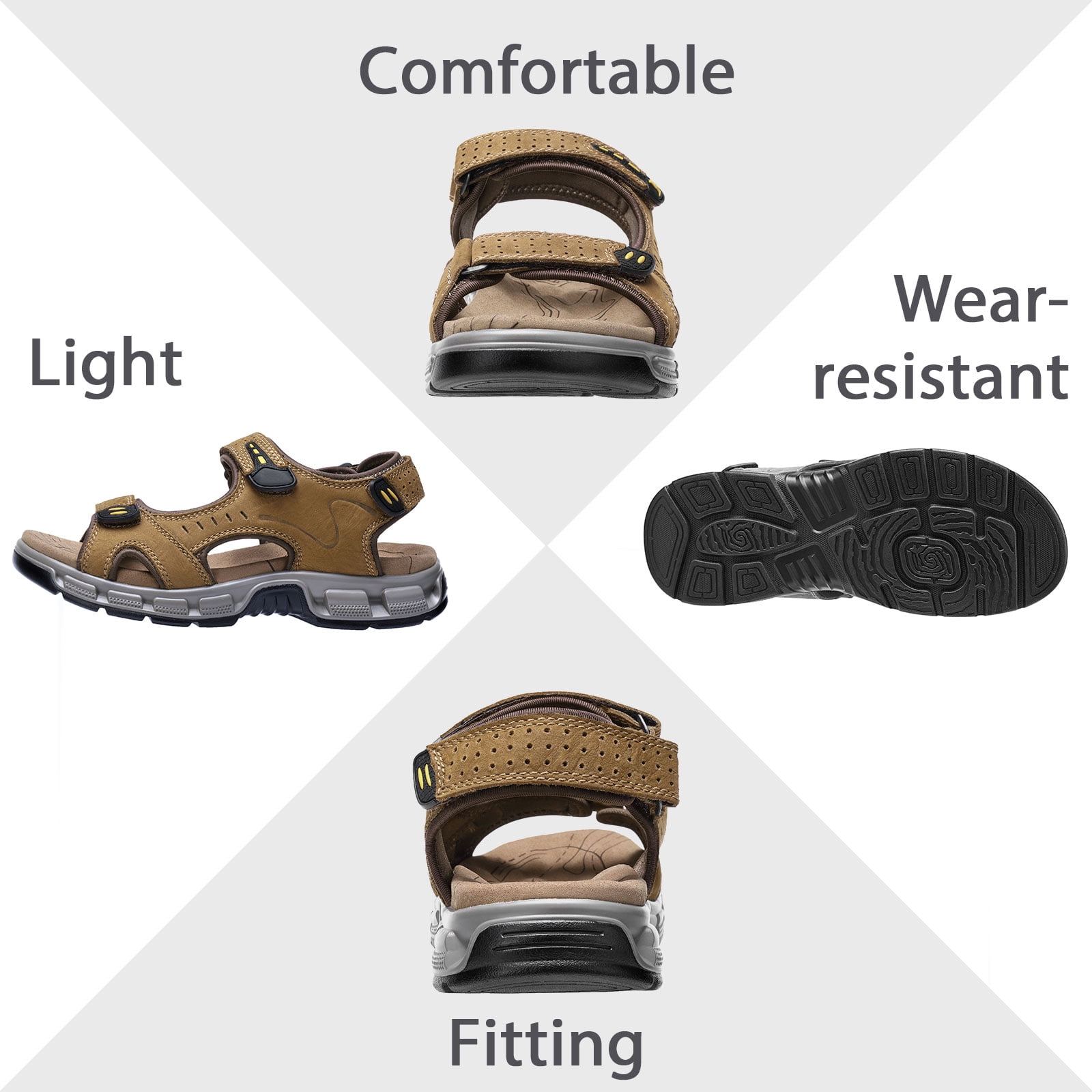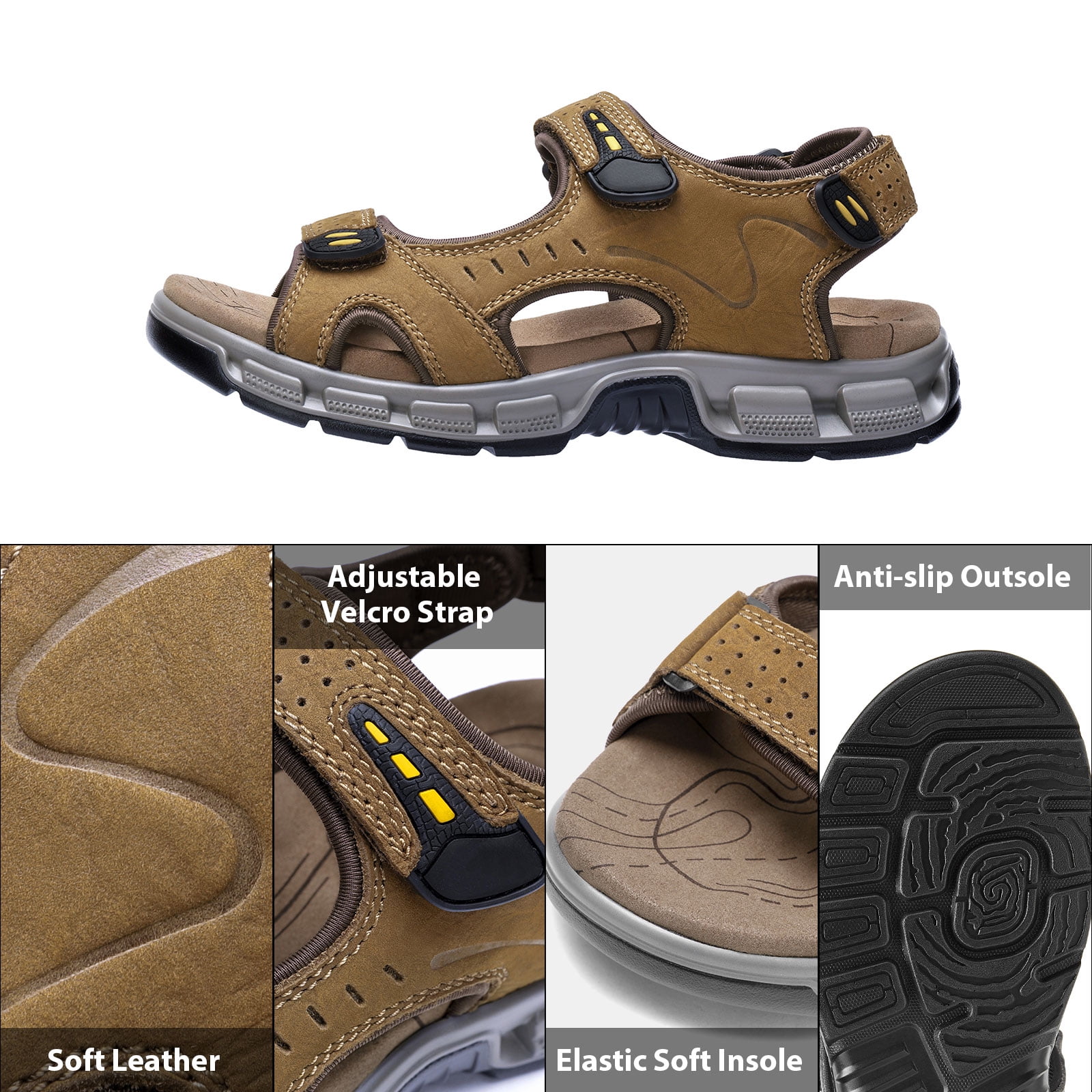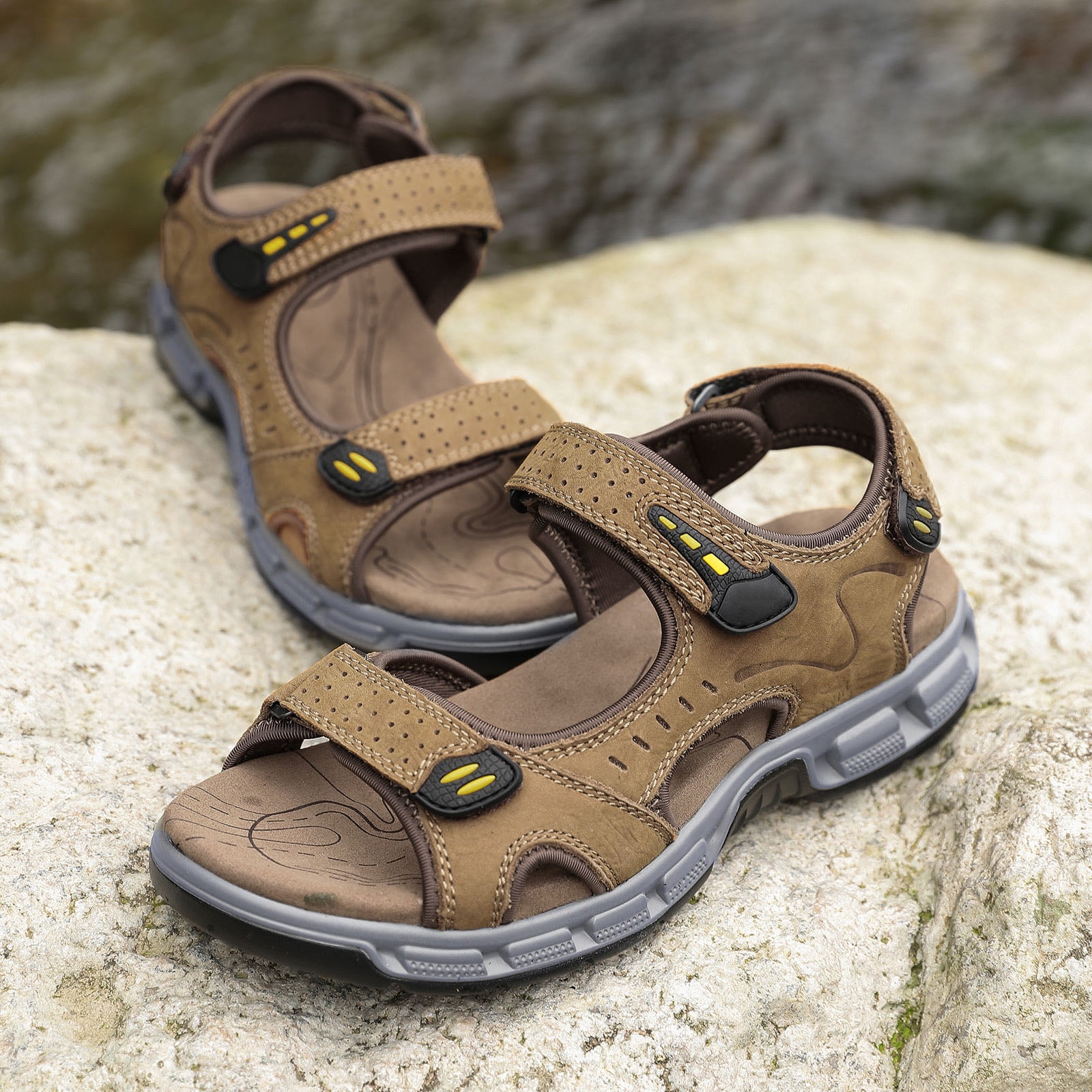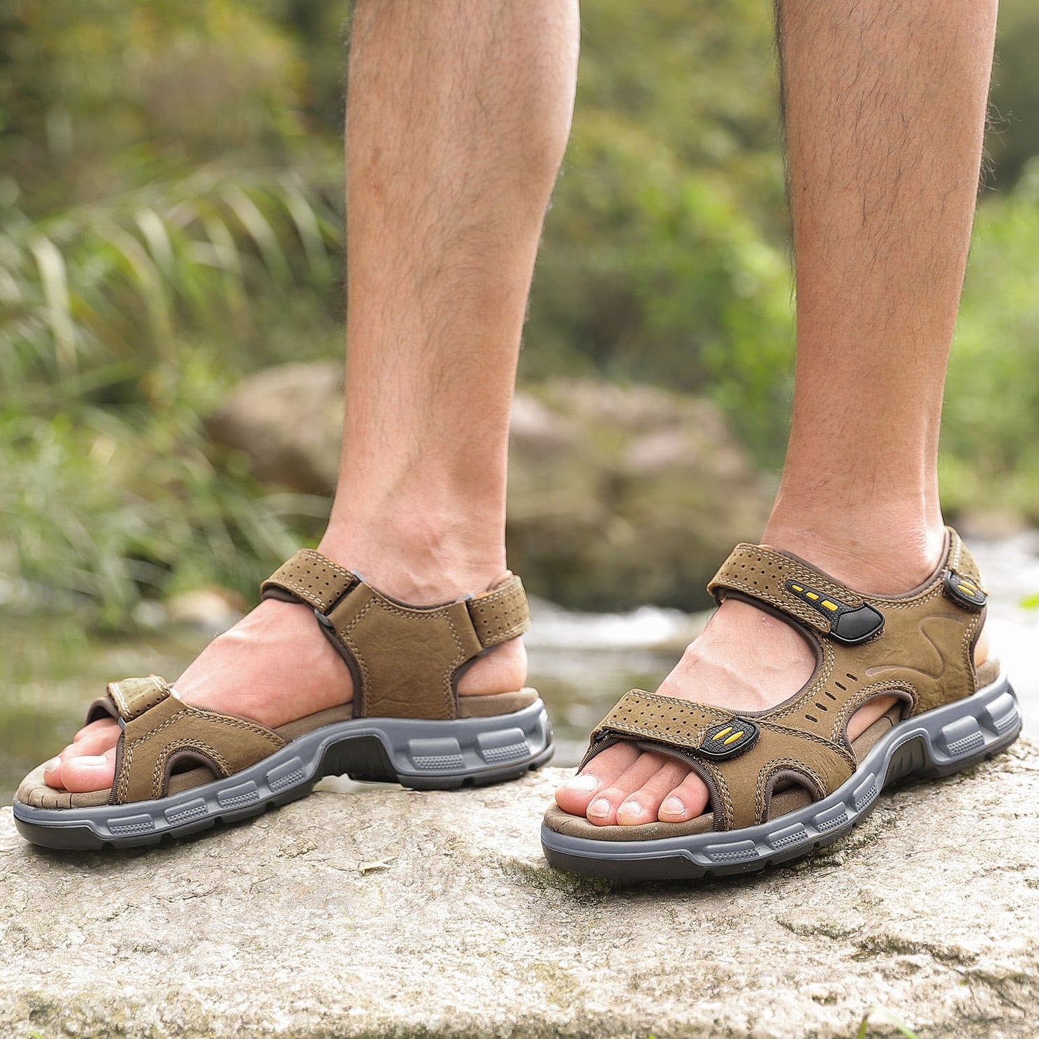 ▶ Main features: Durable and Stylish Stylish men’s hiking sandals feature a durable PU rubber exterior, providing excellent traction and grip on a variety of terrains, outdoor sandals with non-slip and wear-resistant soles Arch Support Men’s water sandals feature a microfiber MD insole, elastically cushioned midsole, providing superior comfort and arch support. Ensures all-day comfort when walking long distances Open-toe Fresh and Cool The open-toe summer beach sandals are made from premium first layer embossed nubuck leather and quick-drying stretch fabric with breathable holes for breathability and sweat wicking, keeping you cool and dry during outdoor travel and water activities. Convenient design Get a secure fit with 3 adjustable hooks and loops. Men’s sport sandals slip on and off easily for a custom fit and maximum comfort The perfect outdoor choice Comfortable and flattering, the outdoor leather sandals are ideal for outdoor adventures. Perfect for hiking, camping, backpacking, fishing, kayaking, walking, beach vacations, travel, or everyday casual wear ▶ Packing list: 1 Pair of Men’s Leather Open-toe Sandals
