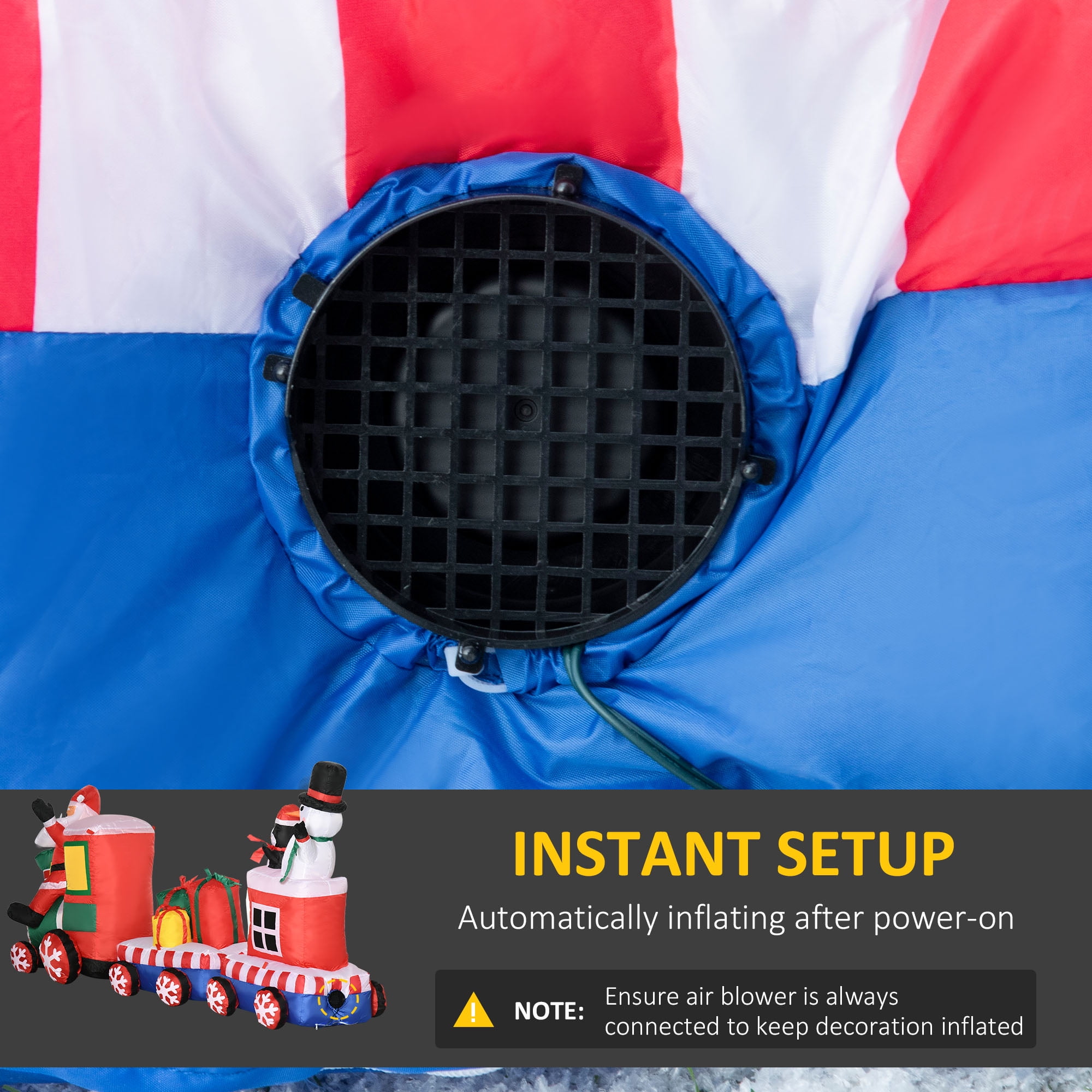 Show Your Festiveness: You and your neighbors are going to marvel at this Santa Claus, snowman and penguin with gift boxes on a train Christmas inflatable. This is going to bring your outdoor holiday cheer to new heights and provide days of glad tidings to you. Add Some (Even More) Light: Built-in white LED lights are going to ensure that your outdoor Christmas decorations are visible from here to the North Pole (okay, maybe not that far, but it’s still super-bright). These lights will illuminate every last jolly detail, taking your display to a new level of magical. Mild Rain or Snow? No Problem: For those more temperamental Christmas, you’re still going to want to display your holiday spirit. Included are eight stakes, eight drawstrings and a sandbag to keep your Christmas yard decorations from turning into a parachute in the almost-likely event of a windy night. No-Hassle Set Up: To inflate: Step 1 – Plug it in and turn the power on. Step 2 – Done. For real, it’s that easy. Unplug it, the Santa Claus, snowman and penguin with gift boxes on a train deflates. (It seriously takes you longer to put together your plate of milk and cookies.) Christmas Inflatable Information: Christmas Train Dimensions: 96″ W x 29.5″ D x 47.25″ H. Primary Color: Red Type: Inflatable Christmas Santa Claus, Snowman and Penguin with Gift Boxes on a Train Material: Polyester Cloth Overall Dimensions: 96″ W x 29.5″ D x 47.25″ H Power Cable Length: 5.9 ft Sandbag Weight: 1 lb. LED Light Count: 7 LED Light Power: 0.36 W Fan: 12 V/0.95 A Input Voltage: 120 V/60 Hz Output Voltage: 12 V/18 W/1.5 A Certifications: UL, ETL, CSA, CEC, NRCAN Item Label: 844-572V80MX NOTE: Ensure the air blower is always connected to a power source to keep the Train inflated NOTE: Do not use the inflatable outside in heavy rain, snow, or wind. Explore More Our Christmas Inflatable Products, Click and Go!