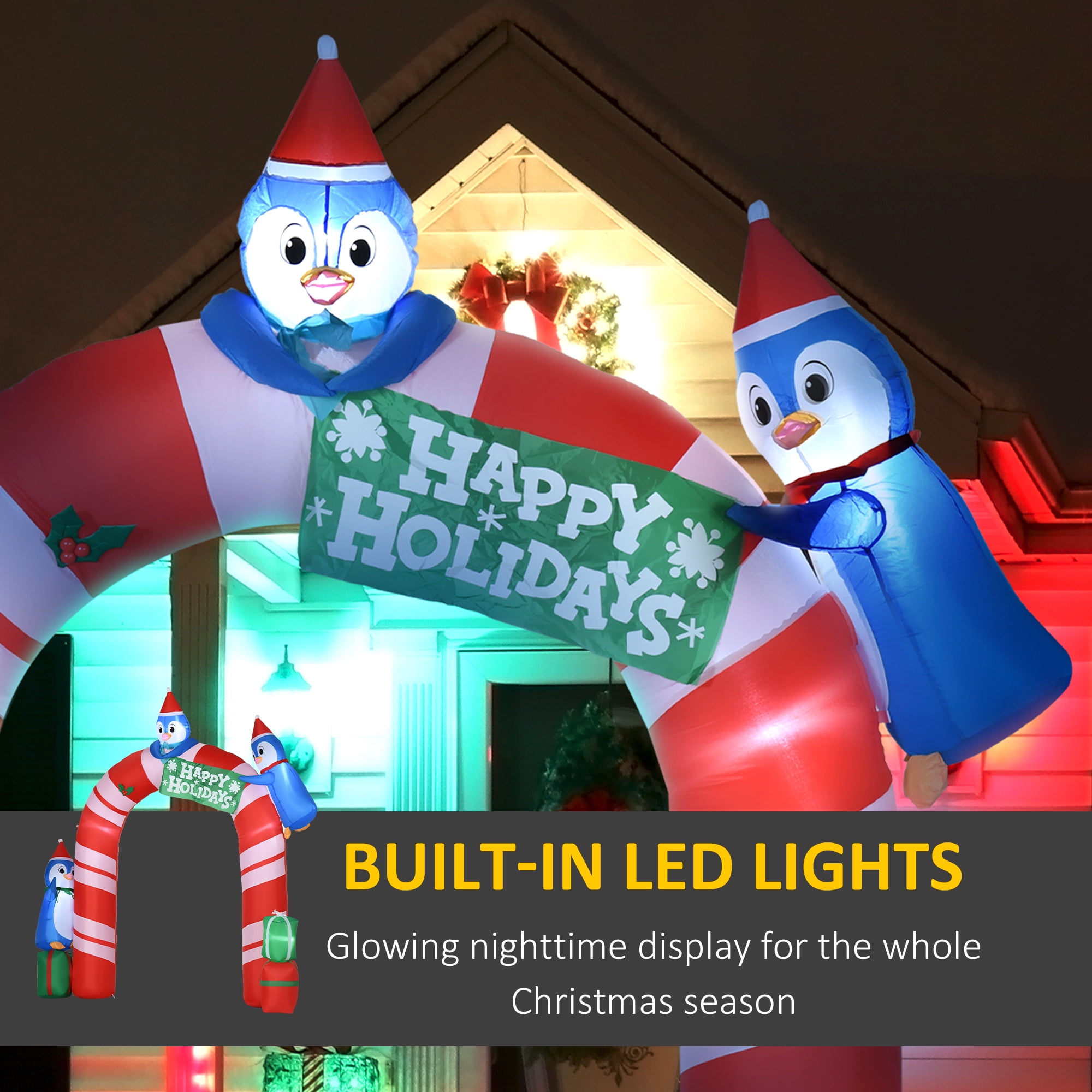 Outsunny 94.5″ Christmas Inflatable Candy Cane Archway with Three Penguins and Gift Boxes, Blow-Up Outdoor LED Yard Display for Lawn Garden