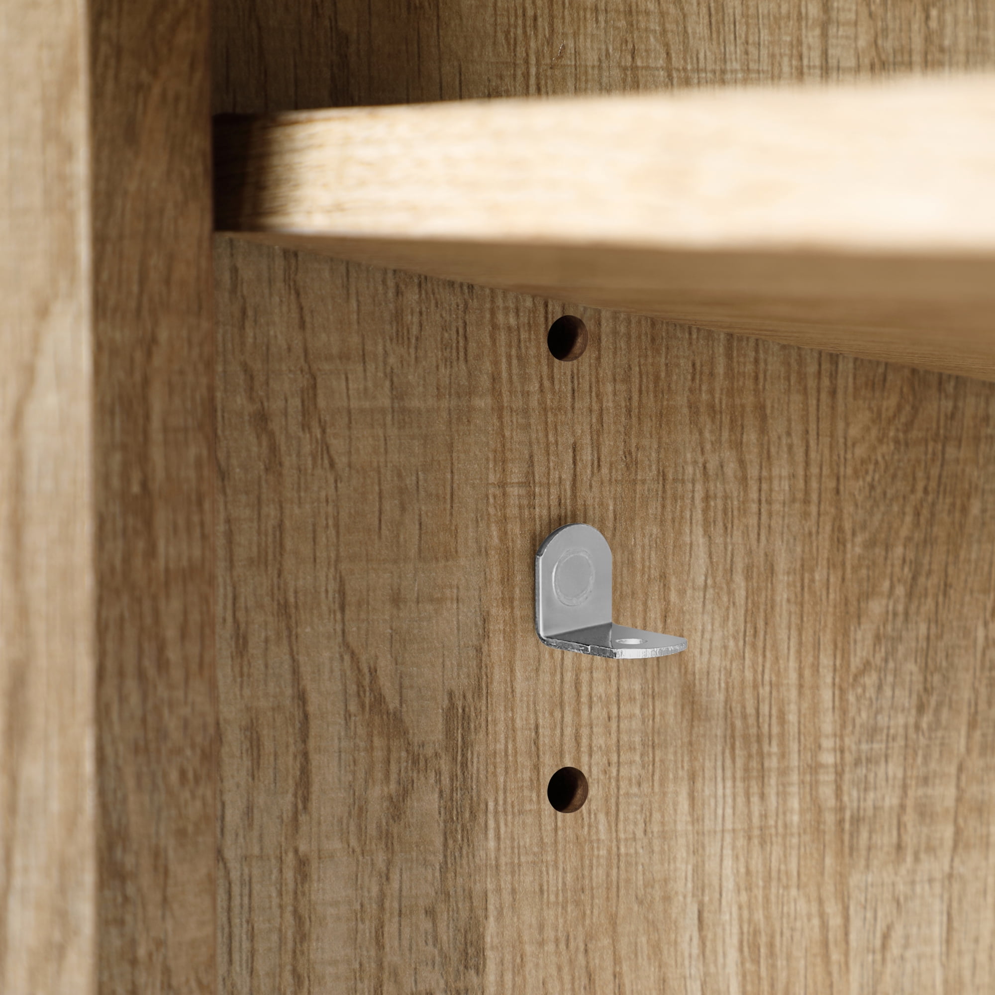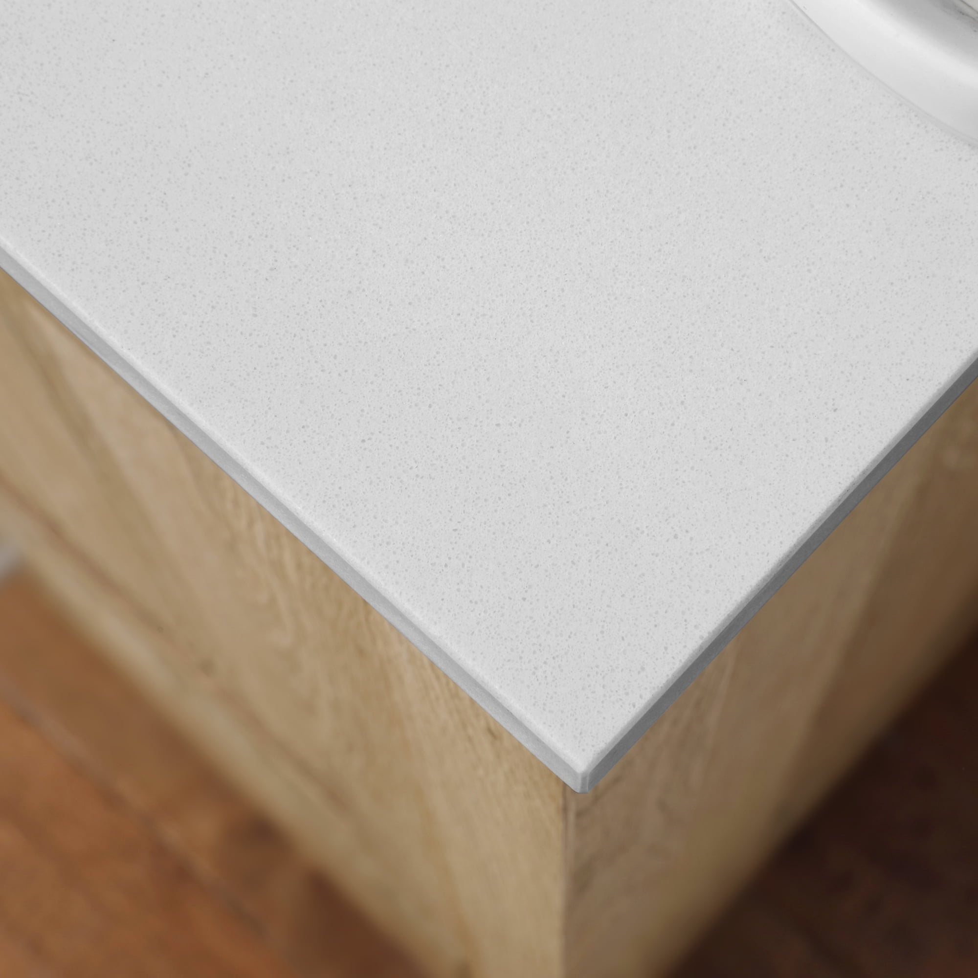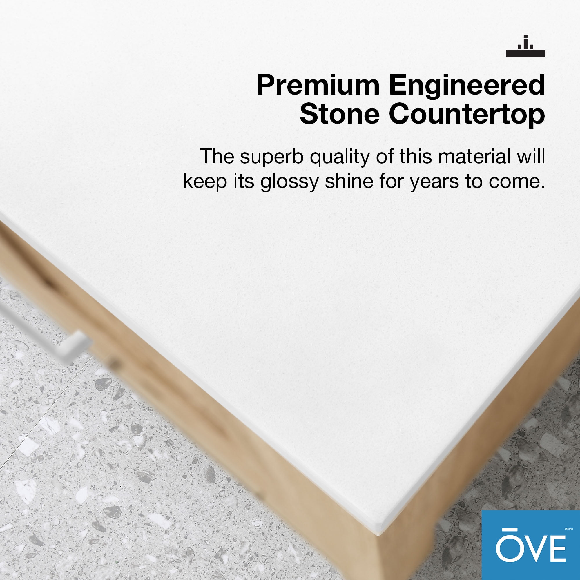 Assembled dimensions: 30 in width x 34.5 in comfort height x 19 in depth Freestanding laminated vanity with MDF construction. Adjustable leveling feet for uneven floors. Vanity top is Bombay White Engineered Marble with attached undermount rectangular glazed ceramic sink with overflow and straight edge profile. Matching backsplash included. Top comes pre-drilled for 4” faucet spread. (Faucet sold separately). Doors are slow-close with adjustable 3 way, 110 degree hinges. Adjustable interior shelf. Soft-close, ball-bearing, full extension drawer. Assembly: Cabinet and Vanity Top arrive fully assembled and are easy to install. Cabinet arrives with back cutout panel easy plumbing.