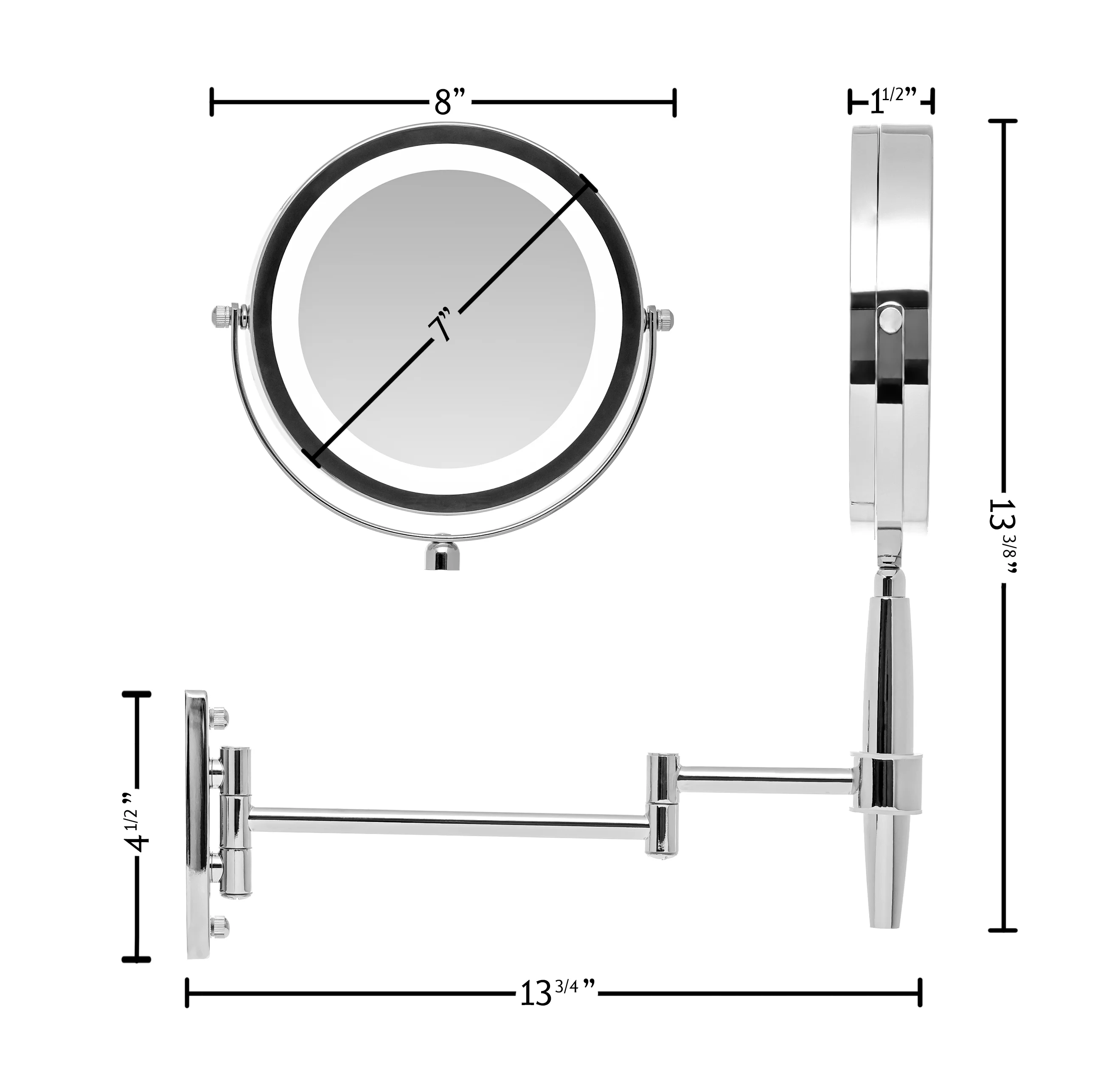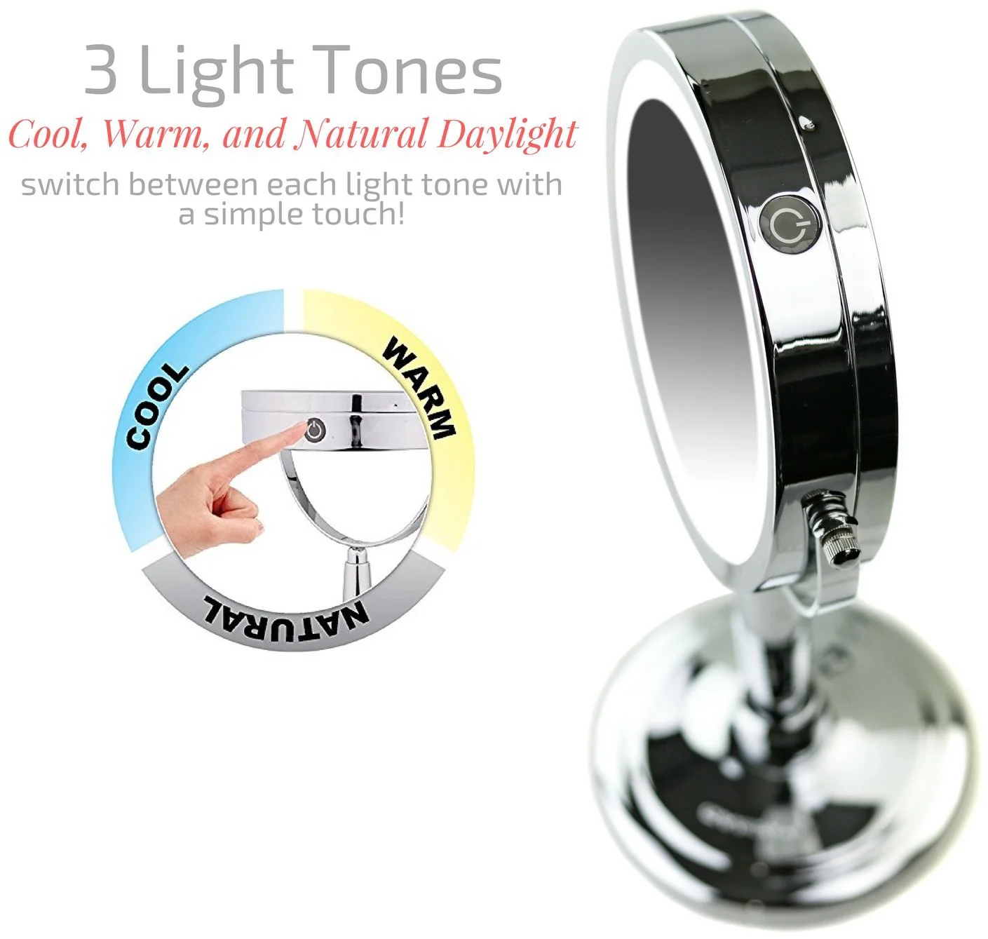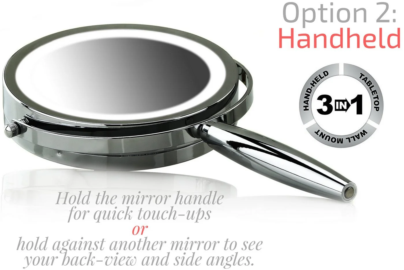 Introducing MFM Series Mirrors! This multi-use mirror can be changed seamlessly from hand held, tabletop to wall mount. It has a Three Tone Ring LED light that changes with a touch of the mirror: cool, natural and warm tones. You can pull or flex the swinging extension to many angles. This flexible electric magnified lit looking glass allows you to see up close so you can absolutely see your eyebrow and facial hair much more clearly. It has a great look for personal style but also emits a professional top notch brightness that’s perfect for any desk, shower, desktop or counter and because it can also be hands free, it’s also convenient for any home, bedroom, hotel, dental, shower, and facial needs. This cute countertop mirror can be great for many décor, including vintage, Hollywood, medical, or anything that involves beauty and cosmetics. Having a strong bright wall mountable mirror is perfect for bathroom, restroom, grooming, shaving, haircut and vanity needs. This mirror is powered by 4 AAA batteries (not included) for a cordless and clutter-free environment. Use it at home for a modern look for the master bath or even help keep everything hands free by keeping one less thing off the countertop. Use it as a portable option for any traveling, big or small. Its ability to magnify, show off your accessories and continue a salon & spa experience at home makes this a consumer preferred product. Ovente’s MFM Series 3 IN 1 Wall Mount, Tabletop and Handheld Mirror is available in: 2 Deluxe Finishes: Nickel Brushed and Polished Chrome 2 Size Offer(s): 7 Inch and 8.5 inch 2 Magnification Offer(s): 1x5x and 1x8x