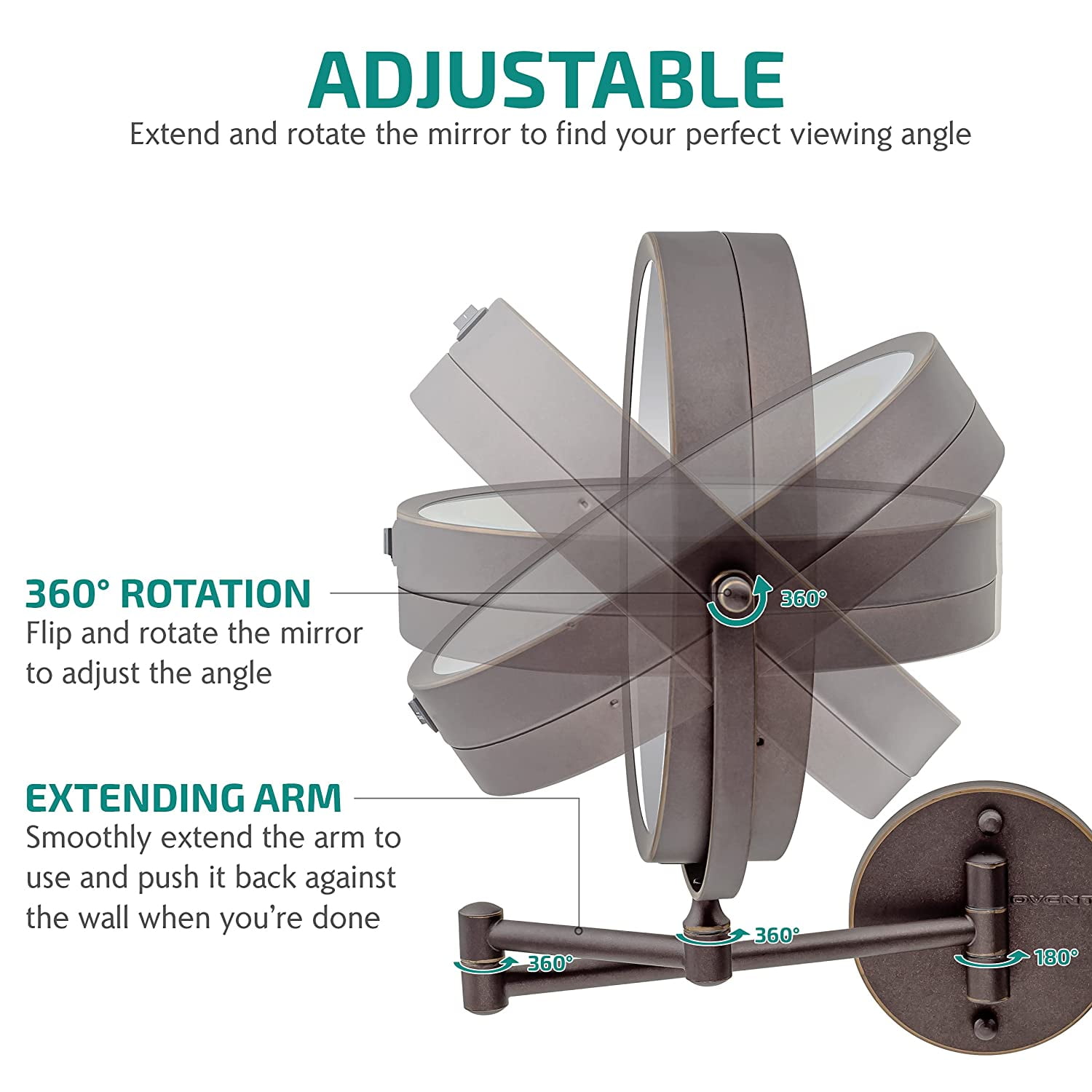 Easy to use: This dual-sided 360-degree rotation design cosmetic wall mount vanity mirror features 1x magnification on one side and flip for a 10x magnifying view. 1x for full view and 10x allows you to fix even the smallest detail to achieve that perfect look. Cool Tone Lighting: Natural white LED light last longer than other competitors while using less electricity helping you to save money. No bulb replacement needed as this bulb will last the entire lifetime of the mirror. Extending Arm: Perfect for anyone tight on vanity counter space, this mirror is designed with an extending arm that you can smoothly extend and pull out. Once you’re done, you can fold the arm and push it back against the wall again. Cordless: This mirror is powered by 4 AAA batteries (not included) which gives a clean space and clutter-free environment. 1-Year warranty on Domestic (USA) Repairs and Replacements on workmanship and materials from date of purchase from authorized reseller. International inquiries please contact manufacturer customer service directly for better assistance. 8.5″ Viewing Space, Dual-Sided & 10x Magnifying -This Two Sided 360° swivel design luxury mirror features 1x & 10x magnifications. 1x (full face view) and 10x (to see every detail up close) 13″ Extension from wall w/ Diffused White LED Ring Light – Long lasting and energy efficient light bulbs that simulates natural daylight lighting. Extendable arm for your convenience. Concave Lens – Creates the magnification side. For clear, undistorted view, look into the mirror at 4.2 inches or closer. (See Maximum Distance Recommended Guide) Battery Powered – Operate as cordless, using only batteries (not included). Twist & Pull to remove face of mirror to reveal battery compartment. US-based Customer Service: Ovente warranties that the product shall be free from defects in material & workmanship under normal use & conditions, for 1 year from the original purchase date.