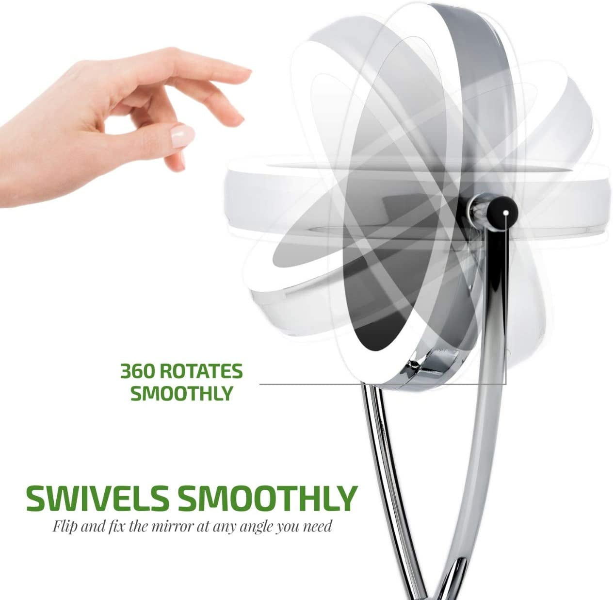 This handheld countertop mirror is built with a 7.5″ spinning face and two-sided swivel, 1x 5x zoom. It has a Dimmable Cool, White Tone Ring LED light that allows you to the closest to natural or daylight lighting. This tabletop standing mirror has an Acrylic Edge that’s great for personal style but also emits a professional top-notch brightness that’s perfect for any desk, shower, desktop, or counter. This cute adjustable countertop mirror can be great for many decors, including vintage, Victorian, Hollywood, medical, or anything that involves beauty and cosmetics. It’s a classy addition for bathroom, bedroom, grooming, shaving, and vanity needs. It gives a chic modern look for any master bath, hotel, dental, and shower needs. It is operated by 4 AA (not included) or 2- Port USB (included). This magnified electric chargeable lit-looking glass allows you to see up close so you can absolutely see your eyebrow and facial hair, much more clearly. Use it at home or as a portable option for any traveling, big or small. Its ability to magnify, show off your accessories, and universal salon feeling for women, men and kids, is sure to bring an influx of positive high-end energy to any room; great for Feng Shui. Ovente’s MLT75 Series Table Top Cosmetic Mirror is available in: 2 Deluxe Finishes: Nickel Brushed and Polished Chrome 1 Size Offer: 7.5 inch 2 Magnification Offers: 1x5x and 1x10x