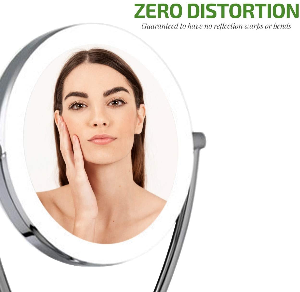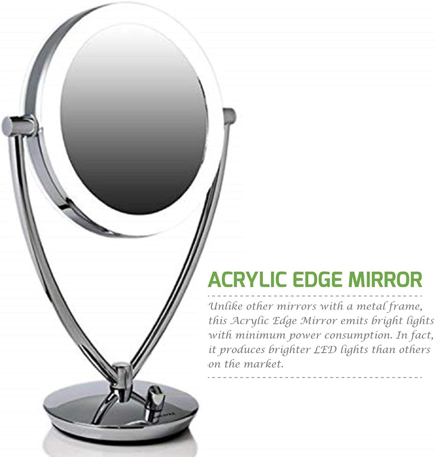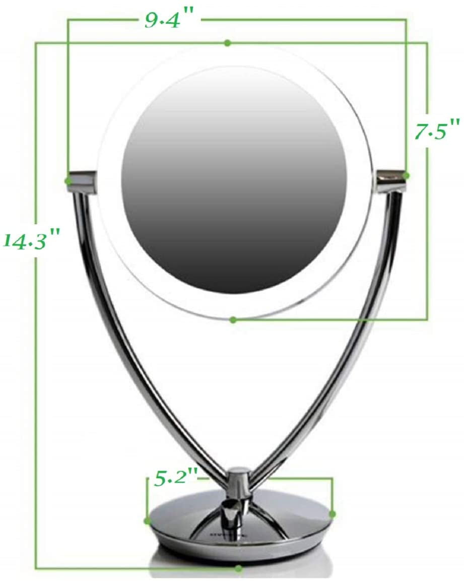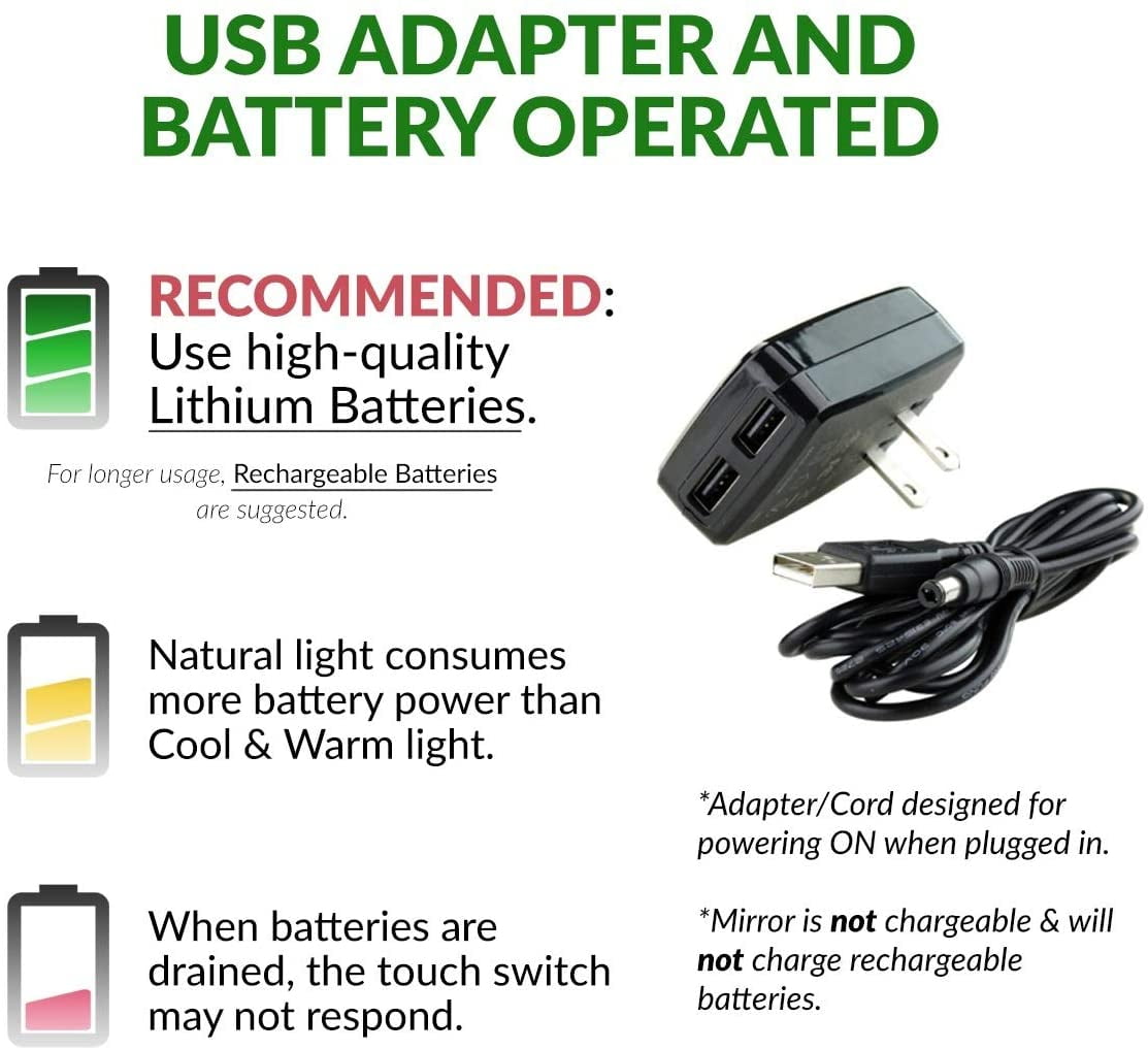 Dual-sided & 5x Magnifying – This dual-sided 360-degree swivel design luxury mirror features 1x & 5x magnifications. The 1x provides a view of your face all at once and 5x for precision, because every detail counts. Acrylic Edge & Distortion-Free View – Unlike other mirrors with a metal frame, this Acrylic Edge Mirror emits bright lights with minimum power consumption. Look 12 inches away for a distortion-free view. This means this mirror will not stretch or shrink in its reflection. Dimmable LED Lights – Last longer and use less electricity than all other types of lighting, helping you save money. The cool-tone lights are also dimmable by turning the knob on the base, giving you full control. Battery or 2 Port USB powered – This mirror is operated by either 4 AA batteries (not included) or a 2 Port USB adapter & cord (included). The 2-Port USB adapter even allows you to charge your phone while using the mirror. US-based Customer Service: Ovente warranties that the product shall be free from defects in material & workmanship under normal use & conditions, for 1 year from the original purchase date.