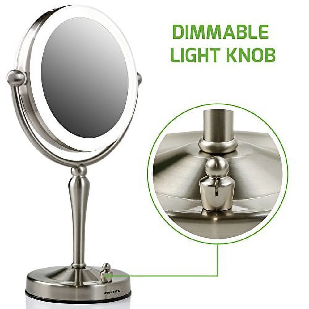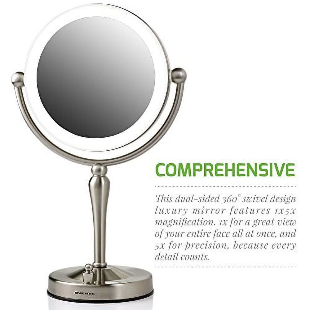 Ovente Lighted Makeup Mirror Tabletop 7.5” 360 Degree Double Sided Spinning 1X 5X Round Magnifier, LED with Dimmer Switch, Acrylic Edge, Battery & USB Adapter Operated, Nickel Brushed MKT75BR1X5X