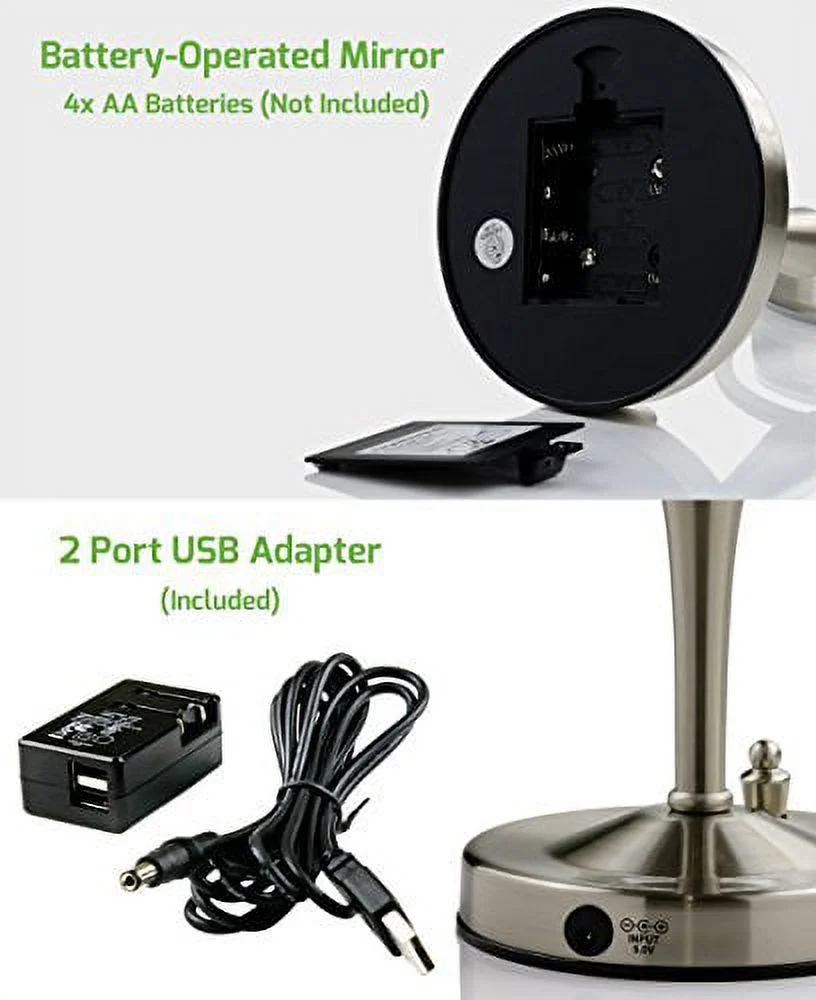 Dual-Sided & 5x Magnifying – This Two-Sided 360-degree swivel design luxury mirror features 1x & 5x magnifications. 1x (full face view) and 5x (to see every detail up close). Dimmable Diffused White LED w/ Acrylic Edge – Helps to produce brighter glow. Use dimmable light knob to dim white tone ring lights (simulates natural daylight); gives you full control of intensity. Concave Lens –Creates the magnification side. For clear, undistorted view, look into the mirror at 12 inches or closer. (See Maximum Distance Recommended Guide) 4 AA Battery & 2- PORT USB – Can be cordless, using only batteries (not included) or, operated by 2- PORT USB Adapter and cable (included) which allows you to charge a device while using the mirror. US-based Customer Service: Ovente warranties that the product shall be free from defects in material & workmanship under normal use & conditions, for 1 year from the original purchase date.