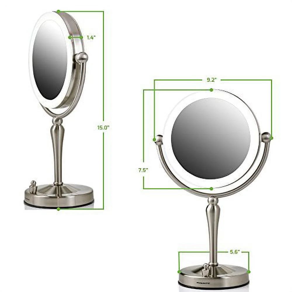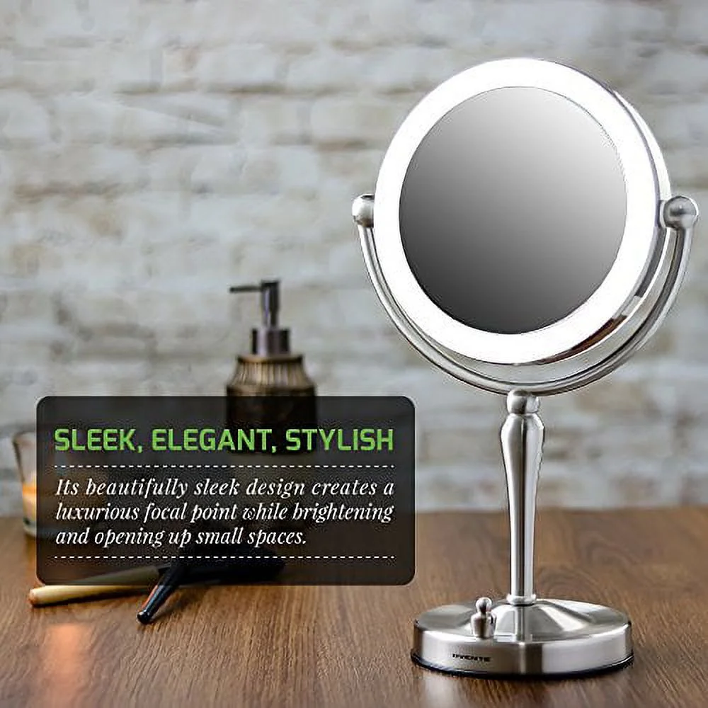 This cute adjustable makeup vanity with light mirror can be great for many décor, including vintage, Victorian, Hollywood, medical, or anything that involves beauty and self-care. This bathroom mirror with LED light is a classy addition for bathroom, bedroom, grooming, shaving and vanity needs. This countertop vanity makeup mirror gives a chic modern look for any master bath, hotel, dental, and shower needs. It is operated by 4 AA batteries (not included). This magnified electric lit looking glass allows you to see up close so you can absolutely see your eyebrow and facial hair, much more clearly. Use it at home or as a portable option for any traveling, big or small. It is sure to bring an influx of positive high end energy to any room for everyone, including girls, boys and kids. Its ability to magnify, show off your accessories and continue a salon & spa experience at home makes this a consumer preferred product. Ovente’s MKT Series Table Top Cosmetic Mirror is available in: 2 Deluxe Finishes: Nickel Brushed and Polished Chrome 1 Size Offer: 7.5 inch 2 Magnification Offers: 1x5x and 1x10x
