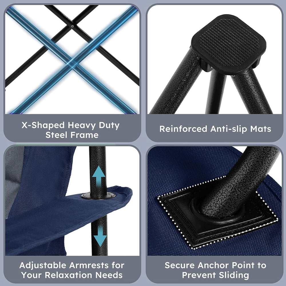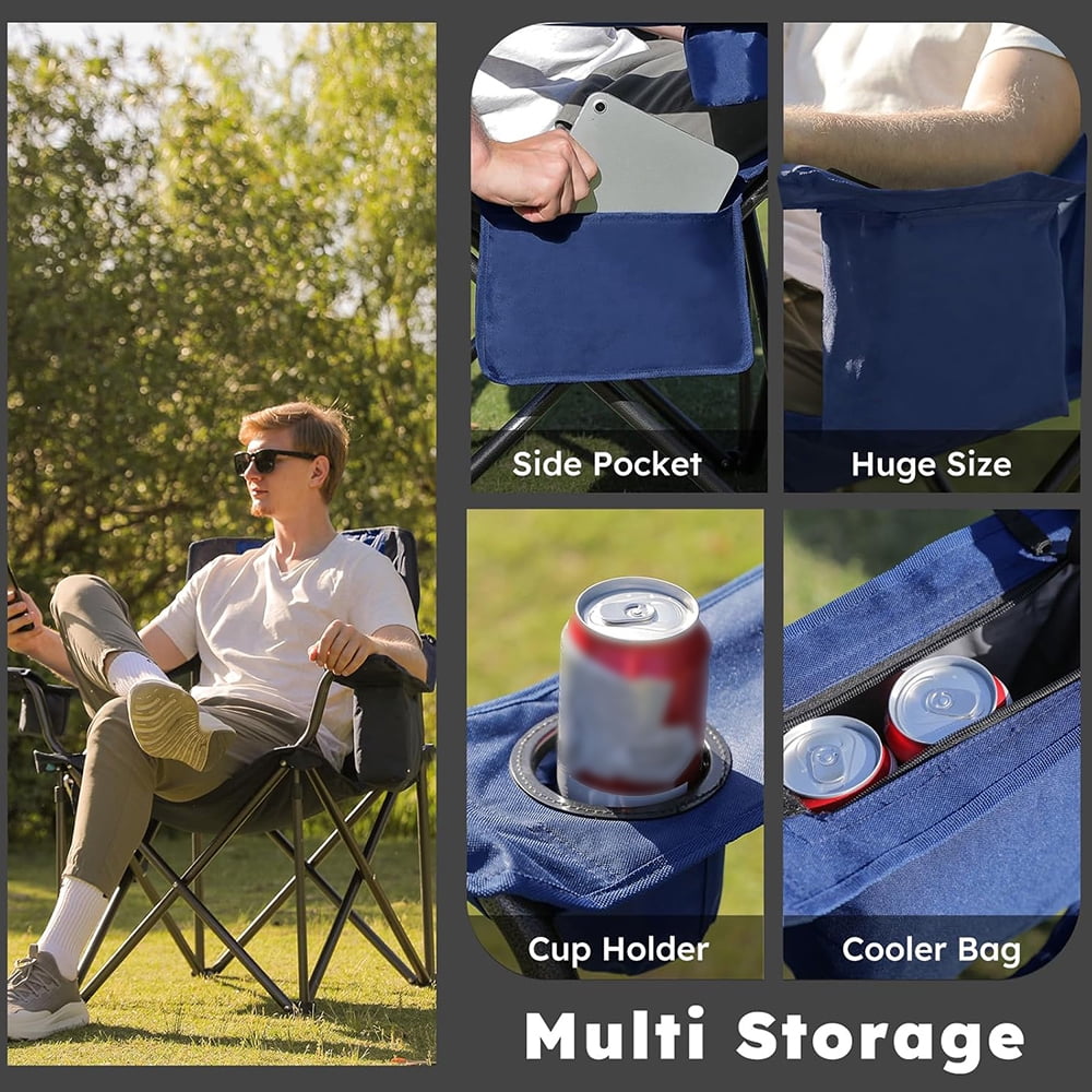 Oversized Camping Outdoor Chair Support 400 LBS Carry Bag Included, Heavy Duty Full Padded Folding Chairs with Lumbar Support, Cooler Bag, Mesh Cup Holder, Pocket for Lawn,Sport(Grey&Navy)
