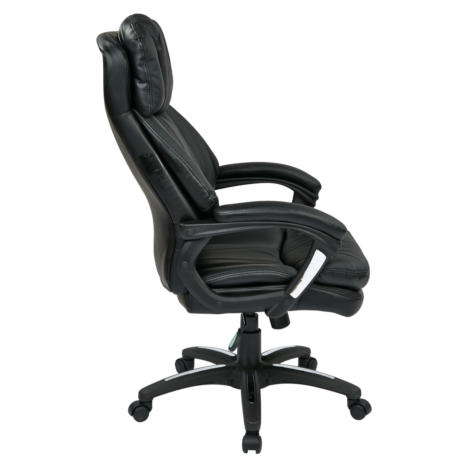 Oversized Black Faux Leather Executive Chair with Padded Loop Arms. This Mid Back Faux Leather Executive Chair is a brilliant combination of elegance and function. Expertly designed with pneumatic height adjustment, built-in lumbar support, and locking tilt control with adjustable tilt tension, this chair can be customized for individual comfort. Comes complete with padded nylon armrests and a heavy-duty nylon base with polished aluminum accents and dual wheel carpet casters. With zero compromises to aesthetics, this Black Faux leather upholstered chair is sure to make a statement in any environment! Features: Faux Leather Seat and Back with Built-in Lumber Support One Touch Pneumatic Seat Height Adjustment Locking Tilt Control with Adjustable Tilt Tension Padded Nylon Arms with Polished Aluminum Accents Dual wheel carpet casters Executive Chair with combination of elegance and function. Arms to Floor Height: 28″ – 31.5″ Specifications: Chair Dimensions: 26″W x 31″D x 46″H Chair Weight: 36 lbs Bed Weight Capacity: 275 lbs Seat Dimensions: 23″W x 21″D x 4″T Seat Height: 18.5″ – 22″ Back Dimensions: 21″W x 29″H x 5″T