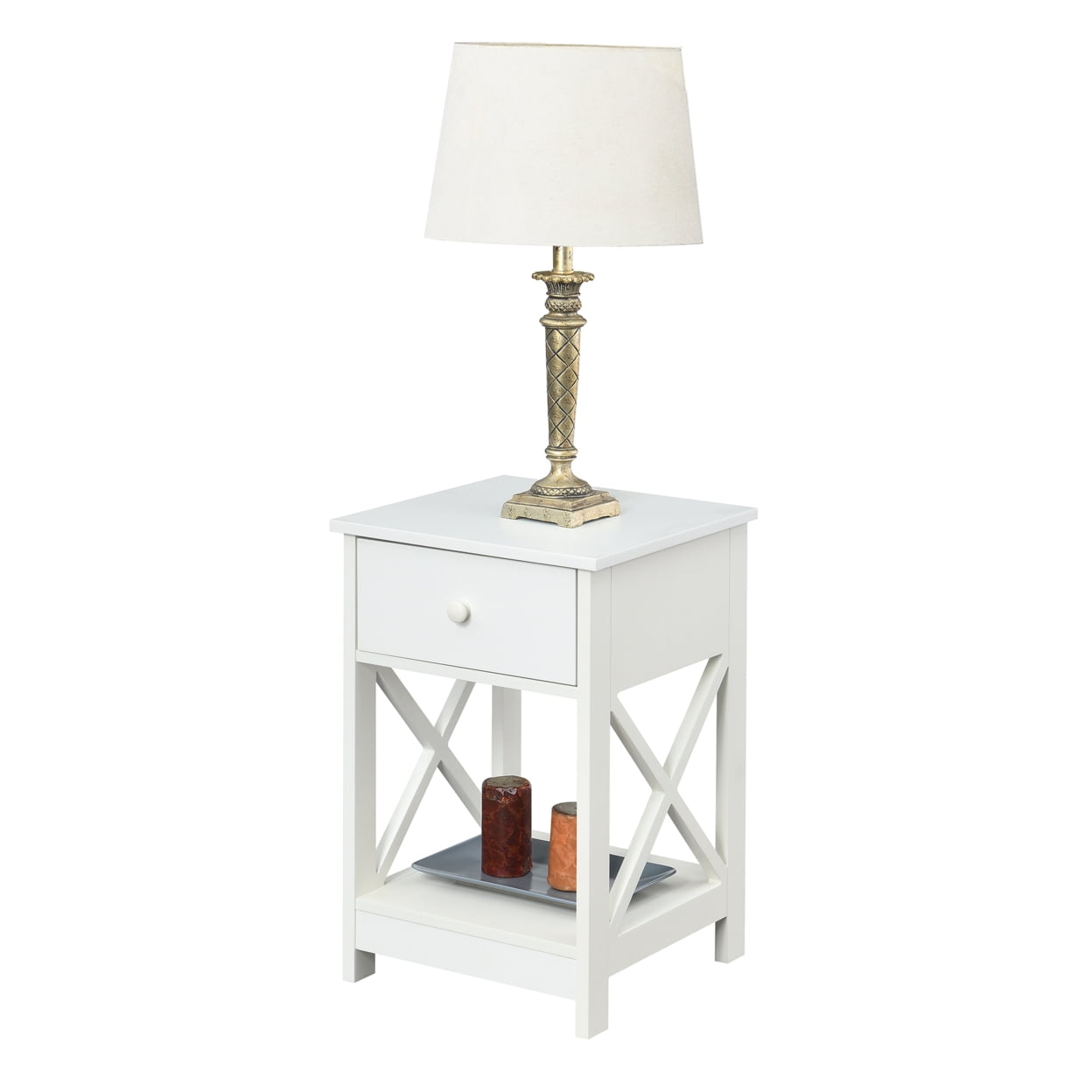 Oxford 1 Drawer End Table, White Make the most out of your living space with the Omega 1 Drawer End Table by Convenience Concepts. Its versatile design will ensure you have everything you need within reach. Showcasing a contemporary style, this table boasts a clean lined silhouette design. In addition to the two tiers of shelving, this table also features a pull out drawer to stow away entertainment essentials. Constructed of MDF and finished with a non lead based paint, this end table is durable with easy maintenance. Shop the complete Oxford Collection by Convenience Concepts, each sold separately. Specifications: Its versatile design will ensure you have everything you need within reach Part of the Oxford Collection Transitional Contemporary Style Constructed of MDF and Non Lead Based Paint Wooden Drawer Knob