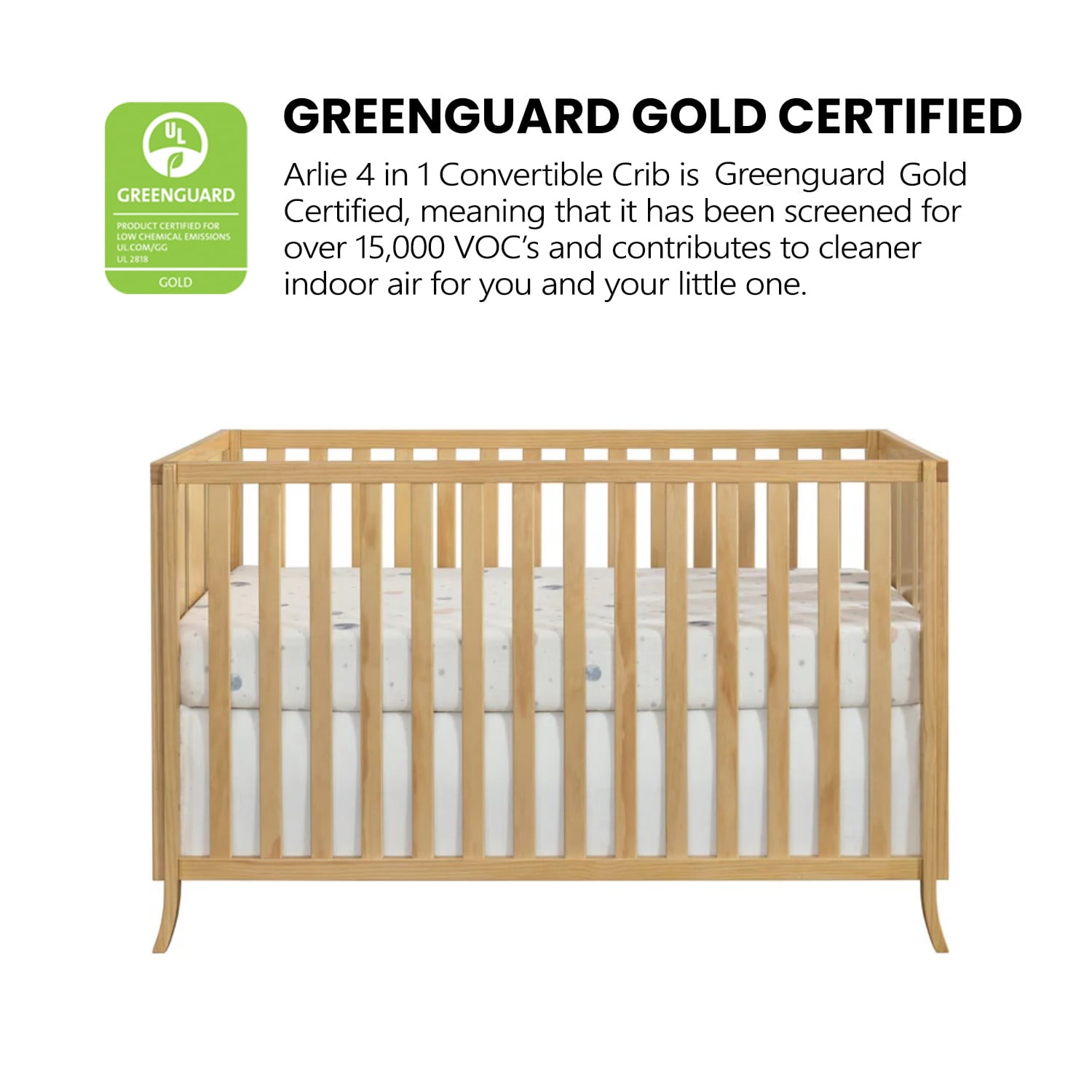 With its simple design, the Greenguard Gold Certified Oxford Baby Arlie 4 in 1 Island Crib adds a unique touch to your nursery. The Arlie crib features curved feet, and wide slats. As a great value add, this crib converts to a toddler bed, day bed and a full- size bed making it last a lifetime.