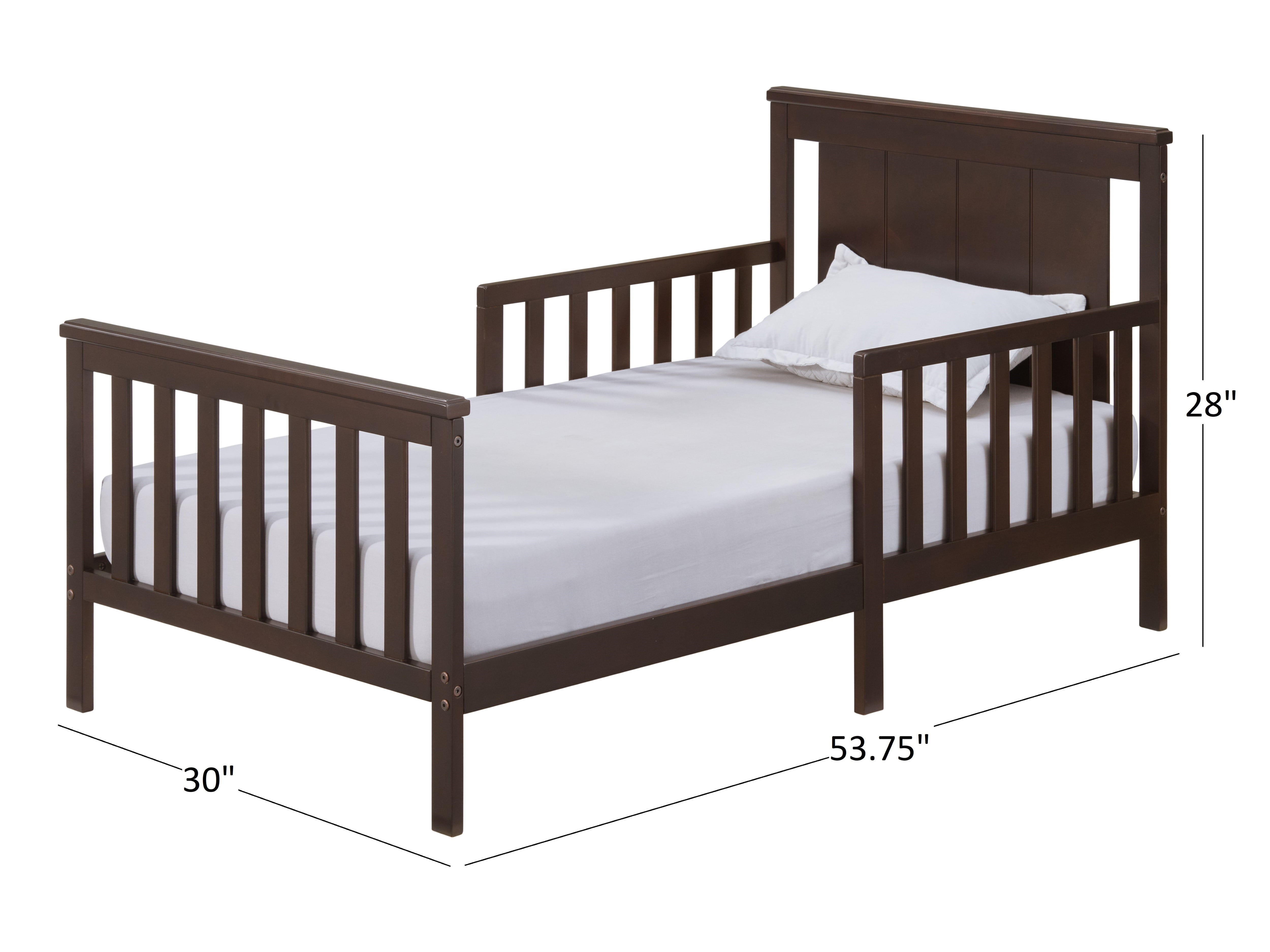 Make the transition from crib to toddler bed easy with the Oxford Baby Lazio Wooden Toddler Bed Toddler Bed features simple clean lines, a flat, full panel straight-line headboard with beautifully refined vertical finishing detail, a smooth to the touch surface, and two guardrails for safety Low to the ground design allows toddler to get in and out of bed easily Designed to fit most standard full-size crib and toddler mattresses, sold separately Available in Snow White, Dove Gray, and Espresso Brown finishes to complement bedroom décor Easy to assemble Assembled Dimensions: 53.75 in. L x 30 in. W x 28 in. H, 25 lbs. Weight Capacity: 50 lbs.