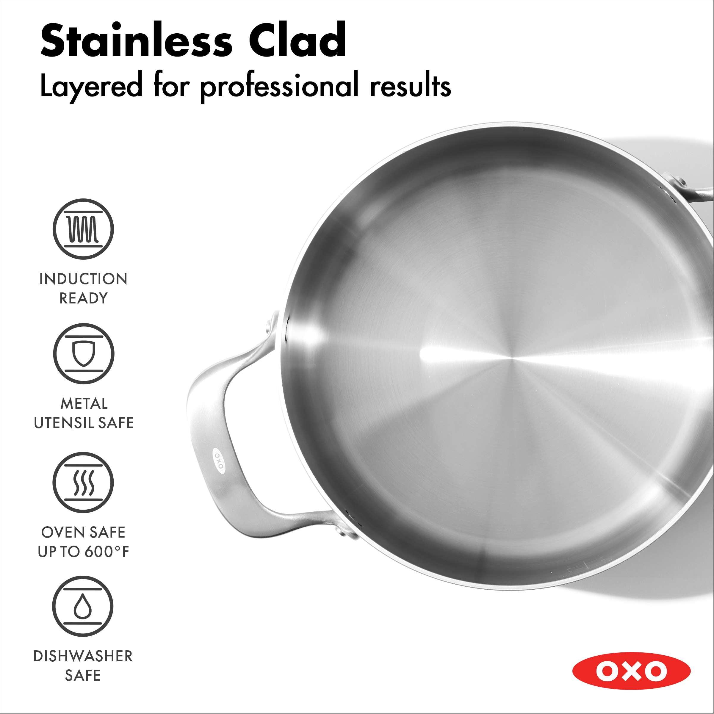 OXO Mira Tri-Ply Stainless Steel 5Qt Stock Pot with Lid, Dishwasher Safe Permanent markings on interior walls assist in measuring stock, water, milk, and other liquid ingredients Clear, tempered glass lid allows for easy monitoring of cooking progress without losing heat Double-duty knob serves as a rest area for tools, keeping your countertop clean Durable, all-metal construction is compatible with all stovetops, including induction Oven safe up to 600˚F; lid safe up to 425˚F Dishwasher safe for quick and easy cleanup