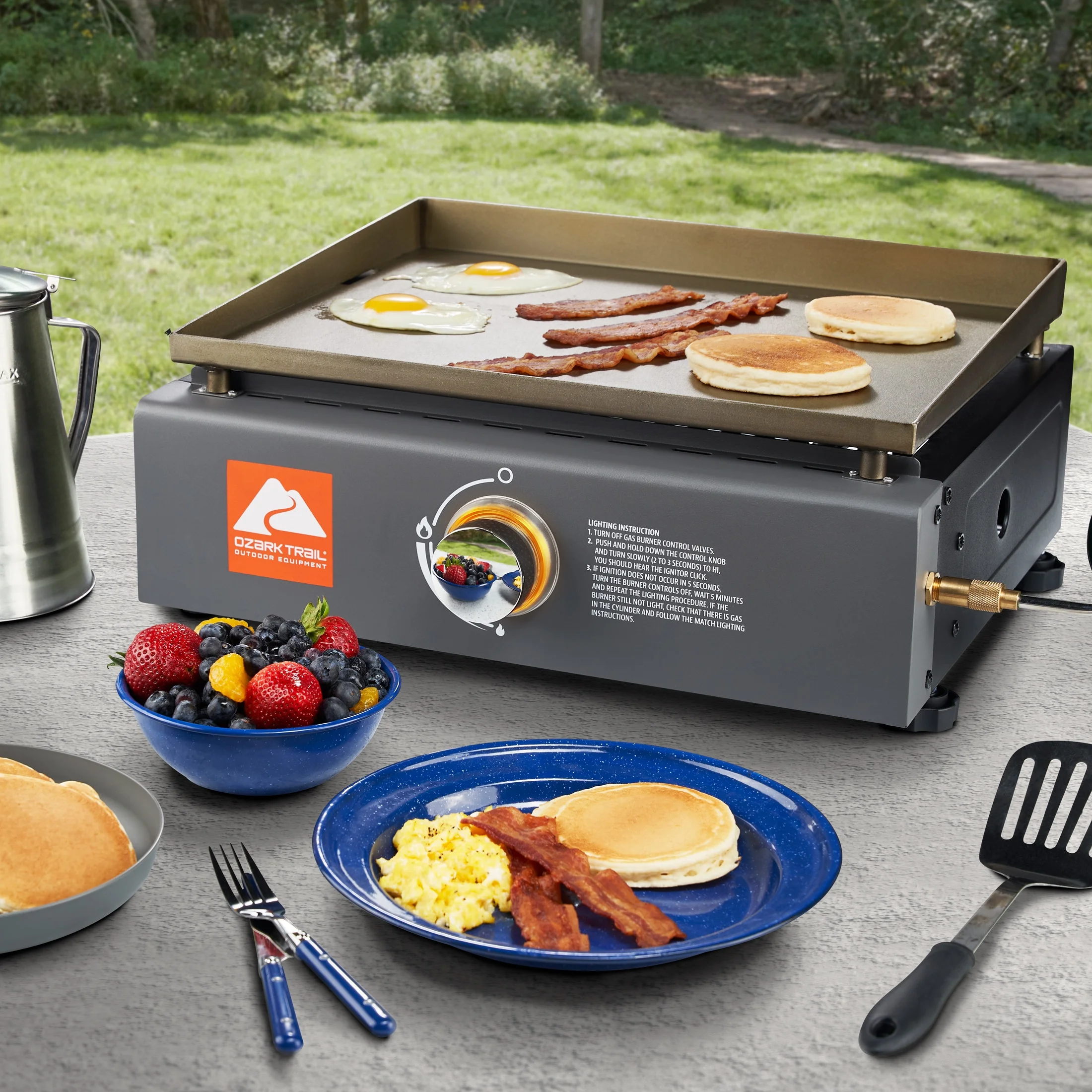 Ozark Trail 1 burner tabletop griddle Uses 1lb liquid propane cylinder Pre-seasoned 3mm cold rolled steel griddle LED lit control knob Easy clean grease cup Rust resistant firebox 18,000 BTU H-shaped burner for even and accurate heating Carry bag included for easy transportation Dimensions: 29.8″ x 16.9″ x 8.9″ (H) Total cooking area 265 sq. in.