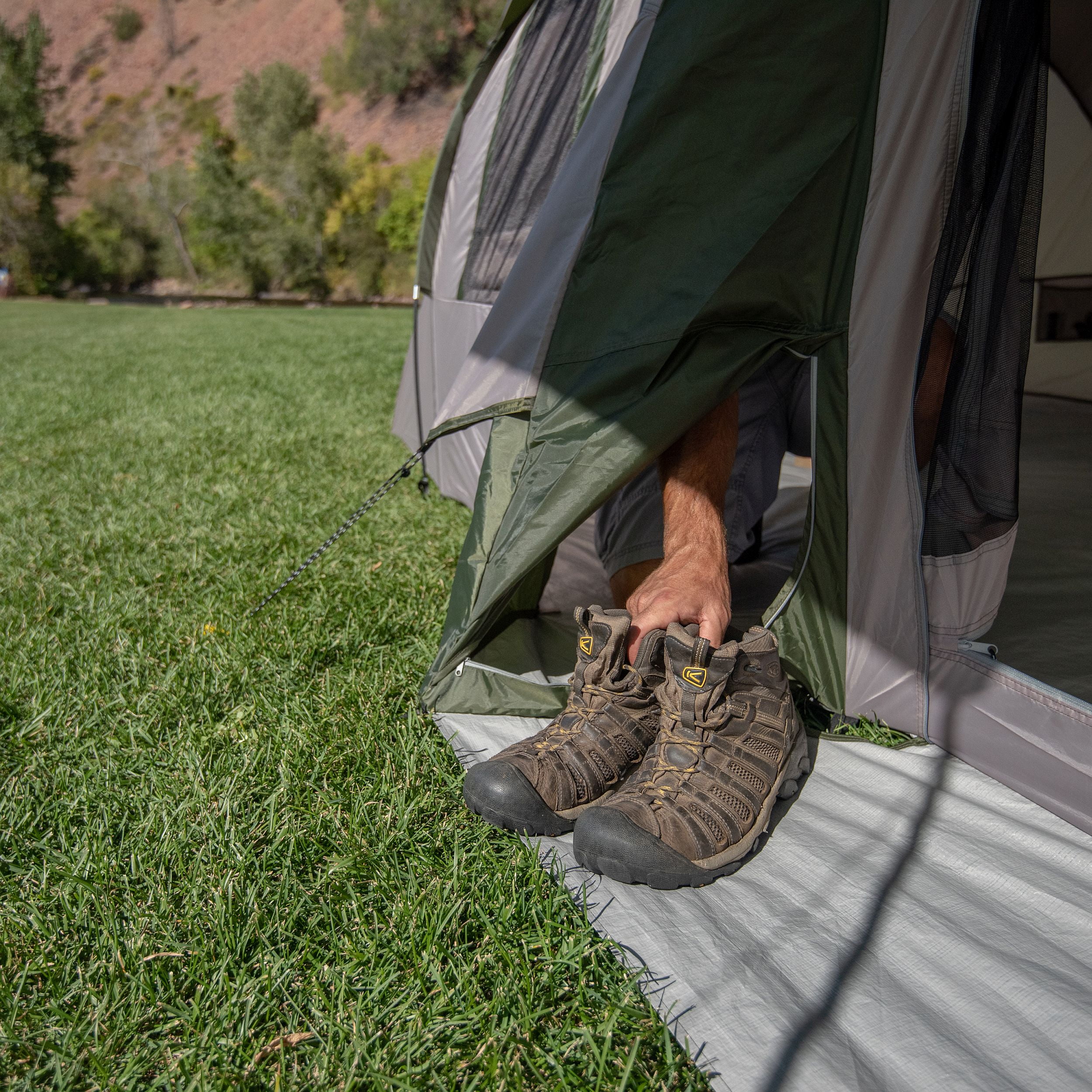 The Ozark Trail 10-Person Vacation Tent with Shade Awning is a home away from home for your family. This oversized tent comfortably sleeps up to 10 people in sleeping bags or fits 3 queen size air beds with room to spare. The 78 in. center height ensures tall campers can stand upright. Two removable room dividers create 3 rooms or 1 large area. The door can be propped open with steel poles to create an awning or zipped closed for weather protection or privacy. Taped seams on the rainfly provide rain protection. An attached mud mat keeps the tent clean while a gear pocket allows you to pull shoes into the tent without unzipping the door. Windows on all sides, 4 vents, and a mesh ceiling provide plenty of ventilation. An E-port for electrical cord access and a media pocket create a central viewing area for your crew. Multiple storage pockets provide space to stow small items. The Ozark Trail 10-Person Vacation Tent with Shade Awning is the ideal tent for your crew’s next camping adventure.